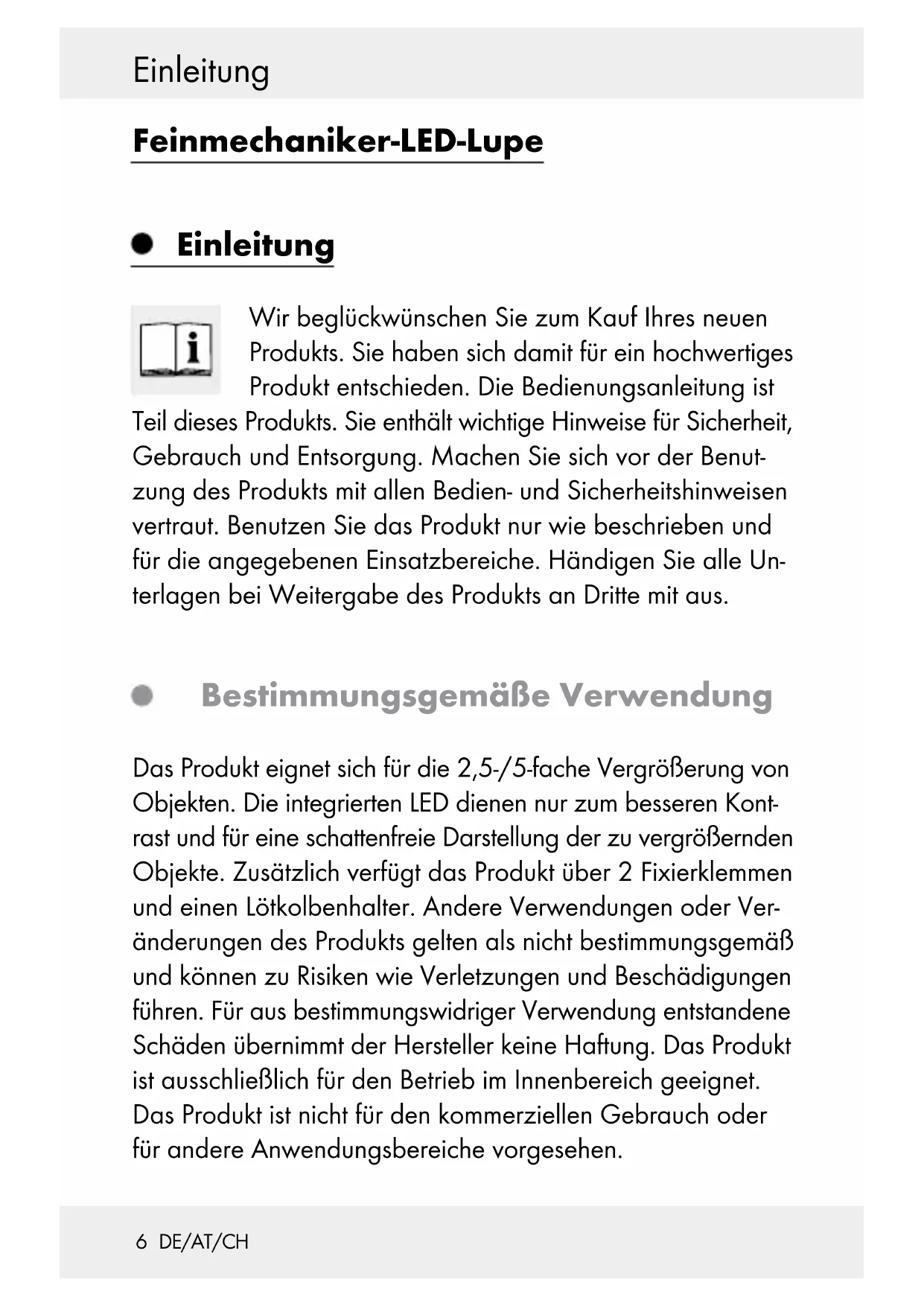 215 DE/AT/CH Inhaltsverzeichnis Einleitung .............................................................. Seite 6 Bestimmungsgemäße Verwendung .........................Seite 6 Teilebeschreibung ....................................................Seite 7 Technische Daten ..................................................... Seite 8 Lieferumfang ............................................................. Seite 8 Sicherheit ..............................................................Seite 9 Allgemeine Sicherheitshinweise ..............................Seite 9 Sicherheitshinweise zu den Batterien ......................Seite 10 Vor der Inbetriebnahme .........................Seite 12 Batterien einsetzen ................................................... Seite 12 Reparaturvorrichtung anbringen .............................Seite 12 Lupe montieren ......................................................... Seite 12 Gebrauch ..............................................................Seite 13 Verwendung der LED-Feinmechaniker-Lupe ...........Seite 13 Batterien wechseln ...................................................Seite 13 Fehler beheben ...............................................Seite 14 Reinigung und Pflege .................................Seite 14 Entsorgung .......................................................... Seite 156 DE/AT/CH Einleitung Feinmechaniker-LED-Lupe Einleitung Wir beglückwünschen Sie zum Kauf Ihres neuen Produkts. Sie haben sich damit für ein hochwertiges Produkt entschieden. Die Bedienungsanleitung ist Teil dieses Produkts. Sie enthält wichtige Hinweise für Sicherheit, Gebrauch und Entsorgung. Machen Sie sich vor der Benut- zung des Produkts mit allen Bedien- und Sicherheitshinweisen vertraut. Benutzen Sie das Produkt nur wie beschrieben und für die angegebenen Einsatzbereiche. Händigen Sie alle Un- terlagen bei Weitergabe des Produkts an Dritte mit aus. Bestimmungsgemäße Verwendung Das Produkt eignet sich für die 2,5-/5-fache Vergrößerung von Objekten. Die integrierten LED dienen nur zum besseren Kont- rast und für eine schattenfreie Darstellung der zu vergrößernden Objekte. Zusätzlich verfügt das Produkt über 2 Fixierklemmen und einen Lötkolbenhalter. Andere Verwendungen oder Ver- änderungen des Produkts gelten als nicht bestimmungsgemäß und können zu Risiken wie Verletzungen und Beschädigungen führen. Für aus bestimmungswidriger Verwendung entstandene Schäden übernimmt der Hersteller keine Haftung. Das Produkt ist ausschließlich für den Betrieb im Innenbereich geeignet. Das Produkt ist nicht für den kommerziellen Gebrauch oder für andere Anwendungsbereiche vorgesehen.7 DE/AT/CH Einleitung Dieses Produkt ist nicht zur Raum beleuchtung im Haushalt geeignet. Teilebeschreibung