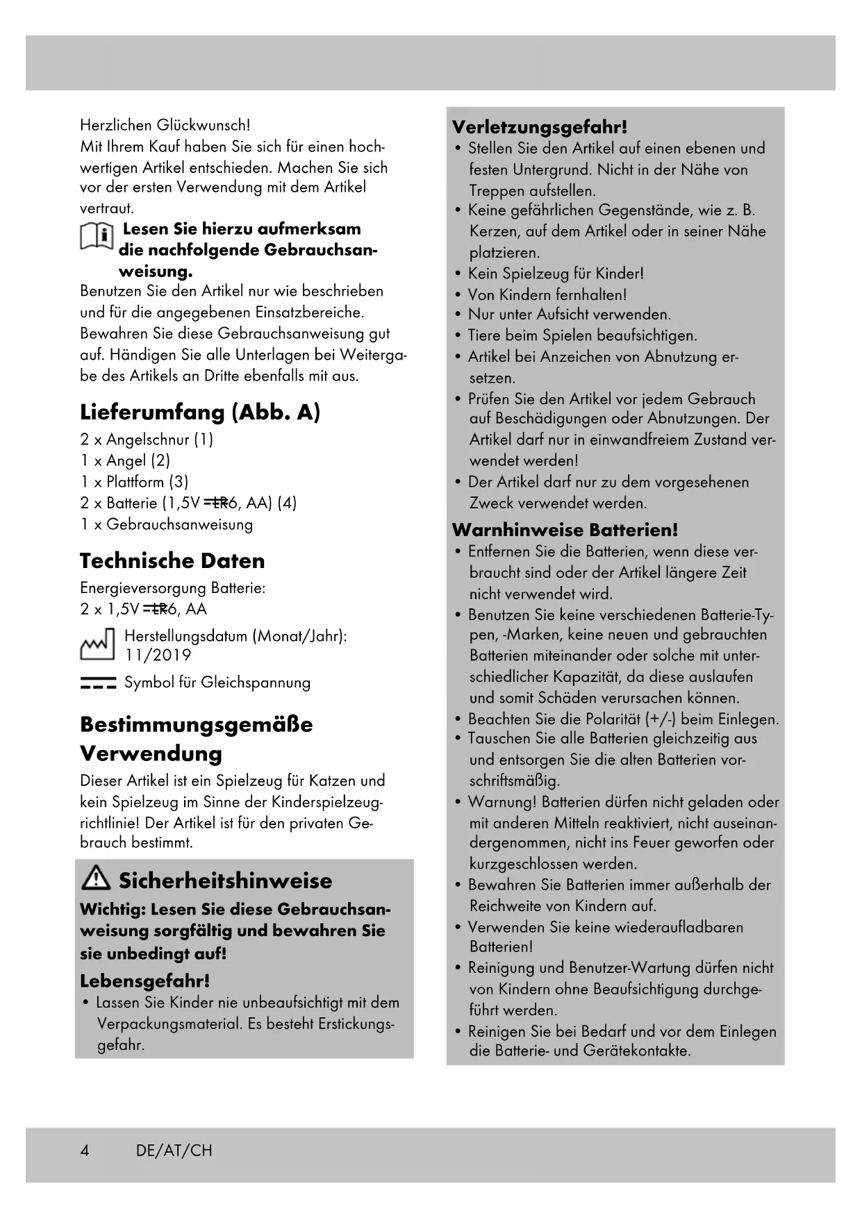 Herzlichen Glückwunsch! Mit Ihrem Kauf haben Sie sich für einen hoch- wertigen Artikel entschieden. Machen Sie sich vor der ersten Verwendung mit dem Artikel vertraut. Lesen Sie hierzu aufmerksam die nachfolgende Gebrauchsan- weisung. Benutzen Sie den Artikel nur wie beschrieben und für die angegebenen Einsatzbereiche. Bewahren Sie diese Gebrauchsanweisung gut auf. Händigen Sie alle Unterlagen bei Weiterga- be des Artikels an Dritte ebenfalls mit aus. Lieferumfang (Abb. A) 2 x Angelschnur (1) 1 x Angel (2) 1 x Plattform (3) 2 x Batterie (1,5V LR6, AA) (4) 1 x Gebrauchsanweisung Technische Daten Energieversorgung Batterie: 2 x 1,5V LR6, AA Herstellungsdatum (Monat/Jahr): 11/2019 Symbol für Gleichspannung Bestimmungsgemäße Verwendung Dieser Artikel ist ein Spielzeug für Katzen und kein Spielzeug im Sinne der Kinderspielzeug- richtlinie! Der Artikel ist für den privaten Ge- brauch bestimmt. Sicherheitshinweise Wichtig: Lesen Sie diese Gebrauchsan- weisung sorgfältig und bewahren Sie sie unbedingt auf! Lebensgefahr!