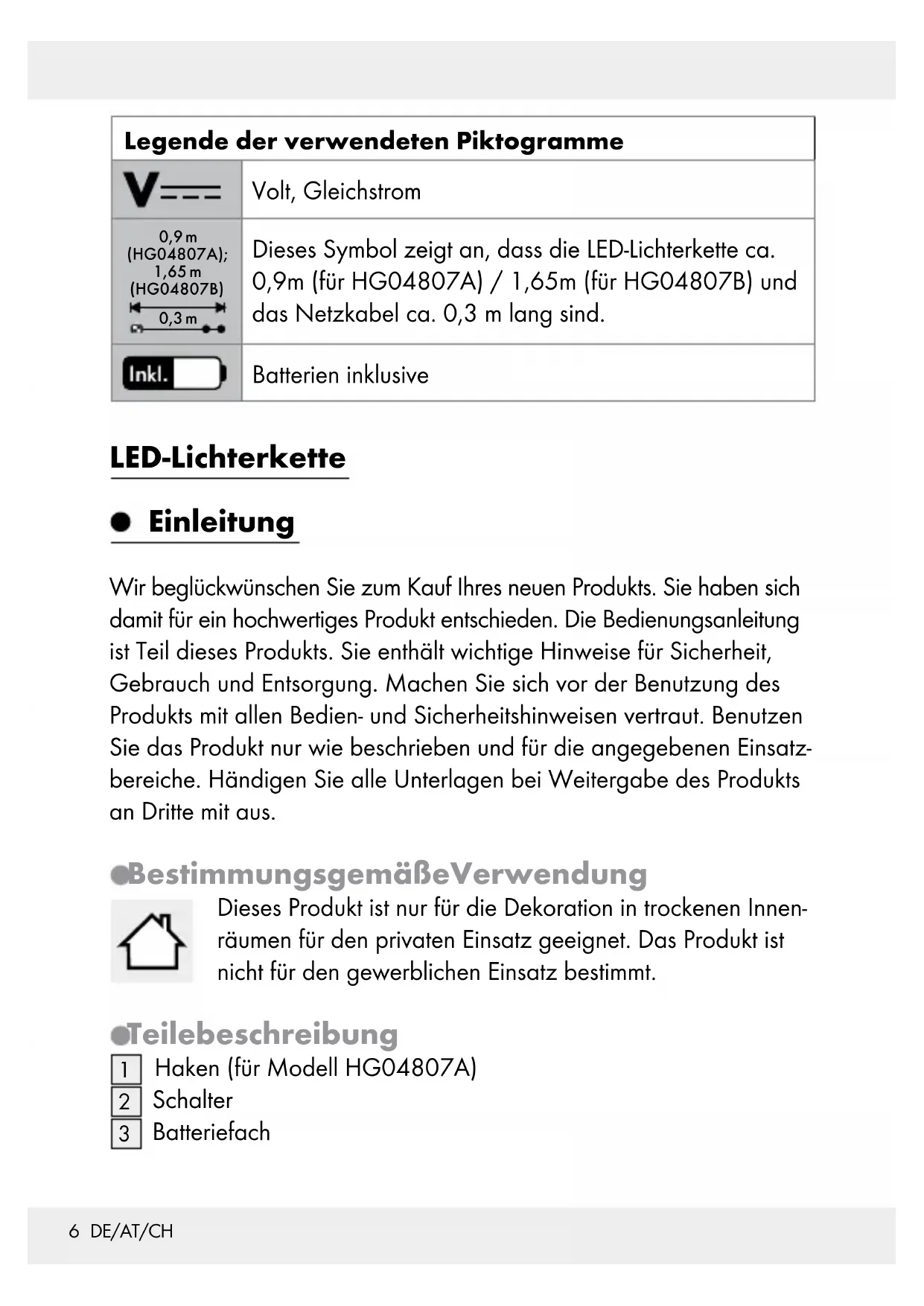 35 DE/AT/CH Legende der verwendeten Piktogramme ................................................................... Seite 6 Einleitung ............................................................................. Seite 6 Bestimmungsgemäße Verwendung ........................................ Seite 6 Teilebeschreibung ................................................................... Seite 6 Technische Daten .................................................................... Seite 7 Lieferumfang ............................................................................ Seite 7 Sicherheitshinweise .................................................... Seite 7 Sicherheitshinweise für Batterien / Akkus ............................... Seite 8 Inbetriebnahme ............................................................. Seite 10 Batterien einlegen / wechseln ................................................. Seite 10 EIN- / TIMER- / AUS-Funktion .................................................. Seite 10 Reinigung und Pflege ................................................ Seite 10 Entsorgung ......................................................................... Seite 11 Garantie ............................................................................... Seite 126 DE/AT/CH Legende der verwendeten Piktogramme Volt, Gleichstrom 0,9 m (HG04807A); 1,65 m (HG04807B) 0,3 m Dieses Symbol zeigt an, dass die LED-Lichterkette ca. 0,9m (für HG04807A) / 1,65m (für HG04807B) und das Netzkabel ca. 0,3 m lang sind. Batterien inklusive LED-Lichterkette Einleitung Wir beglückwünschen Sie zum Kauf Ihres neuen Produkts. Sie haben sich damit für ein hochwertiges Produkt entschieden. Die Bedienungsanleitung ist Teil dieses Produkts. Sie enthält wichtige Hinweise für Sicherheit, Gebrauch und Entsorgung. Machen Sie sich vor der Benutzung des Produkts mit allen Bedien- und Sicherheitshinweisen vertraut. Benutzen Sie das Produkt nur wie beschrieben und für die angegebenen Einsatz- bereiche. Händigen Sie alle Unterlagen bei Weitergabe des Produkts an Dritte mit aus. Bestimmungsgemäße Verwendung Dieses Produkt ist nur für die Dekoration in trockenen Innen- räumen für den privaten Einsatz geeignet. Das Produkt ist nicht für den gewerblichen Einsatz bestimmt. Teilebeschreibung