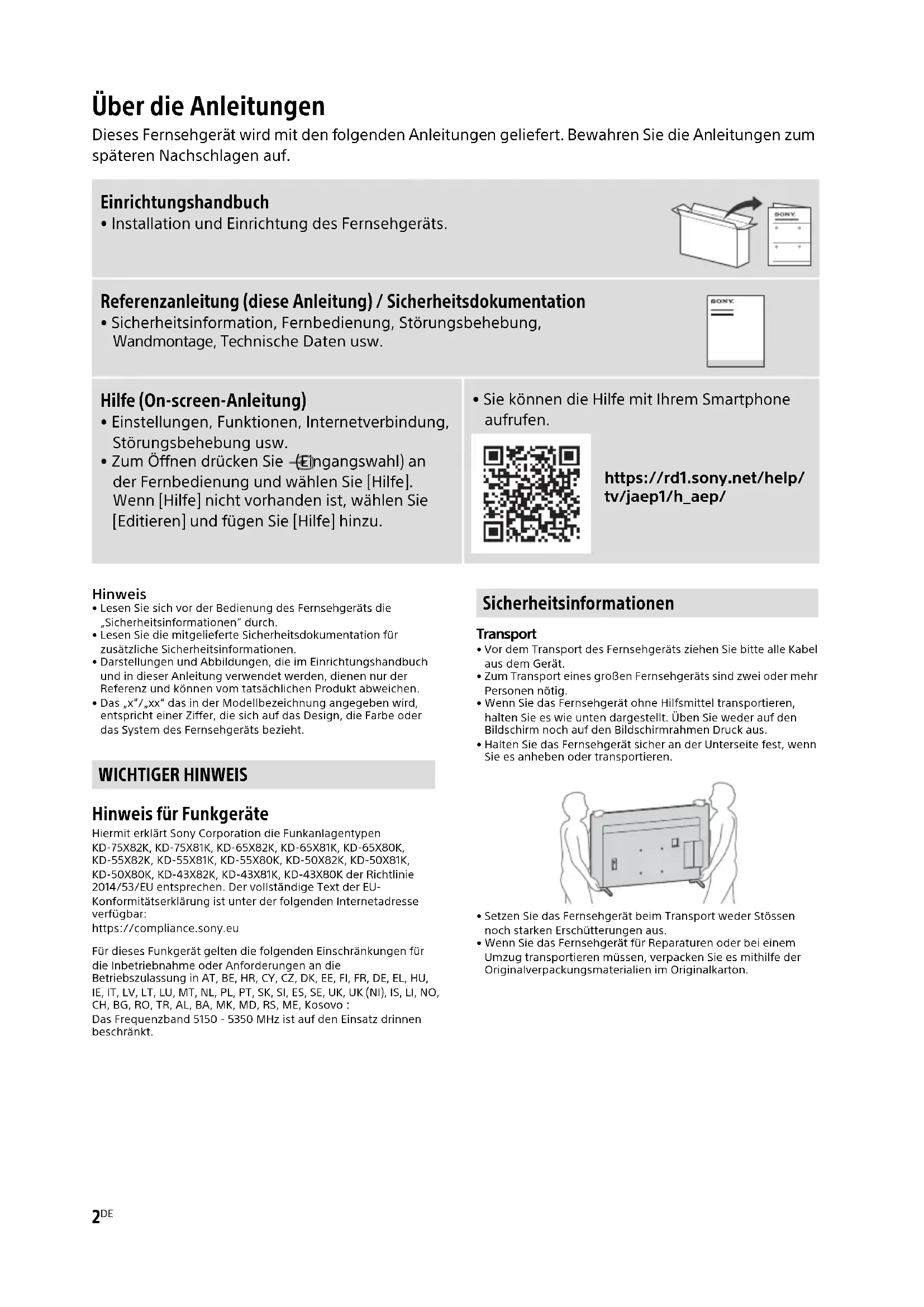 - Sie können die Hilfe mit Ihrem Smartphone aufrufen. https://rd1.sony.net/help/ tv/jaep1/h_aep/ WICHTIGER HINWEIS Sicherheitsinformationen3