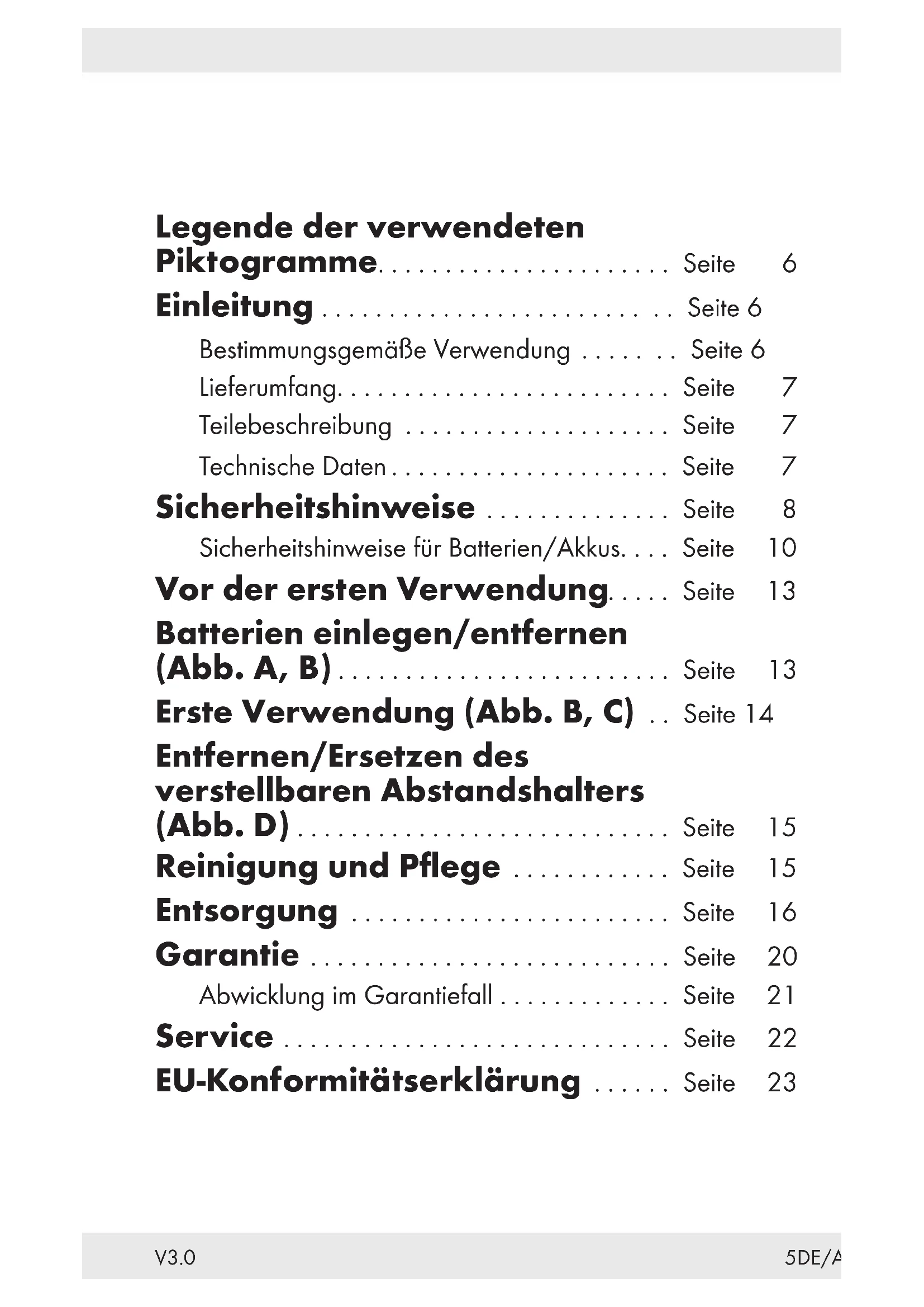 0DE5DE/AT/CH V3.0 Legende der verwendeten Piktogramme.................... . . Seite 6 Einleitung ........................ . . Seite 6 Bestimmungsgemäße Verwendung ..... . . Seite 6 Lieferumfang....................... . . Seite 7 Teilebeschreibung .................. . . Seite 7 Technische Daten ................... . . Seite 7 Sicherheitshinweise ............ . . Seite 8 Sicherheitshinweise für Batterien/Akkus.. . . Seite 10 Vor der ersten Verwendung... . . Seite 13 Batterien einlegen/entfernen (Abb. A,B) ....................... . . Seite 13 Erste Verwendung (Abb. B, C) . . Seite 14 Entfernen/Ersetzen des verstellbaren Abstandshalters (Abb. D) .......................... . . Seite 15 Reinigung und Pflege .......... . . Seite 15 Entsorgung ...................... . . Seite 16 Garantie ......................... . . Seite 20 Abwicklung im Garantiefall ........... . . Seite 21 Service ........................... . . Seite 22 EU-Konformitätserklärung .... . . Seite 236 DE/AT/CH Legende der verwendeten Piktogramme Gleichstrom/-spannung Batterien mitgeliefert Das CE-Zeichen bestätigt Konformität mit den für das Produkt zutreffenden EU-Richtlinien. FUSSELRASIERER Einleitung Wir beglückwünschen Sie zum Kauf Ihres neuen Produkts. Sie haben sich damit für ein hochwertiges Produkt entschieden. Die Bedienungsanleitung ist Teil dieses Produkts. Sie enthält wichtige Hinweise für Sicherheit, Gebrauch und Entsorgung. Machen Sie sich vor der Benutzung des Produkts mit allen Bedien- und Sicherheitshinweisen vertraut. Benutzen Sie das Produkt nur wie beschrieben und für die angegebenen Einsatzbereiche. Händigen Sie alle Unterlagen bei Weitergabe des Produkts an Dritte mit aus. Bestimmungsgemäße Verwendung Dieses Produkt ist zur Entfernung von Knoten und Fusseln von Kleidungsstücken oder Möbeln vorgesehen. Dieses Produkt darf nicht auf anderen Oberflächen wie Haut, Holz, Kunststoff oder Metall verwendet werden.7DE/AT/CH Das Produkt ist nur zur Verwendung in privaten Haushalten bestimmt und darf nicht zur gewerblichen Nutzung verwendet werden. Der Hersteller übernimmt keine Haftung für Schäden aufgrund unsachgemäßer Verwendung. Lieferumfang 1 Fusselrasierer 1 Kurzanleitung 1 Reinigungspinsel 2 Batterien, Typ AA (LR6) 1 Schutzkappe Teilebeschreibung [1] EIN-/AUS-Schalter [2] Batterien [3] Batteriefach-Abdeckung [4] Reinigungspinsel [5] Fussel-Behälter [6] Schutzkappe [7] Verstellbarer Abstandshalter [8] Gleitstück [9] Schneidklingen [] Batteriefach Technische Daten Spannung: 3 V Nennstrom: 0,8 A Batterien: 2 x 1,5 V , AA (LR6) Schalldruck-Emissionen: < 70 dB(A) K = 3 dB8 DE/AT/CH Sicherheitshinweise