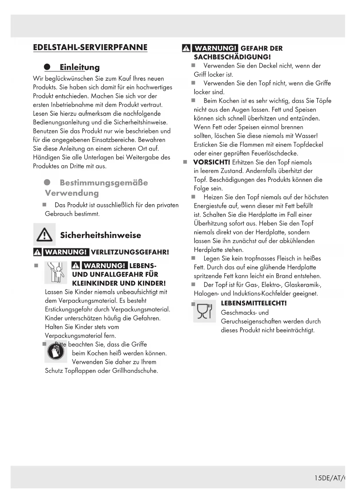 LEBENSMITTELECHT! Geschmacks- und Geruchseigenschaften werden durch dieses Produkt nicht beeinträchtigt.16 DE/AT/CH ACHTUNG! Zerbrechlich, nicht stoßfest! Sparen Sie Energie! Wählen Sie die dem Durchmesser des Topfbodens entsprechende Kochstelle aus, um einen Hitzeverlust zu vermeiden. Topftyp Wirksamer Bodendurchmesser (ca.) Bratentopf: Ø 240 mm ACHTUNG! KRATZER! Vermeiden Sie das Hin- und Herschieben des Kochgeschirrs auf Glaskeramik-Kochfeldern! Bevor Sie mit dem Kochen beginnen, empfehlen wir Ihnen, die Oberfläche des Kochfelds und den Boden des Kochgeschirrs mit einem sauberen, fusselfreien Tuch (zum Beispiel Mikrofaser) abzuwischen. Dadurch können Sie Kratzern vorbeugen. Geben Sie kein Salz bzw. Salzwasser in das vorgewärmte leere Produkt, da dies zu Korrosion führen könnte. Eine Minderung der Leistung des Produktes wäre dadurch übrigens nicht zu erwarten. Das heiße Produkt niemals unter laufendes kaltes Wasser halten. Die Unterseite des Produkts könnte dadurch beschädigt werden oder vom Produkt abfallen. Hinweis für Induktionskochfelder Hinweis: Unter bestimmten Umständen kann ein Geräusch auftreten, dass auf die elektromagnetischen Eigenschaften der Heizquelle und des Topfs / der Pfanne zurückzuführen ist. Dies ist normal und deutet nicht auf einen Defekt Ihres Induktionskochfeldes oder des Kochgeschirrs hin. Der Topf / die Pfanne ist mittig auf dem Induktionskochfeld zu platzieren. ACHTUNG! Hohe Aufheizgeschwindigkeit! Kochgeschirr beim Vorheizen nicht überhitzen. Im Fall einer Überhitzung muss der Raum gründlich gelüftet werden. Gebrauch Kochen Sie den Topf vor dem ersten Gebrauch 2 bis 3 mal mit Wasser aus, um eventuelle Produktionsrückstände vollständig zu entfernen. Edelstahltöpfe mit Glasdeckel sind für den Ofen geeignet. – Glasdeckel hitzebeständig bis 180 °C. – Edelstahltöpfe hitzebeständig bis 250 °C. Reinigung und Pflege Reinigen Sie den Topf mit heißem Wasser und handelsüblichem Spülmittel.