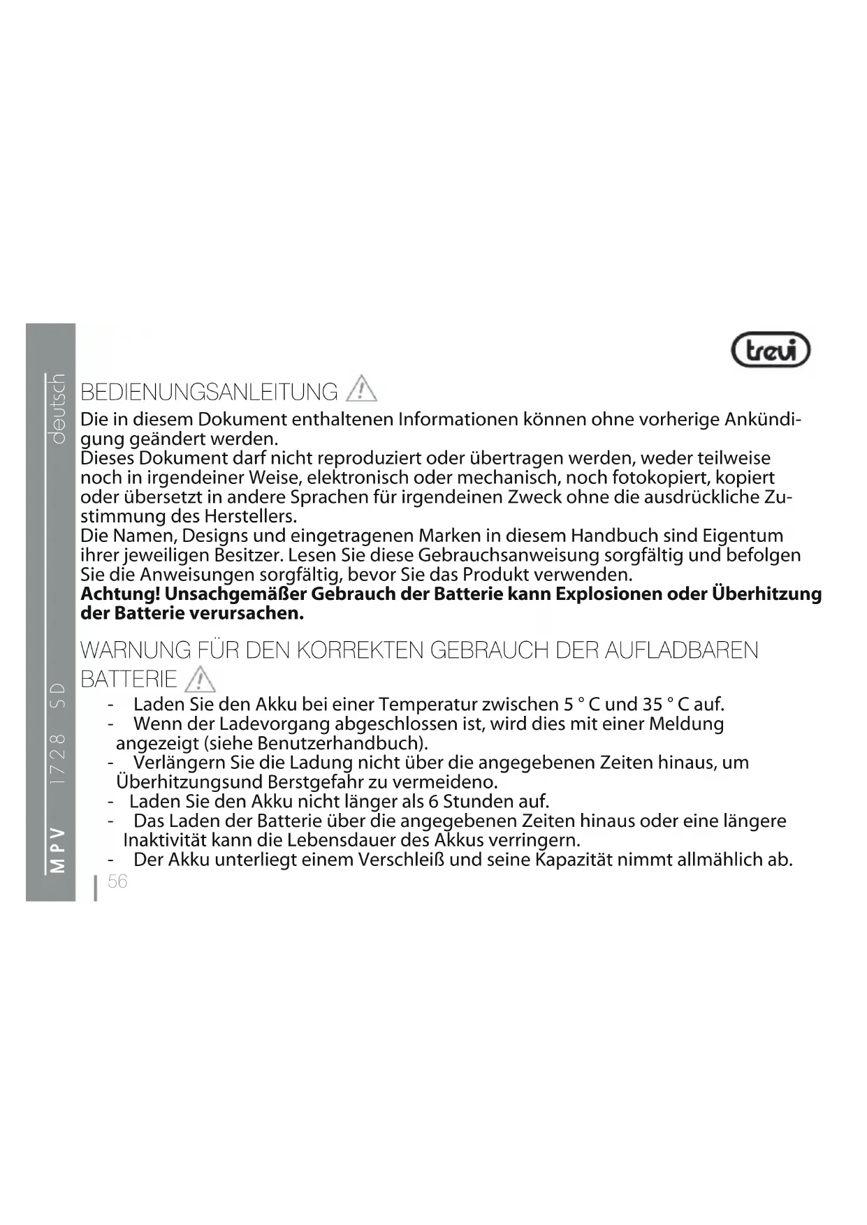 deutsch BEDIENUNGSANLEITUNG DieindiesemDokumententhaltenenInformationenkönnenohnevorherigeAnkündi- gung geändert werden. DiesesDokumentdarfnichtreproduziertoderübertragenwerden,wederteilweise nochinirgendeinerWeise,elektronischodermechanisch,nochfotokopiert,kopiert oderübersetztinandereSprachenfürirgendeinenZweckohnedieausdrücklicheZu- stimmung des Herstellers. DieNamen,DesignsundeingetragenenMarkenindiesemHandbuchsindEigentum ihrerjeweiligenBesitzer.LesenSiedieseGebrauchsanweisungsorgfältigundbefolgen SiedieAnweisungensorgfältig,bevorSiedasProduktverwenden. Achtung! Unsachgemäßer Gebrauch der Batterie kann Explosionen oder Überhitzung der Batterie verursachen. WARNUNG FÜR DEN KORREKTEN GEBRAUCH DER AUFLADBAREN BATTERIE - LadenSiedenAkkubeieinerTemperaturzwischen5°Cund35°Cauf. - WennderLadevorgangabgeschlossenist,wirddiesmiteinerMeldung angezeigt (siehe Benutzerhandbuch). - VerlängernSiedieLadungnichtüberdieangegebenenZeitenhinaus,um Überhitzungsund Berstgefahr zu vermeideno. - LadenSiedenAkkunichtlängerals6Stundenauf. - DasLadenderBatterieüberdieangegebenenZeitenhinausodereinelängere InaktivitätkanndieLebensdauerdesAkkusverringern. - DerAkkuunterliegteinemVerschleißundseineKapazitätnimmtallmählichab.57 MPV 1728 SD deutsch - Um die Lebensdauer der Batterie zu verlängern, verwenden Sie sie bei voller Ladung, bis sie vollständig entladen ist, und laden Sie sie dann vollständig auf, bevorSiesieerneutverwenden.DurchdasAuadeneinerBatterie,dienicht vollständigverbrauchtist,wirdihreLebensdauerverkürzt.WiederholenSiein diesemFallmehrmalsdengesamtenLade-/Entladezyklus. - VermeidenSiees,dieBatterieüberNachtunterLastzuhalten.