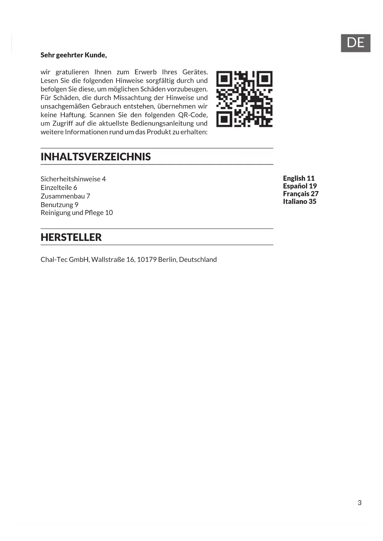 Sehr geehrter Kunde, wir gratulieren Ihnen zum Erwerb Ihres Gerätes. Lesen Sie die folgenden Hinweise sorgfältig durch und befolgen Sie diese, um möglichen Schäden vorzubeugen. Für Schäden, die durch Missachtung der Hinweise und unsachgemäßen Gebrauch entstehen, übernehmen wir keine Haftung. Scannen Sie den folgenden QR-Code, um Zugriff auf die aktuellste Bedienungsanleitung und weitere Informationen rund um das Produkt zu erhalten: INHALTSVERZEICHNIS Sicherheitshinweise 4 Einzelteile 6 Zusammenbau 7 Benutzung 9 Reinigung und Pege 10 HERSTELLER Chal-Tec GmbH, Wallstraße 16, 10179 Berlin, Deutschland English 11 Español 19 Français 27 Italiano 354