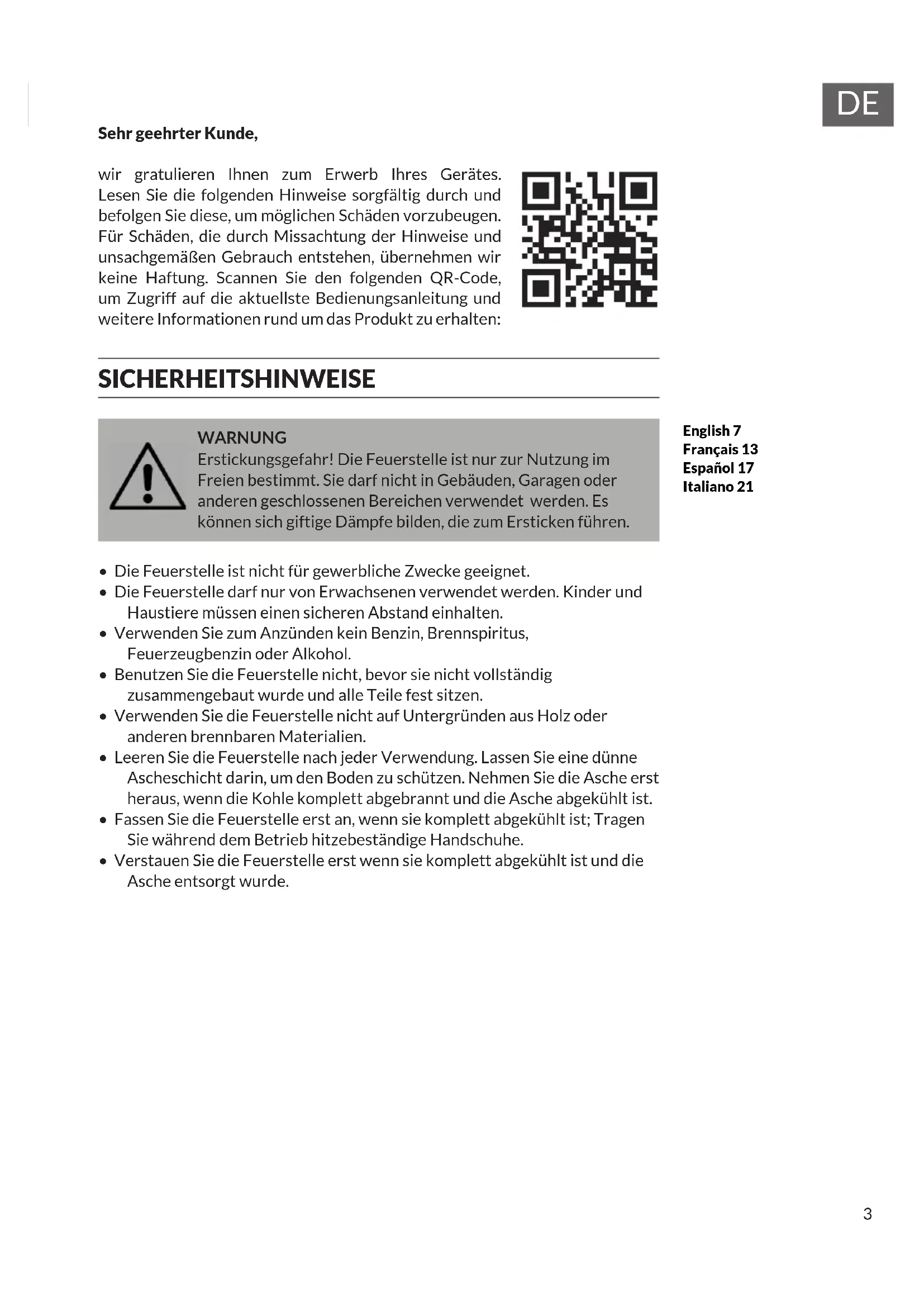 Sehr geehrter Kunde, wir gratulieren Ihnen zum Erwerb Ihres Gerätes. Lesen Sie die folgenden Hinweise sorgfältig durch und befolgen Sie diese, um möglichen Schäden vorzubeugen. Für Schäden, die durch Missachtung der Hinweise und unsachgemäßen Gebrauch entstehen, übernehmen wir keine Haftung. Scannen Sie den folgenden QR-Code, um Zugriff auf die aktuellste Bedienungsanleitung und weitere Informationen rund um das Produkt zu erhalten: SICHERHEITSHINWEISE WARNUNG Erstickungsgefahr! Die Feuerstelle ist nur zur Nutzung im Freien bestimmt. Sie darf nicht in Gebäuden, Garagen oder anderen geschlossenen Bereichen verwendet werden. Es können sich giftige Dämpfe bilden, die zum Ersticken führen.