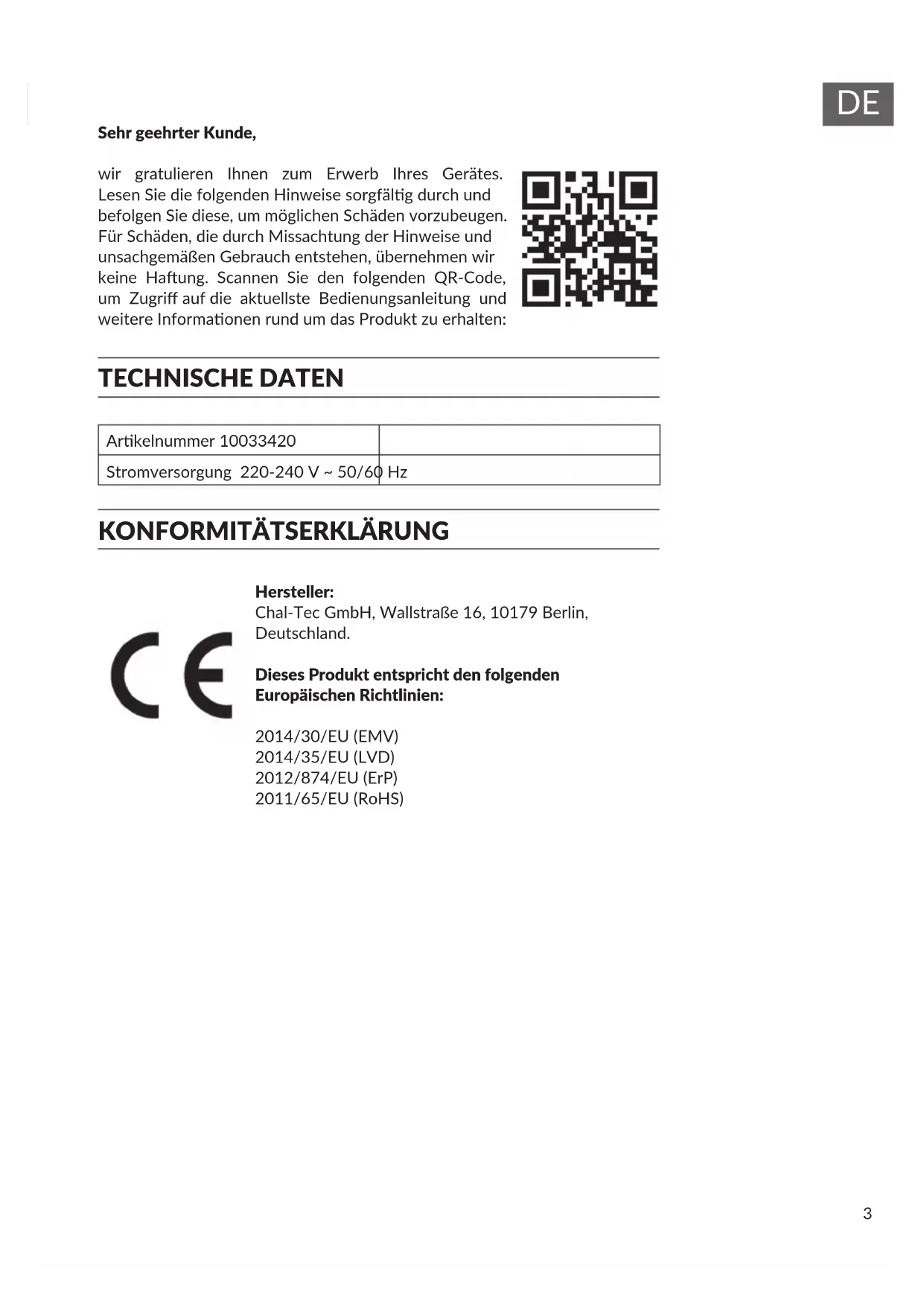 Hersteller: Chal-Tec GmbH, Wallstraße 16, 10179 Berlin, Deutschland. Dieses Produkt entspricht den folgenden Europäischen Richtlinien: 2014/30/EU (EMV) 2014/35/EU (LVD) 2012/874/EU (ErP) 2011/65/EU (RoHS)4