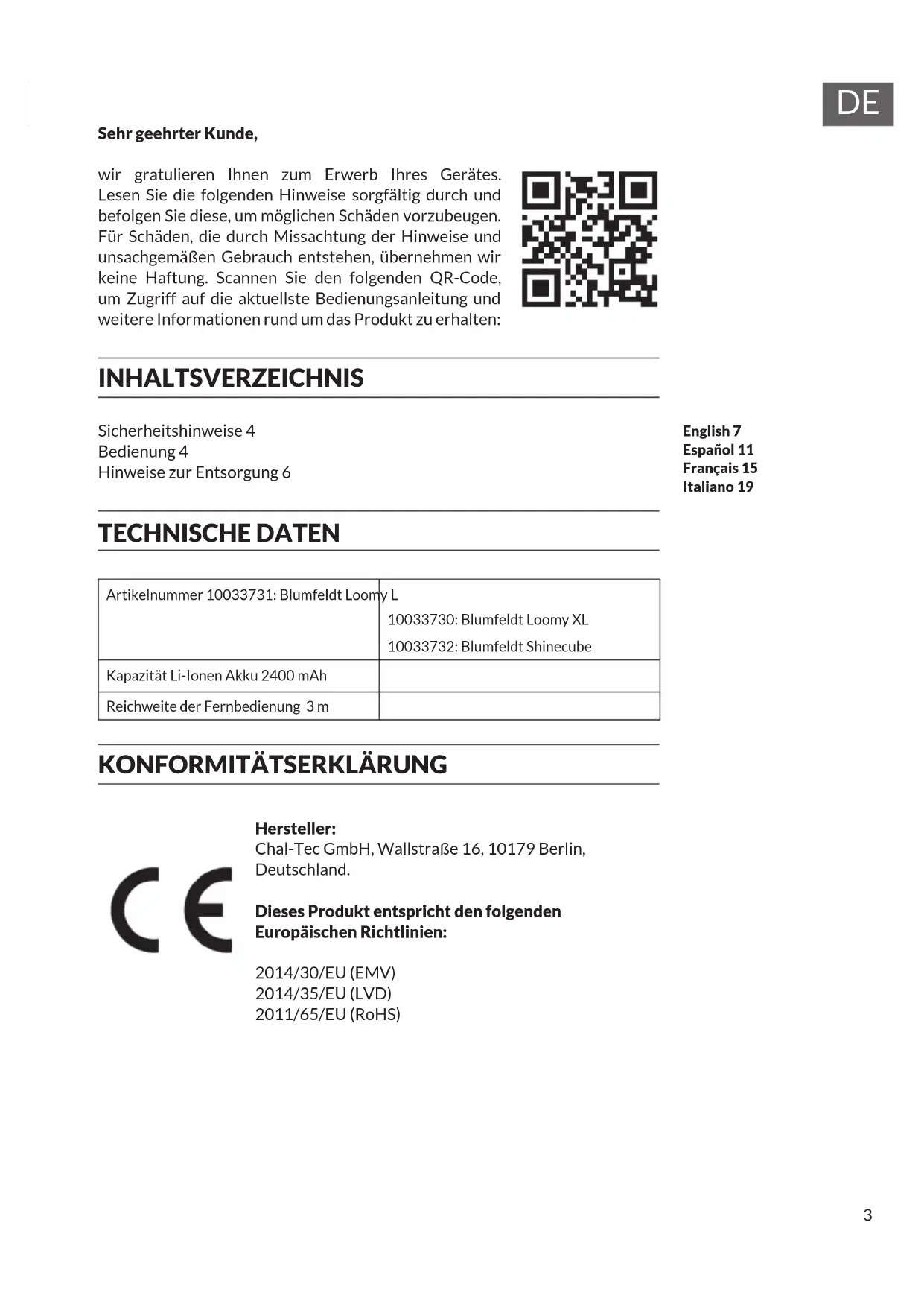 Sehr geehrter Kunde, wir gratulieren Ihnen zum Erwerb Ihres Gerätes. Lesen Sie die folgenden Hinweise sorgfältig durch und befolgen Sie diese, um möglichen Schäden vorzubeugen. Für Schäden, die durch Missachtung der Hinweise und unsachgemäßen Gebrauch entstehen, übernehmen wir keine Haftung. Scannen Sie den folgenden QR-Code, um Zugriff auf die aktuellste Bedienungsanleitung und weitere Informationen rund um das Produkt zu erhalten: INHALTSVERZEICHNIS Sicherheitshinweise 4 Bedienung 4 Hinweise zur Entsorgung 6 TECHNISCHE DATEN Artikelnummer 10033731: Blumfeldt Loomy L 10033730: Blumfeldt Loomy XL 10033732: Blumfeldt Shinecube Kapazität Li-Ionen Akku 2400 mAh Reichweite der Fernbedienung 3 m