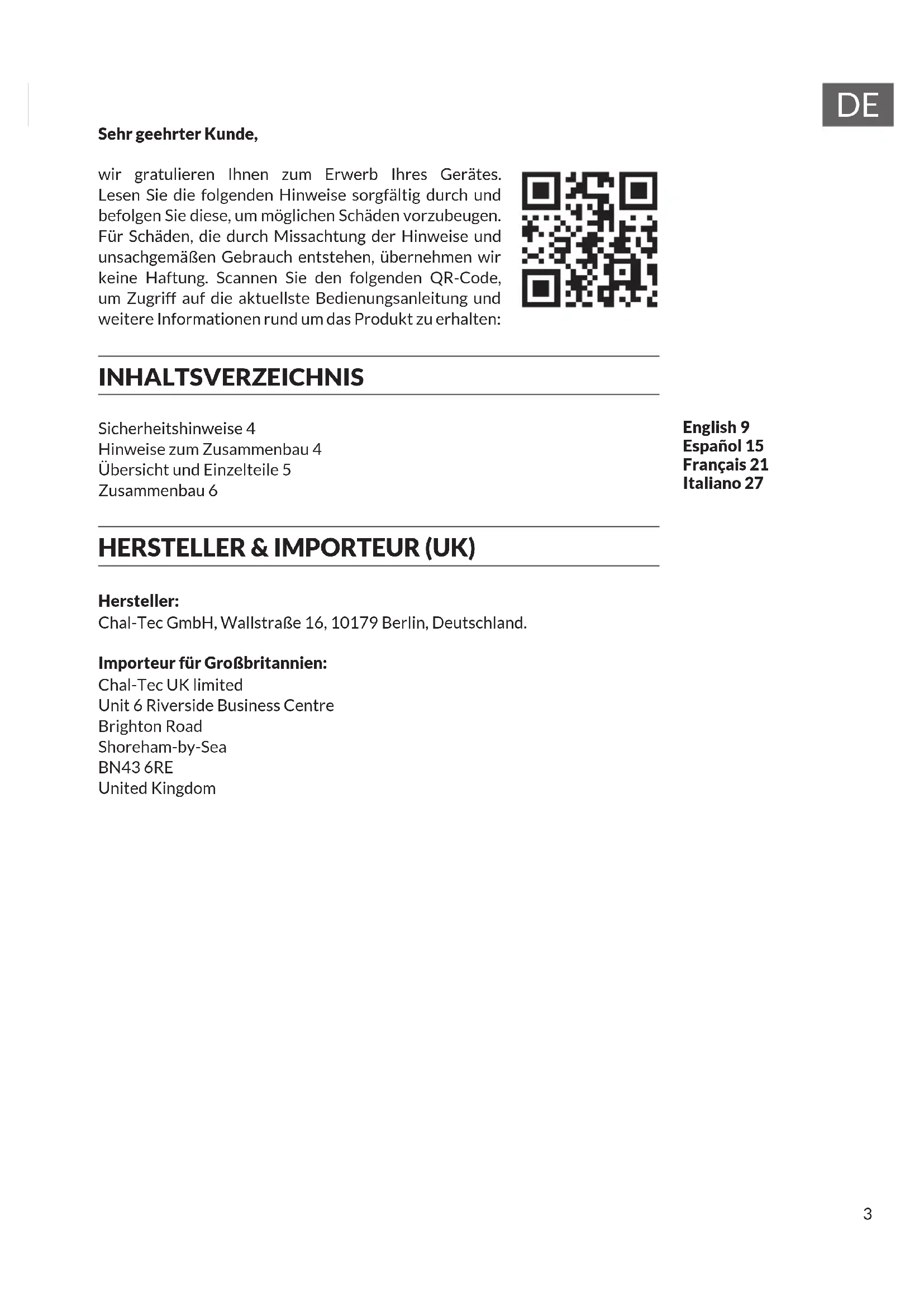 Sehr geehrter Kunde, wir gratulieren Ihnen zum Erwerb Ihres Gerätes. Lesen Sie die folgenden Hinweise sorgfältig durch und befolgen Sie diese, um möglichen Schäden vorzubeugen. Für Schäden, die durch Missachtung der Hinweise und unsachgemäßen Gebrauch entstehen, übernehmen wir keine Haftung. Scannen Sie den folgenden QR-Code, um Zugriff auf die aktuellste Bedienungsanleitung und weitere Informationen rund um das Produkt zu erhalten: INHALTSVERZEICHNIS Sicherheitshinweise 4 Hinweise zum Zusammenbau 4 Übersicht und Einzelteile 5 Zusammenbau 6 HERSTELLER & IMPORTEUR (UK) Hersteller: Chal-Tec GmbH, Wallstraße 16, 10179 Berlin, Deutschland. Importeur für Großbritannien: Chal-Tec UK limited Unit 6 Riverside Business Centre Brighton Road Shoreham-by-Sea BN43 6RE United Kingdom English 9 Español 15 Français 21 Italiano 274