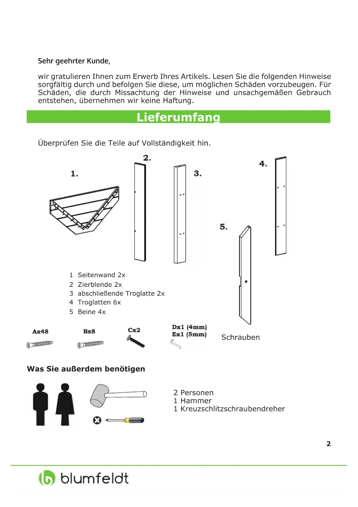 HochbeetLieferumfang Überprüfen Sie die Teile auf Vollständigkeit hin. Was Sie außerdem benötigen 2 Personen 1 Hammer 1 Kreuzschlitzschraubendreher 1 Seitenwand 2x 2 Zierblende 2x 3 abschließende Troglatte 2x 4 Troglatten 6x 5 Beine 4x