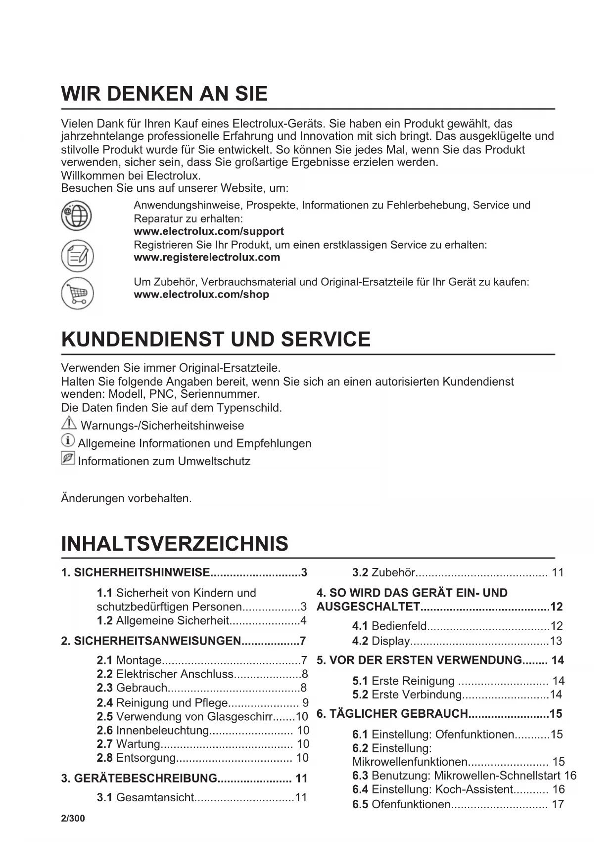 Recyceln Sie Materialien mit dem Symbol . Entsorgen Sie die Verpackung in den entsprechenden Recyclingbehältern. Recyceln Sie zum Umwelt- und Gesundheitsschutz elektrische und elektronische Geräte. Entsorgen Sie Geräte mit diesem Symbol nicht mit dem Hausmüll. Bringen Sie das Gerät zu Ihrer örtlichen Sammelstelle oder wenden Sie sich an Ihr Gemeindeamt. 38/300 WÄHLEN SIE EINE VERKNÜPFUNG!WE’RE THINKING OF YOU Thank you for purchasing an Electrolux appliance. You’ve chosen a product that brings with it decades of professional experience and innovation. Ingenious and stylish, it has been designed with you in mind. So whenever you use it, you can be safe in the knowledge that you’ll get great results every time. Welcome to Electrolux. Visit our website to: Get usage advice, brochures, trouble shooter, service and repair information: www.electrolux.com/support Register your product for better service: www.registerelectrolux.com Buy Accessories, Consumables and Original spare parts for your appliance: www.electrolux.com/shop