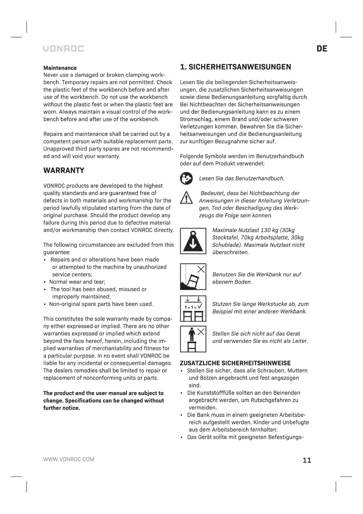 Die Werkbank ist so konzipiert, dass sie fur einen langen Zeitraum und bei minimalem Wartungsaufwand fehlerfrei funktioniert. Verlangern Sie ihre Lebensdauer, indem Sie sie regelmasig reinigen und richtig behandeln. Reinigung Reinigen Sie die Werkbank regelmasig, vorzugs- weise nach jedem Gebrauch Verwenden Sie zum Reinigen einen geeigneten Haushaltsreiniger und ein weiches, trockenes Tuch. Tauchen Sie Ihre Werkbank keinesfalls in Wasser oder andere Flussigkeiten. Verwenden Sie keine Losungsmit- tel (Benzin, Alkohol, Ammoniak usw.), da sie die Kunststoffteile beschadigen konnen. Wartung Verwenden Sie niemals eine beschadigte Klemm- bank. Vorubergehende Reparaturen sind nicht ge- stattet. Uberprufen Sie vor und nach dem Gebrauch der Werkbank deren Kunststofffuse. Verwenden Sie die Werkbank nicht ohne die Kunststofffuse oder wenn diese abgenutzt sind. Fuhren Sie vor und nach dem Gebrauch der Werkbank immer eine Sichtkontrolle der Werkbank durch. Reparaturen und Wartungsarbeiten mussen von einer sachkundigen Person und mit geeigneten Ersatzteilen durchgefuhrt werden. Nicht freigege- bene Ersatzteile von Drittanbietern werden nicht empfohlen und fuhren zum Erloschen der Garantie. GARANTIE VONROC-Produkte werden nach den hochsten Qualitatsstandards entwickelt und sind fur den gesetzlich festgelegten Zeitraum, ausgehend von dem ursprunglichen Kaufdatum, garantiert frei von Fehlern in Material und Ausfuhrung. Sollte das Produkt in diesem Zeitraum aufgrund von Material- und/oder Verarbeitungsmangeln Fehler aufweisen, wenden Sie sich bitte direkt an VONROC Kunden- dienst.14