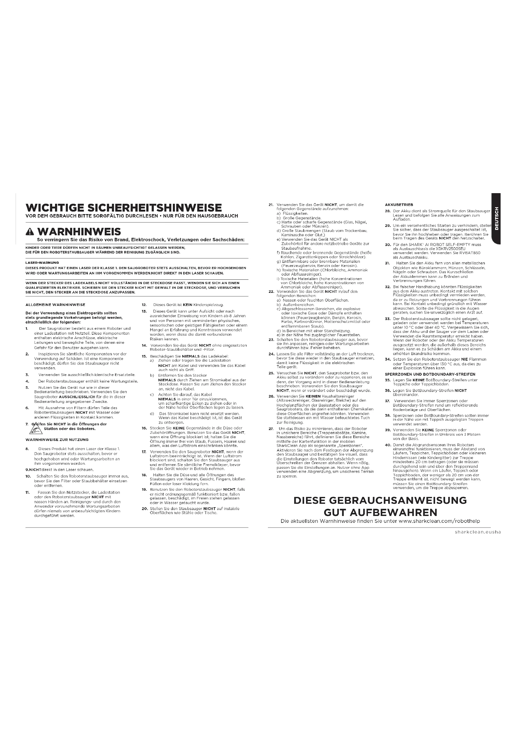 einwandfrei funktionieren, muss der Abstand von Läufern, Teppichen, Teppichböden oder kleineren Hindernissen (wie Kindergitter) zur Treppe mindestens 20cm betragen (oder sie müssen durchgehend sein und über den Treppenrand hinausgehen). Wenn ein Läufer, Teppich oder Teppichboden, der weniger als 20cm von der Treppe entfernt ist, nicht bewegt werden kann, müssen Sie einen BotBoundary-Streifen verwenden, um die Treppe abzusperren. KINDER ODER TIERE DÜRFEN NICHT IN RÄUMEN UNBEAUFSICHTIGT GELASSEN WERDEN, DIE FÜR DEN ROBOTERSTAUBSAUGER WÄHREND DER REINIGUNG ZUGÄNGLICH SIND.LASER-WARNUNGDIESES PRODUKT HAT EINEN LASER DER KLASSE1. DEN SAUGROBOTER STETS AUSSCHALTEN, BEVOR ER HOCHGEHOBEN WIRD ODER WARTUNGSARBEITEN AN IHM VORGENOMMEN WERDEN.NICHT DIREKT IN DEN LASER SCHAUEN. DIESE GEBRAUCHSANWEISUNG GUT AUFBEWAHREN Die aktuellsten Warnhinweise finden Sie unter www.sharkclean.com/robothelp WENN DER STECKER DES LADEKABELS NICHT VOLLSTÄNDIG IN DIE STECKDOSE PASST, WENDEN SIE SICH AN EINEN QUALIFIZIERTEN ELEKTRIKER. SCHIEBEN SIE DEN STECKER NICHT MIT GEWALT IN DIE STECKDOSE, UND VERSUCHEN SIE NICHT, DEN STECKER AN DIE STECKDOSE ANZUPASSEN. DEUTSCHsharkclean.eusharkclean.eu