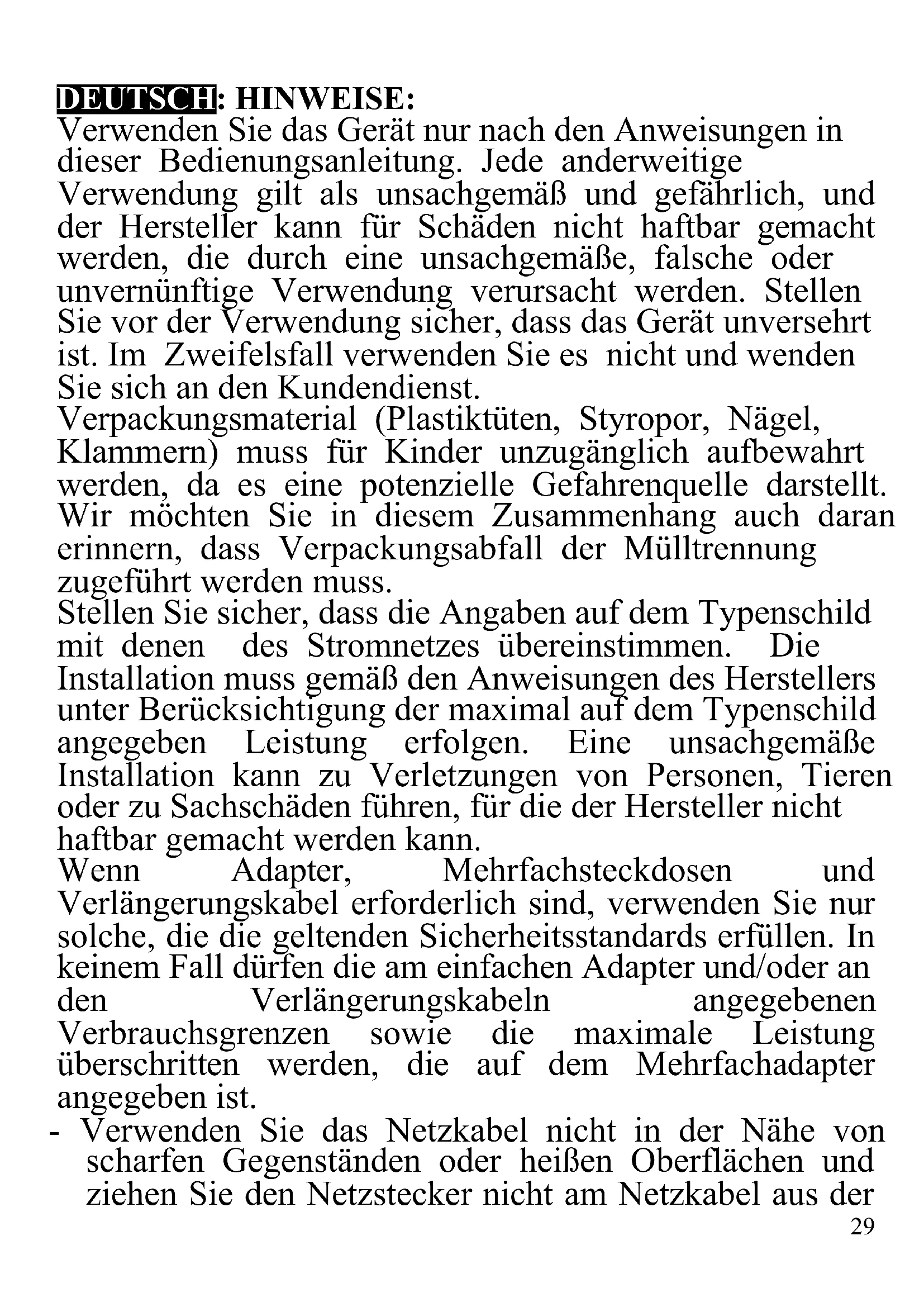 - Consommation électrique en mode éteint: 0 W, le produit passe automatiquement en mode éteint après utilisation29 DEUTSCH: HINWEISE: Verwenden Sie das Gerät nur nach den Anweisungen in dieser Bedienungsanleitung. Jede anderweitige Verwendung gilt als unsachgemäß und gefährlich, und der Hersteller kann für Schäden nicht haftbar gemacht werden, die durch eine unsachgemäße, falsche oder unvernünftige Verwendung verursacht werden. Stellen Sie vor der Verwendung sicher, dass das Gerät unversehrt ist. Im Zweifelsfall verwenden Sie es nicht und wenden Sie sich an den Kundendienst. Verpackungsmaterial (Plastiktüten, Styropor, Nägel, Klammern) muss für Kinder unzugänglich aufbewahrt werden, da es eine potenzielle Gefahrenquelle darstellt. Wir möchten Sie in diesem Zusammenhang auch daran erinnern, dass Verpackungsabfall der Mülltrennung zugeführt werden muss. Stellen Sie sicher, dass die Angaben auf dem Typenschild mit denen des Stromnetzes übereinstimmen. Die Installation muss gemäß den Anweisungen des Herstellers unter Berücksichtigung der maximal auf dem Typenschild angegeben Leistung erfolgen. Eine unsachgemäße Installation kann zu Verletzungen von Personen, Tieren oder zu Sachschäden führen, für die der Hersteller nicht haftbar gemacht werden kann. Wenn Adapter, Mehrfachsteckdosen und Verlängerungskabel erforderlich sind, verwenden Sie nur solche, die die geltenden Sicherheitsstandards erfüllen. In keinem Fall dürfen die am einfachen Adapter und/oder an den Verlängerungskabeln angegebenen Verbrauchsgrenzen sowie die maximale Leistung überschritten werden, die auf dem Mehrfachadapter angegeben ist. - Verwenden Sie das Netzkabel nicht in der Nähe von scharfen Gegenständen oder heißen Oberflächen und ziehen Sie den Netzstecker nicht am Netzkabel aus der30 Steckdose. Lassen Sie es nicht von der Arbeitsplatte baumeln, wo ein Kind es halten könnte. Verwenden Sie das Gerät im Falle von Schäden am Netzkabel, Stecker oder im Falle von Kurzschlüssen nicht und lassen Sie es in einer Vertragswerkstatt reparieren. - Setzen Sie das Gerät keinen ungünstigen Wetterbedingungen, wie z. B. Regen, Feuchtigkeit, Frost, aus und bewahren Sie es an einem trockenen Ort auf. Fassen Sie das Gerät nicht mit nassen Händen an und verwenden Sie es nicht barfuß. - Dieses Gerät kann nicht von Kindern verwendet werden, auch wenn diese älter als 8 Jahre sind. - Dieses Gerät kann von Personen mit eingeschränkten körperlichen, sensorischen oder geistigen Fähigkeiten oder mangelnder Erfahrung und Kenntnissen verwendet werden, wenn sie in sicherer Weise beaufsichtigt oder instruiert wurden, wie das Gerät verwendet werden kann, und die damit verbundenen Gefahren verstehen. - Kinder dürfen nicht mit dem Gerät spielen. - Bewahren Sie das Gerät und sein Netzanschluss außerhalb der Reichweite von Kinder unter 8 Jahren. Wenn das Netzkabel beschädigt ist oder wenn ein Fehler vorliegt, darf das Gerät nicht manipuliert werden. Jede Reparatur muss vom Hersteller oder seinem technischen Kundendienst oder in jedem Fall von einer Person mit ähnlicher Qualifikation durchgeführt werden, um jegliches Risiko zu vermeiden. Die Nichtbeachtung der vorstehenden Bestimmungen kann die Sicherheit des Geräts beeinträchtigen und die Garantiebedingungen ungültig machen. WARNUNG: Dieses Gerät enthält eine Heizfunktion. Oberflächen, außer die funktionellen Oberflächen können hohe Temperaturen entwickeln. Da die Temperaturen von verschiedene Personen unterschiedlich wahrgenommen werden, sollte dieses Gerät mit VORSICHT verwendet31 werden. Halten Sie das Gerät ausschließlich auf Griffflächen die abhalten und verwenden Sie solche Hitzeschutzmaßen. Dieses Gerät ist nur für den Hausgebrauch oder gleichwertiges bestimmt, in Situationen wie bspw.: Kantinen in kleinen Firmen oder ähnliche Arbeitsumgebungen, von Kunden in Hotels, Motels oder andere Art von touristische Unterkunft, wie ländlicher oder Wohn –Tourismus. Das Gerät darf nicht mit einer Zeitschaltuhr oder mit einem separaten Fernwirksystem betrieben werden Führen Sie vor jedem Gebrauch das Netzkabel aus. Setzen Sie das Produkt keinen Stößen aus, es könnte beschädigt werden. Verwenden Sie nur originale und kompatible Teile und Zubehör. Halten Sie das Gerät fern von brennbaren Materialien, Wärmequellen, Dampf-und kalte Zonen. BEDIENUNGSANLEITUNG Benutzen Sie nur für höhe Temperaturen geeignete Töpfe. Stellen Sie das Hinterteil an eine Wand. Das Gerät wird während des Betriebs sehr warm. Berühren Sie nur den Türgriff und die Knöpfe. Berühren Sie das Glas und die Seitenteile nicht. Legen Sie keine Gegenstände auf die Tür, wenn sie aufgemacht ist. Sie könnte beschädigt werden oder das Ofen könnte fallen und brechen. Benutzen Sie immer Topflappen, um den Rost und das Blech auszuziehen. Vermeiden Sie Wasser auf das Glas der Tür, wenn es warm ist, da es brechen könnte. Benutzen Sie den Ofen nicht, wenn Sie Beschädigungen an der Tür oder der Türdichtung bemerken. Falls der Ofen nicht richtig funktioniert, wenden Sie sich an das Kundencenter. Ihr Eingriff kann den Ofen beschädigen.32 Behandeln Sie das gerade gekochte Essen sorgfältig, da es sehr heiß sein kann. Vor jeder Nutzung, Rollen Sie das Kabel ab. Betreiben Sie das Gerät nie unbeaufsichtigt. Benutzen Sie nie Plastikbehälter für das traditionelle Garen. Nach jeder Nutzung, ziehen Sie immer den Stecker aus der Steckdose. Tauchen Sie den Ofen nicht in Wasser oder andere Flüssigkeiten und vermeiden Sie Spritzen auf ihn. Benutzen Sie das Gerät nicht als Heizgerät. Stecken Sie keine Gegenstände in die Luftschlitze. Bevor Sie das Gerät reinigen, stecken Sie den Stecker aus der Steckdose und warten Sie auf die Abkühlung aller Teile des Geräts. EINBAU Entnehmen Sie alle Gegenstände aus dem Kochraum. Legen Sie das Gerät auf stabile und feste Flächen. Lassen Sie während des Betriebs genügenden Raum an den Seiten des Ofens. Halten Sie das Ger