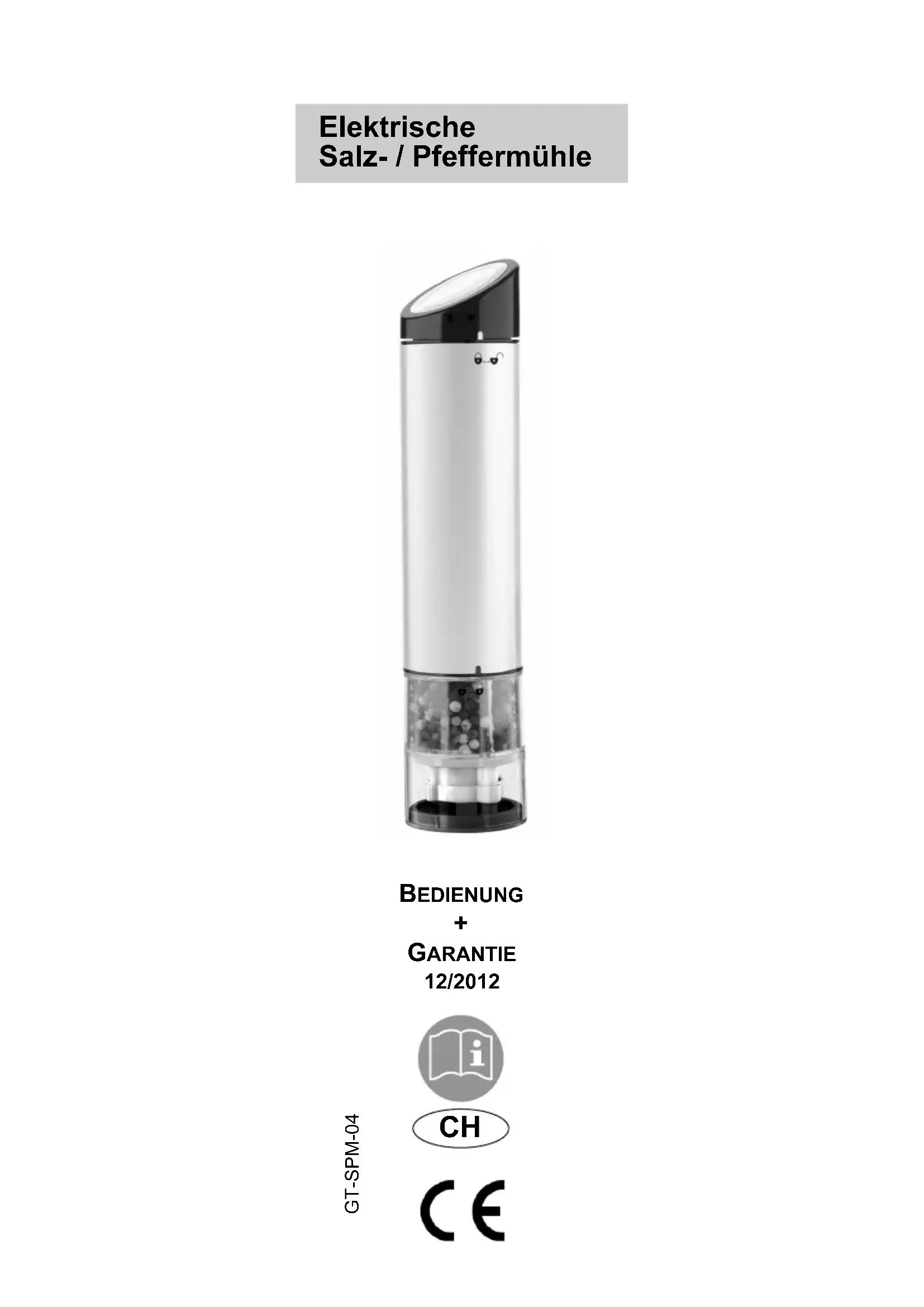 Edelstahl-Oberfläche ver- wenden Sie ein handels- übliches Edelstahl- Pflegemittel. Beachten Sie die Herstelleranga- ben auf der Pflegemittel- Verpackung. Keine Funktion. - Batterien leer? - Batterien richtig herum eingesetzt? Mühle arbeitet, aber es kommt nichts raus. - Schutzkappe entfernt? - Einstellrad für Mahl- grad versehentlich bis zum Anschlag gedreht? Beleuchtung funktioniert nicht. - Mühle falsch zusam- mengebaut? Prüfen Sie, ob die Kontakte von Mahlgut-Behälter und Gehäuse korrekt zueinander stehen. Hinweis: Die Lampe selbst kann nicht gewechselt werden. Modell: Elektrische Salz- und Pfeffermühle GT-SPM-04 Batterien: 6x 1,5 V LR03 (AAA) / 0,9-1 A Da unsere Produkte ständig weiterentwickelt und verbes- sert werden, sind Design- und technische Änderungen möglich. Fehler + Abhilfe Technische Daten CH SalzPfefferMuehle 2012.book Seite 12 Freitag, 20. Juli 2012 3:36 1513