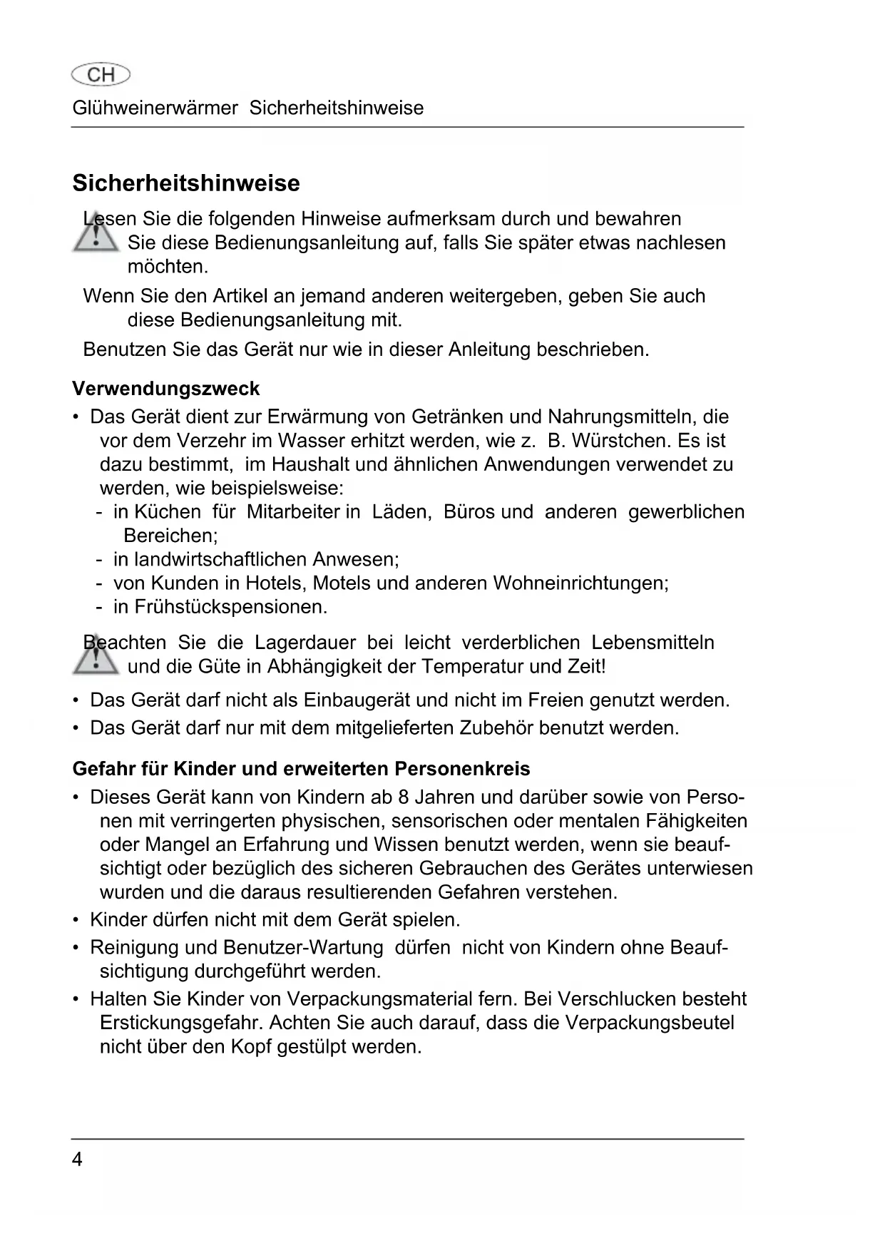 - Der Gluhweinerwärmerarf nicht in Wasser oder andere Flüssigkeiten getaucht werden. Stromschlaggefahr! Benutzen Sie das Gerät daher auch nicht in der Nähve von Feuchtquellen, wie z. B. einem Waschbecken.