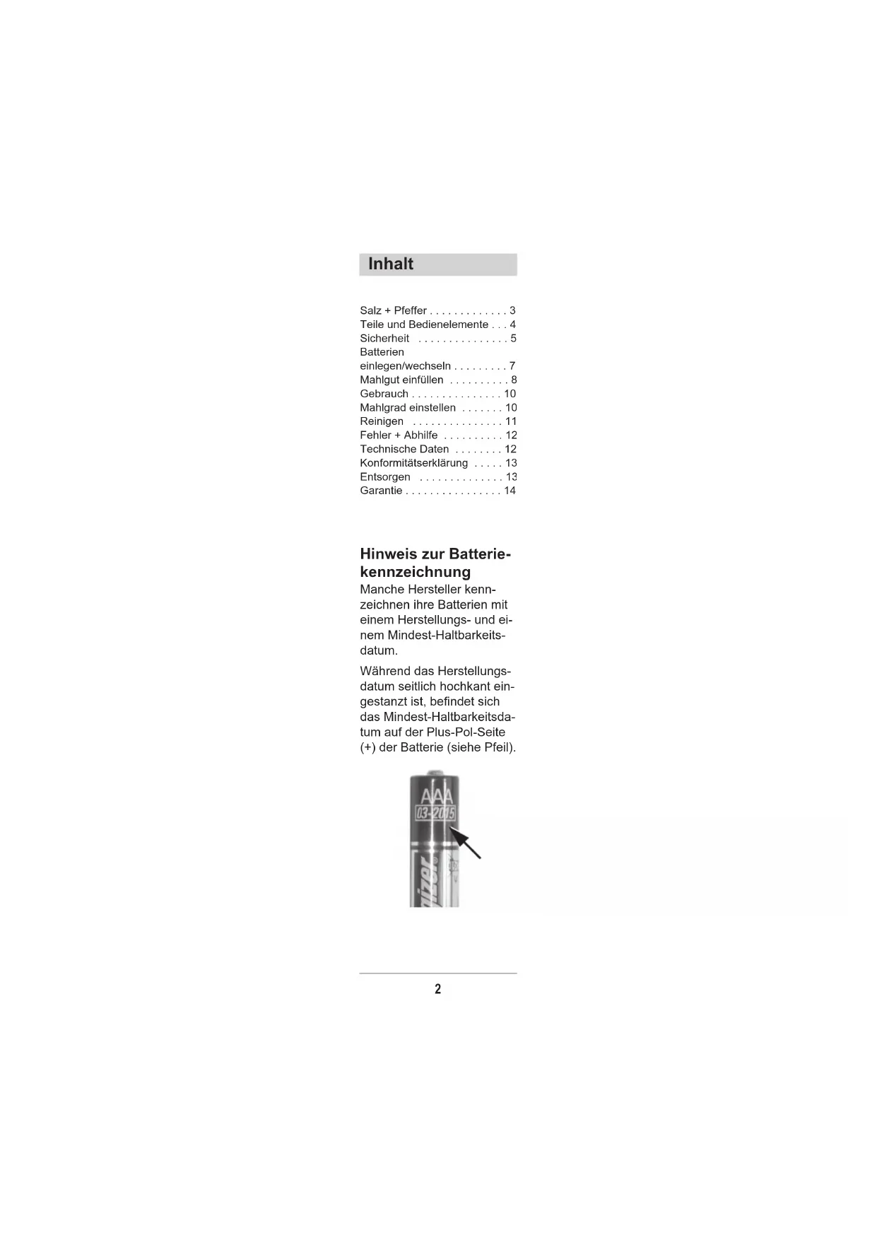 - Elektrische Salz- / Pfeffermühle2 Hinweis zur Batterie- kennzeichnung Manche Hersteller kenn- zeichnen ihre Batterien mit einem Herstellungs- und ei- nem Mindest-Haltbarkeits- datum. Während das Herstellungs- datum seitlich hochkant ein- gestanzt ist, befindet sich das Mindest-Haltbarkeitsda- tum auf der Plus-Pol-Seite (+) der Batterie (siehe Pfeil). Inhalt Salz + Pfeffer p. 3