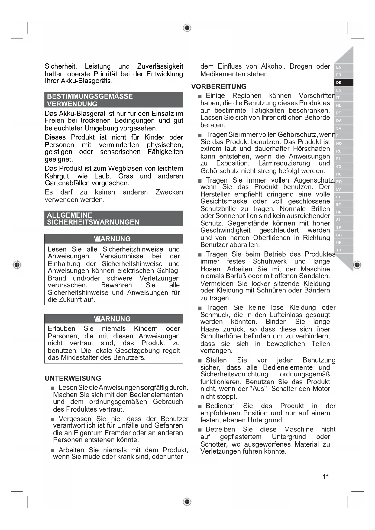 Sicherheit, Leistung und Zuverlässigkeit hatten oberste Priorität bei der Entwicklung Ihrer Akku-Blasgeräts. BESTIMMUNGSGEMÄSSE VERWENDUNG Das Akku-Blasgerät ist nur für den Einsatz im Freien bei trockenen Bedingungen und gut beleuchteter Umgebung vorgesehen. Dieses Produkt ist nicht für Kinder oder Personen mit verminderten physischen, geistigen oder sensorischen Fähigkeiten geeignet. Das Produkt ist zum Wegblasen von leichtem Kehrgut, wie Laub, Gras und anderen Gartenabfällen vorgesehen. Es darf zu keinen anderen Zwecken verwenden werden. ALLGEMEINE SICHERHEITSWARNUNGEN WARNUNG Lesen Sie alle Sicherheitshinweise und Anweisungen. Versäumnisse bei der Einhaltung der Sicherheitshinweise und Anweisungen können elektrischen Schlag, Brand und/oder schwere Verletzungen verursachen. Bewahren Sie alle Sicherheitshinweise und Anweisungen für die Zukunft auf. WARNUNG Erlauben Sie niemals Kindern oder Personen, die mit diesen Anweisungen nicht vertraut sind, das Produkt zu benutzen. Die lokale Gesetzgebung regelt das Mindestalter des Benutzers. UNTERWEISUNG ■ Lesen Sie die Anweisungen sorgfältig durch. Machen Sie sich mit den Bedienelementen und dem ordnungsgemäßen Gebrauch des Produktes vertraut. ■ Vergessen Sie nie, dass der Benutzer verantwortlich ist für Unfälle und Gefahren die an Eigentum Fremder oder an anderen Personen entstehen könnte. ■ Arbeiten Sie niemals mit dem Produkt, wenn Sie müde oder krank sind, oder unter dem Einfluss von Alkohol, Drogen oder Medikamenten stehen. VORBEREITUNG ■ Einige Regionen können Vorschriften haben, die die Benutzung dieses Produktes auf bestimmte Tätigkeiten beschränken. Lassen Sie sich von Ihrer örtlichen Behörde beraten. ■ Tragen Sie immer vollen Gehörschutz, wenn Sie das Produkt benutzen. Das Produkt ist extrem laut und dauerhafter Hörschaden kann entstehen, wenn die Anweisungen zu Exposition, Lärmreduzierung und Gehörschutz nicht streng befolgt werden. ■ Tragen Sie immer vollen Augenschutz, wenn Sie das Produkt benutzen. Der Hersteller empfiehlt dringend eine volle Gesichtsmaske oder voll geschlossene Schutzbrille zu tragen. Normale Brillen oder Sonnenbrillen sind kein ausreichender Schutz. Gegenstände können mit hoher Geschwindigkeit geschleudert werden und von harten Oberflächen in Richtung Benutzer abprallen. ■ Tragen Sie beim Betrieb des Produktes immer festes Schuhwerk und lange Hosen. Arbeiten Sie mit der Maschine niemals Barfuß oder mit offenen Sandalen. Vermeiden Sie locker sitzende Kleidung oder Kleidung mit Schnüren oder Bändern zu tragen. ■ Tragen Sie keine lose Kleidung oder Schmuck, die in den Lufteinlass gesaugt werden könnten. Binden Sie lange Haare zurück, so dass diese sich über Schulterhöhe befinden um zu verhindern, dass sie sich in beweglichen Teilen verfangen. ■ Stellen Sie vor jeder Benutzung sicher, dass alle Bedienelemente und Sicherheitsvorrichtung ordnungsgemäß funktionieren. Benutzen Sie das Produkt nicht, wenn der "Aus" -Schalter den Motor nicht stoppt. ■ Bedienen Sie das Produkt in der empfohlenen Position und nur auf einem festen, ebenen Untergrund. ■ Betreiben Sie diese Maschine nicht auf gepflastertem Untergrund oder Schotter, wo ausgeworfenes Material zu Verletzungen führen könnte.12 | Deutsch