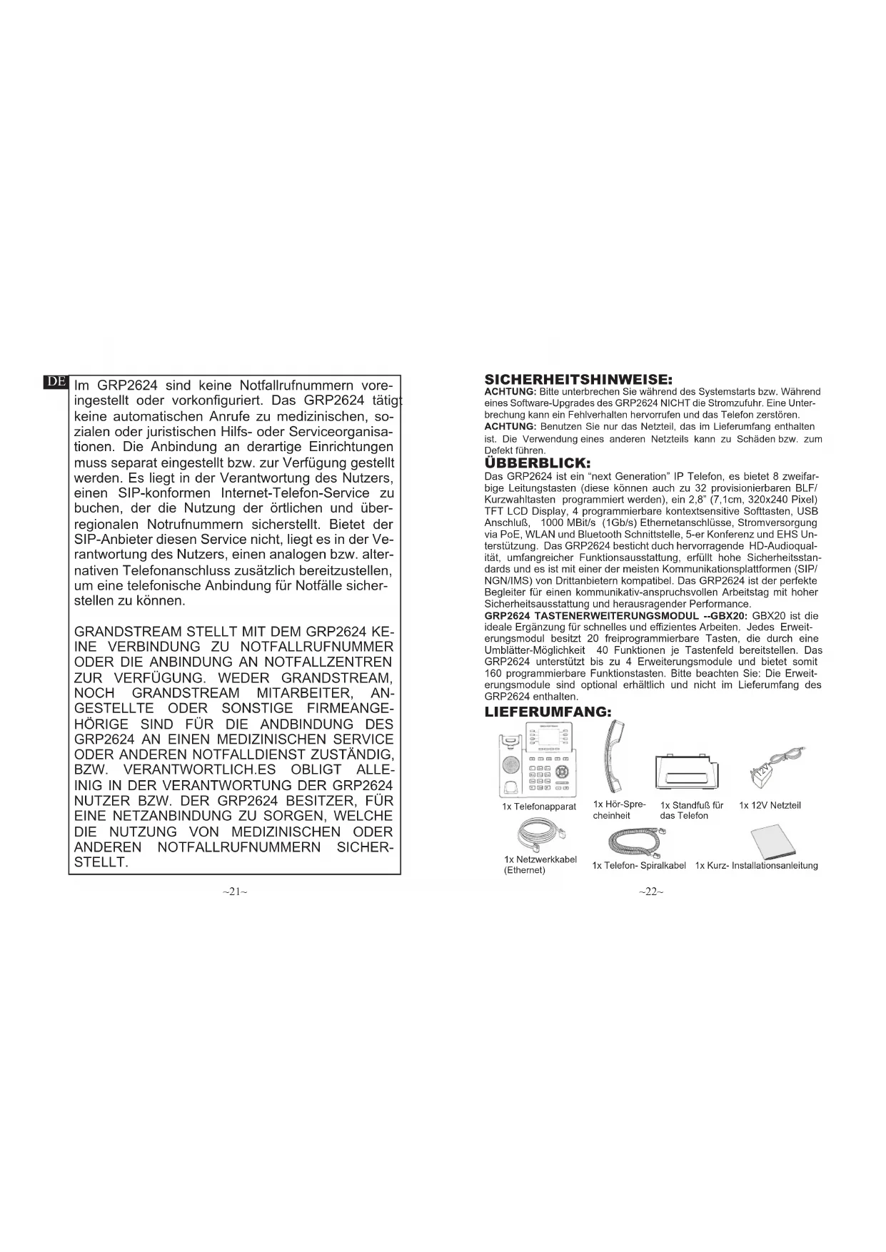 Das GRP2624 ist ein “next Generation” IP Telefon, es bietet 8 zweifar- bige Leitungstasten (diese können auch zu 32 provisionierbaren BLF/ Kurzwahltasten programmiert werden), ein 2,8” (7,1cm, 320x240 Pixel) TFT LCD Display, 4 programmierbare kontextsensitive Softtasten, USB Anschluß, 1000 MBit/s (1Gb/s) Ethernetanschlüsse, Stromversorgung via PoE, WLAN und Bluetooth Schnittstelle, 5-er Konferenz und EHS Un- terstützung. Das GRP2624 besticht duch hervorragende HD-Audioqual- ität, umfangreicher Funktionsausstattung, erfüllt hohe Sicherheitsstan- dards und es ist mit einer der meisten Kommunikationsplattformen (SIP/ NGN/IMS) von Drittanbietern kompatibel. Das GRP2624 ist der perfekte Begleiter für einen kommunikativ-anspruchsvollen Arbeitstag mit hoher Sicherheitsausstattung und herausragender Performance. GRP2624 TASTENERWEITERUNGSMODUL --GBX20: GBX20 ist die ideale Ergänzung für schnelles und ezientes Arbeiten. Jedes Erweit- erungsmodul besitzt 20 freiprogrammierbare Tasten, die durch eine Umblätter-Möglichkeit 40 Funktionen je Tastenfeld bereitstellen. Das GRP2624 unterstützt bis zu 4 Erweiterungsmodule und bietet somit 160 programmierbare Funktionstasten. Bitte beachten Sie: Die Erweit- erungsmodule sind optional erhältlich und nicht im Lieferumfang des GRP2624 enthalten. LIEFERUMFANG: ÜBBERBLICK: ACHTUNG: Bitte unterbrechen Sie während des Systemstarts bzw. Während eines Software-Upgrades des GRP2624 NICHT die Stromzufuhr. Eine Unter- brechung kann ein Fehlverhalten hervorrufen und das Telefon zerstören. 1x Telefonapparat 1x Hör-Spre- cheinheit 1x Telefon- Spiralkabel 1x Netzwerkkabel (Ethernet) 1x Standfuß für das Telefon 1x 12V Netzteil 1x Kurz- Installationsanleitung SICHERHEITSHINWEISE: ACHTUNG: Benutzen Sie nur das Netzteil, das im Lieferumfang enthalten ist. Die Verwendung eines anderen Netzteils kann zu Schäden bzw. zum Defekt führen. 12V~23~ ~24~ EINRICHTEN DES TELEFONS: Installation des Telefons (Wandmontage):