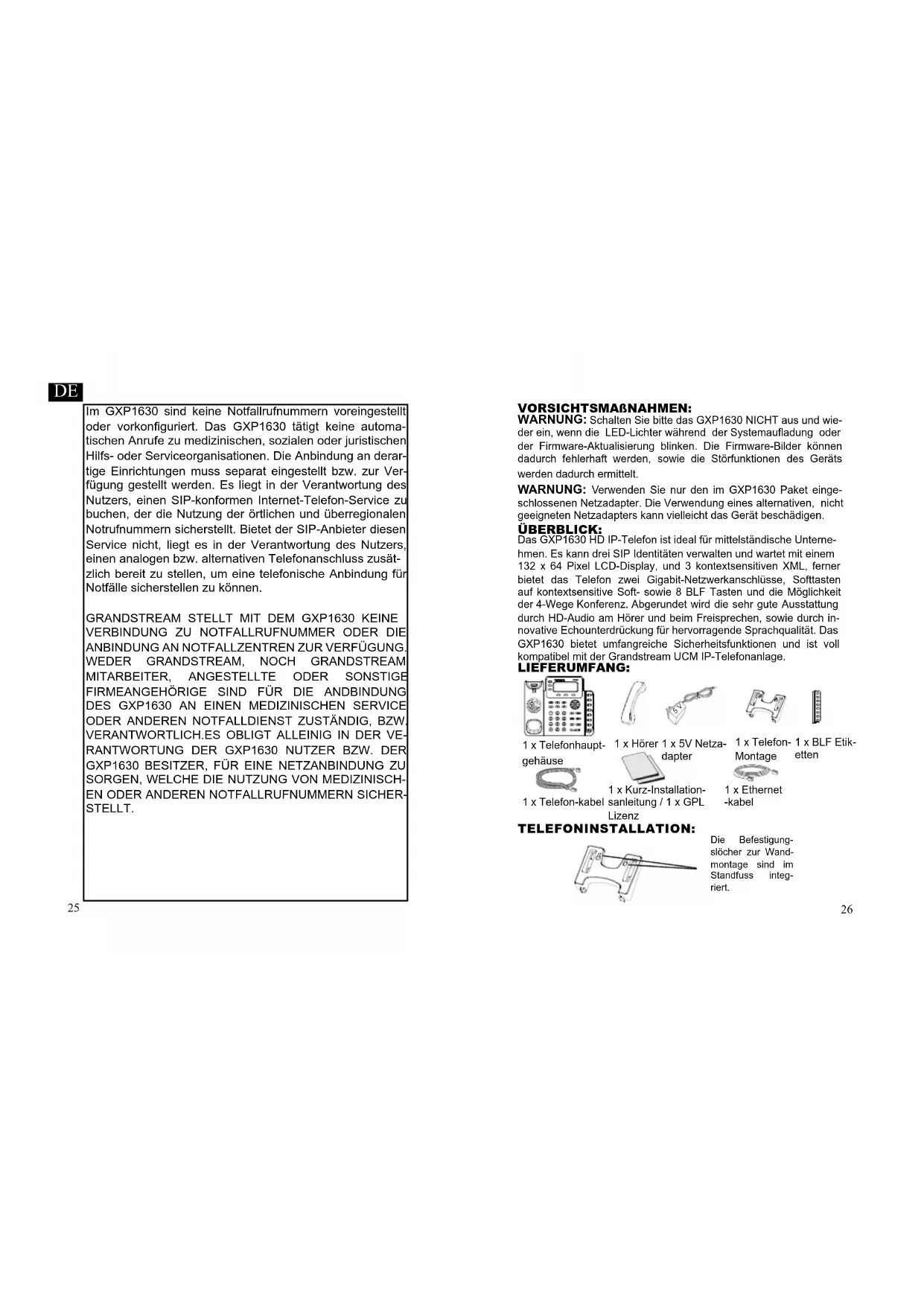 Im GXP1630 sind keine Notfallrufnummern voreingestellt oder vorkonfiguriert. Das GXP1630 tätigt keine automa- tischen Anrufe zu medizinischen, sozialen oder juristischen Hilfs- oder Serviceorganisationen. Die Anbindung an derar- tige Einrichtungen muss separat eingestellt bzw. zur Ver- fügung gestellt werden. Es liegt in der Verantwortung des Nutzers, einen SIP-konformen Internet-Telefon-Service zu buchen, der die Nutzung der örtlichen und überregionalen Notrufnummern sicherstellt. Bietet der SIP-Anbieter diesen Service nicht, liegt es in der Verantwortung des Nutzers, einen analogen bzw. alternativen Telefonanschluss zusät- zlich bereit zu stellen, um eine telefonische Anbindung für Notfälle sicherstellen zu können.