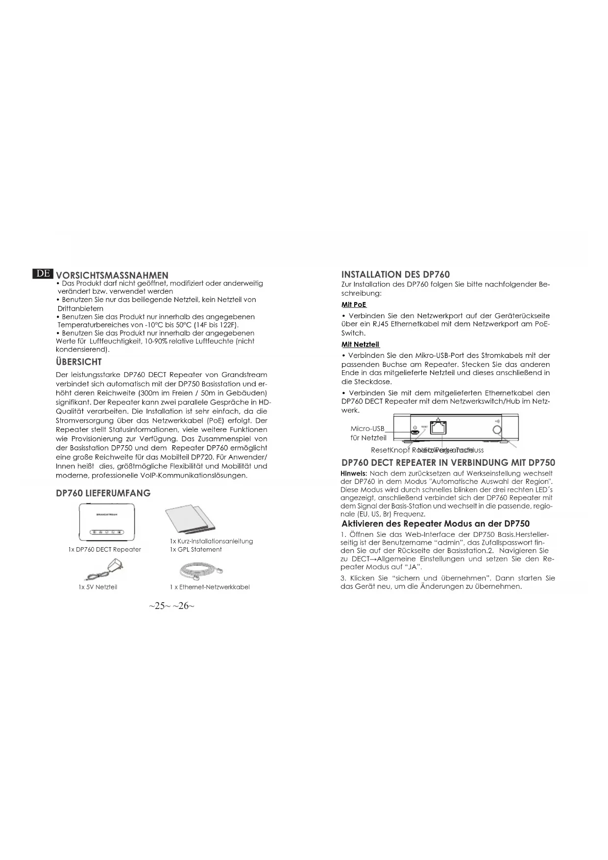 - Benutzen Sie das Produkt nur innerhalb der angegebenen Werte für Luftfeuchtigkeit, 10-90% relative Luftfeuchte (nicht kondensierend). DP760 LIEFERUMFANG 1 x Ethernet-Netzwerkkabel1x DP760 DECT Repeater1x 5V Netzteil1x Kurz-Installationsanleitung1x GPL Statement ÜBERSICHT Der leistungsstarke DP760 DECT Repeater von Grandstream verbindet sich automatisch mit der DP750 Basisstation und er- höht deren Reichweite (300m im Freien / 50m in Gebäuden) signifikant. Der Repeater kann zwei parallele Gespräche in HD- Qualität verarbeiten. Die Installation ist sehr einfach, da die Stromversorgung über das Netzwerkkabel (PoE) erfolgt. Der Repeater stellt Statusinformationen, viele weitere Funktionen wie Provisionierung zur Verfügung. Das Zusammenspiel von der Basisstation DP750 und dem Repeater DP760 ermöglicht eine große Reichweite für das Mobilteil DP720. Für Anwender/ Innen heißt dies, größtmögliche Flexibilität und Mobilität und moderne, professionelle VoIP-Kommunikationslösungen.