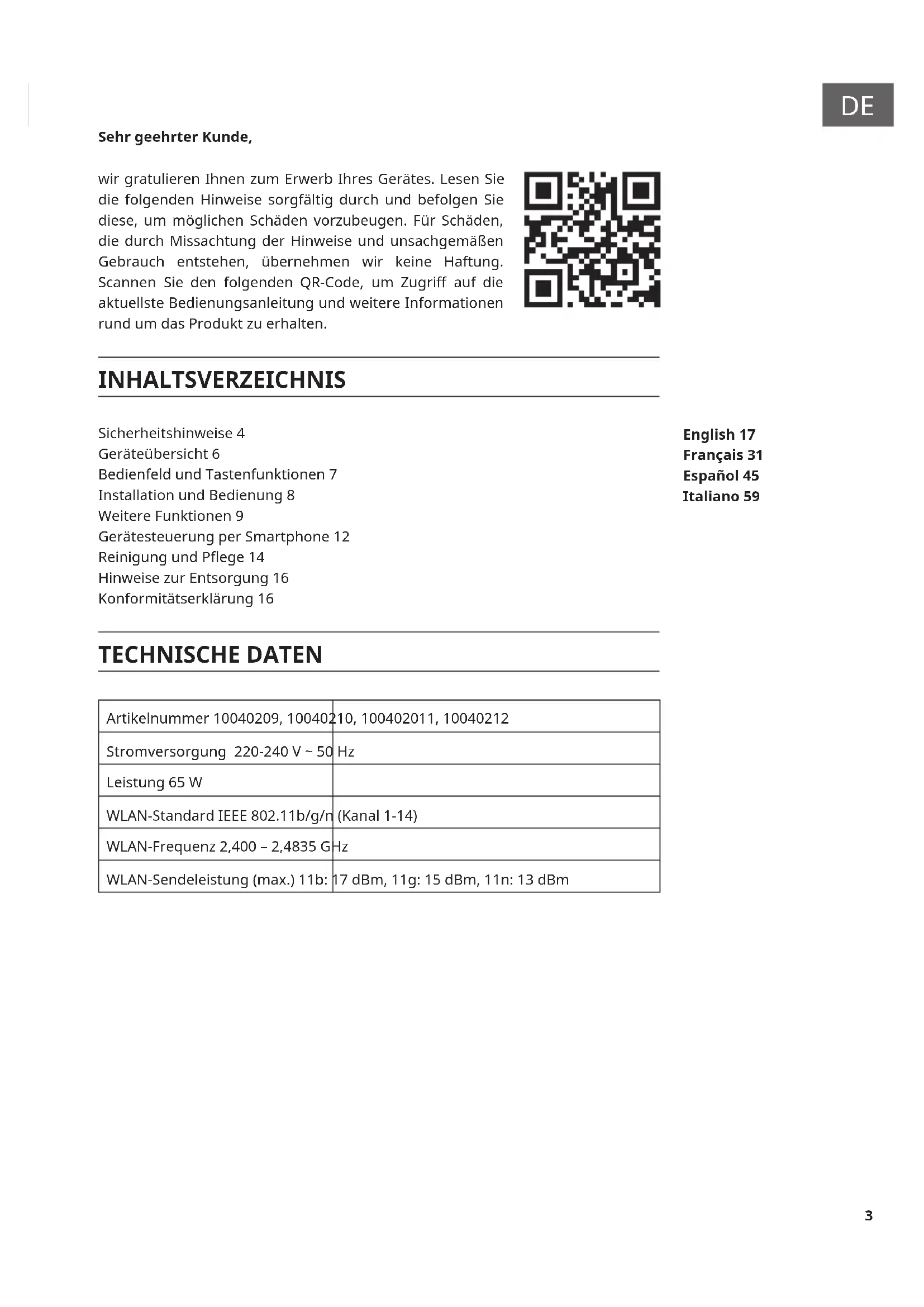 Sehr geehrter Kunde, wir gratulieren Ihnen zum Erwerb Ihres Gerätes. Lesen Sie die folgenden Hinweise sorgfältig durch und befolgen Sie diese, um möglichen Schäden vorzubeugen. Für Schäden, die durch Missachtung der Hinweise und unsachgemäßen Gebrauch entstehen, übernehmen wir keine Haftung. Scannen Sie den folgenden QR-Code, um Zugri auf die aktuellste Bedienungsanleitung und weitere Informationen rund um das Produkt zu erhalten. INHALTSVERZEICHNIS Sicherheitshinweise 4 Geräteübersicht 6 Bedienfeld und Tastenfunktionen 7 Installation und Bedienung 8 Weitere Funktionen 9 Gerätesteuerung per Smartphone 12 Reinigung und Pege 14 Hinweise zur Entsorgung 16 Konformitätserklärung 16 TECHNISCHE DATEN Artikelnummer 10040209, 10040210, 100402011, 10040212 Stromversorgung 220-240 V ~ 50 Hz Leistung 65 W WLAN-Standard IEEE 802.11b/g/n (Kanal 1-14) WLAN-Frequenz 2,400 – 2,4835 GHz WLAN-Sendeleistung (max.) 11b: 17 dBm, 11g: 15 dBm, 11n: 13 dBm English 17 Français 31 Español 45 Italiano 59 Nederlands4