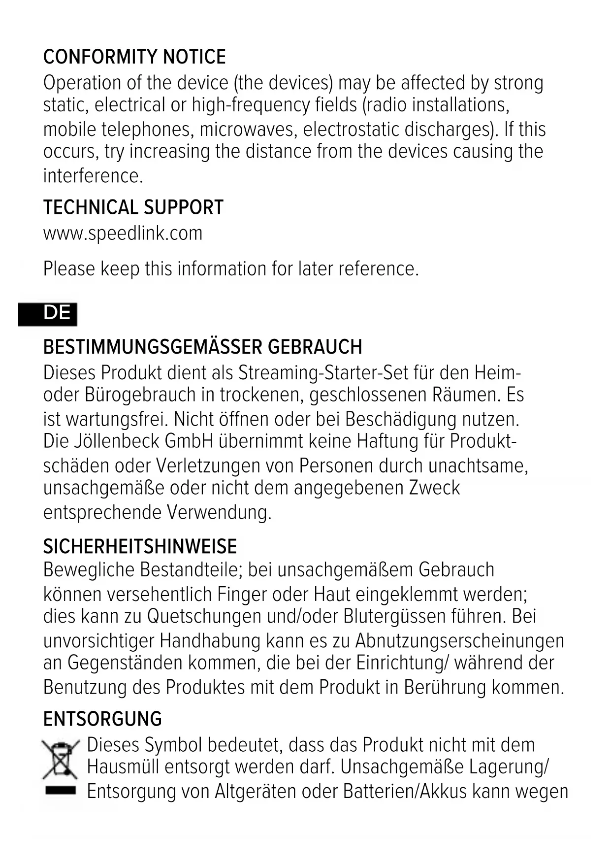 Dieses Produkt dient als Streaming-Starter-Set für den Heim- oder Bürogebrauch in trockenen, geschlossenen Räumen. Es ist wartungsfrei. Nicht önen oder bei Beschädigung nutzen. Die Jöllenbeck GmbH übernimmt keine Haftung für Produkt- schäden oder Verletzungen von Personen durch unachtsame, unsachgemäße oder nicht dem angegebenen Zweck entsprechende Verwendung. SICHERHEITSHINWEISE Bewegliche Bestandteile; bei unsachgemäßem Gebrauch können versehentlich Finger oder Haut eingeklemmt werden; dies kann zu Quetschungen und/oder Blutergüssen führen. Bei unvorsichtiger Handhabung kann es zu Abnutzungserscheinungen an Gegenständen kommen, die bei der Einrichtung/ während der Benutzung des Produktes mit dem Produkt in Berührung kommen. ENTSORGUNG Dieses Symbol bedeutet, dass das Produkt nicht mit dem Hausmüll entsorgt werden darf. Unsachgemäße Lagerung/ Entsorgung von Altgeräten oder Batterien/Akkus kann wegenDE