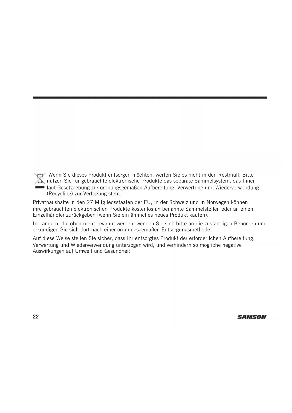 DE60x22 Wenn Sie dieses Produkt entsorgen möchten, werfen Sie es nicht in den Restmüll. Bitte nutzen Sie für gebrauchte elektronische Produkte das separate Sammelsystem, das Ihnen laut Gesetzgebung zur ordnungsgemäßen Aufbereitung, Verwertung und Wiederverwendung (Recycling) zur Verfügung steht. Privathaushalte in den 27 Mitgliedsstaaten der EU, in der Schweiz und in Norwegen können ihre gebrauchten elektronischen Produkte kostenlos an benannte Sammelstellen oder an einen Einzelhändler zurückgeben (wenn Sie ein ähnliches neues Produkt kaufen). In Ländern, die oben nicht erwähnt werden, wenden Sie sich bitte an die zuständigen Behörden und erkundigen Sie sich dort nach einer ordnungsgemäßen Entsorgungsmethode. Auf diese Weise stellen Sie sicher, dass Ihr entsorgtes Produkt der erforderlichen Aufbereitung, Verwertung und Wiederverwendung unterzogen wird, und verhindern so mögliche negative Auswirkungen auf Umwelt und Gesundheit.23DE10x/DE50x/DE60 x-Kopfbügelmikrofon ENFRDEESIT Herzlichen Glückwunsch zum Kauf Ihres Samson DEx-Kopfbügelmikrofons. Das DE 10x und das DE50x bieten dank ihres omnidirektionalen Aufnahmemusters einen linearen außeraxialen Frequenzgang. Das Ergebnis ist ein klarer und deutlicher Klang, der sich perfekt für Rundfunk, Gottesdienste, Vorträge, Theateraufführungen und Fitnessanwendungen eignet. Das DE60x bietet durch sein unidirektionales Aufnahmemuster eine hervorragende Isolierung und somit mehr Kontrolle und größere Rückkopplungssicherheit sowie klaren und deutlichen Ton für Live- Anwendungen. Im Lieferumfang der DEx-Kopfbügelmikrofone sind vier abnehmbare Adapterkabel enthalten: Durch die Adapter für 1/8” [3,5-mm-Klinkenstecker], Hirose® 4-Pin, Switchcraft® TA3F, Switchcraft® TA4F sind sie mit den drahtlosen Systemen von Samson sowie den meisten anderen gängigen drahtlosen Sendern kompatibel. Im Lieferumfang enthalten sind vier Windschütze, ein Kleiderclip und eine Tragetasche. Die Mikrofone der DEx-Serie verfügen über einen vergoldeten Stecker, eine feuchtigkeitsbeständige Beschichtung und ein Edelstahlgitter. Sie sindstaub-, wasser- und schweißbeständig bis IP65. Ein Tropfschutzring schützt die Kapsel zusätzlich vor Feuchtigkeit und sorgt für zuverlässige Leistung. Wenn Sie Fragen oder Anmerkungen zum DEx-Kopfbügelmikrofon oder anderen Produkten von Samson haben, kontaktieren Sie uns unter support@samsontech.com. Einführung24 Die Größe des Kopfbügels kann durch Verschieben der Ohrbügel angepasst werden, sodass er optimal sitzt. Wenn der Kopfbügel zu locker ist und verrutscht, können Sie die Ohrbügel nach hinten schieben, um den Kopfbügel enger zu stellen. Sie können das Mikrofon verschieben, indem Sie den linken Ohrbügel festhalten und den Mikrofonarm nach vorn oder hinten schieben. Für optimale Ergebnisse sollte sich das Mikrofon nahe an der Haut etwa 1–1,5cm vom Mundwinkel entfernt befinden und auf diesen ausgerichtet sein. Schieben Sie den Tropfschutzring so dicht wie möglich an die Kapsel. Verwenden Sie beim Einsatz im Freien und für weniger P-Pops einen der mitgelieferten Windschütze. Anpassung des DE10x/50x/60x-Mikrofons25DE10x/DE50x/DE60 x-Kopfbügelmikrofon ENFRDEESIT Adapterkabel Im Lieferumfang der DE10x/DE50x/DE60x-Mikrofone sind vier Kabel mit Adaptern für die gängigsten drahtlosen Bodypack-Sender enthalten. Klinkenstecker 3,5mm Kompatibel mit drahtlosen Systemen von Sennheiser