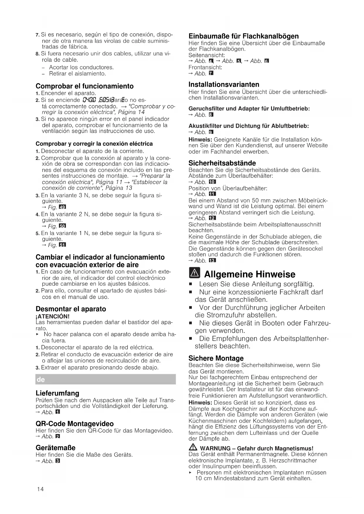 Allgemeine Hinweise ¡ Lesen Sie diese Anleitung sorgfältig. ¡ Nur eine konzessionierte Fachkraft darf das Gerät anschließen. ¡ Vor der Durchführung jeglicher Arbeiten die Stromzufuhr abstellen. ¡ Nie dieses Gerät in Booten oder Fahrzeu- gen verwenden. ¡ Die Empfehlungen des Arbeitsplattenher- stellers beachten. Sichere Montage Beachten Sie diese Sicherheitshinweise, wenn Sie das Gerät montieren. Nur bei fachgerechtem Einbau entsprechend der Montageanleitung ist die Sicherheit beim Gebrauch gewährleistet. Der Installateur ist für das einwand- freie Funktionieren am Aufstellungsort verantwortlich. Hinweis:Dieses Gerät ist so konzipiert, dass es Dämpfe aus Kochgeschirr auf der Kochzone auf- fängt. Werden die Dämpfe von anderen Geräten (wie Küchenmaschinen oder Kochfeldern) aufgefangen, hängt die Effizienz des Lüftungssystems von der Ent- fernung zwischen dem Lufteinlass und der Quelle der Dämpfe ab. WARNUNG‒Gefahr durch Magnetismus! Das Gerät enthält Permanentmagnete. Diese können elektronische Implantate, z.B. Herzschrittmacher oder Insulinpumpen beeinflussen. ▶ Personen mit elektronischen Implantaten müssen 10cm Mindestabstand zum Gerät einhalten.15 WARNUNG‒Vergiftungsgefahr! Zurückgesaugte Verbrennungsgase können zu Ver- giftungen führen. Raumluftabhängige Feuerstätten (z. B. gas-, öl-, holz- oder kohlebetriebene Heizgeräte, Durchlauferhitzer, Warmwasserbereiter) beziehen Verbrennungsluft aus dem Aufstellraum und führen die Abgase durch eine Abgasanlage (z. B. Kamin) ins Freie. In Verbindung mit einer eingeschalteten Dunstabzugshaube wird der Küche und den benach- barten Räumen Raumluft entzogen. Ohne ausrei- chende Zuluft entsteht ein Unterdruck. Giftige Gase aus dem Kamin oder Abzugsschacht werden in die Wohnräume zurückgesaugt. ▶ Immer für ausreichend Zuluft sorgen, wenn das Gerät im Abluftbetrieb gleichzeitig mit einer raum- luftabhängigen Feuerstätte verwendet wird. ▶ Ein gefahrloser Betrieb ist nur dann möglich, wenn der Unterdruck im Aufstellraum der Feuerstätte 4Pa(0,04mbar) nicht überschreitet. Dies kann erreicht werden, wenn durch nicht verschließbare Öffnungen, z. B. in Türen, Fenstern, in Verbindung mit einem Zuluft- / Abluftmauerkasten oder durch andere technische Maßnahmen, die zur Verbren- nung benötigte Luft nachströmen kann. Ein Zu- luft-/Abluftmauerkasten allein stellt die Einhaltung des Grenzwerts nicht sicher. ▶ Ziehen Sie in jedem Fall den Rat des zuständigen Schornsteinfegermeisters hinzu, der den gesam- ten Lüftungsverbund des Hauses beurteilen kann und Ihnen die passende Maßnahme zur Belüftung vorschlägt. ▶ Wird das Gerät ausschließlich im Umluftbetrieb eingesetzt, ist der Betrieb ohne Einschränkung möglich. WARNUNG‒Brandgefahr! Die Fettablagerungen im Fettfilter können sich ent- zünden. ▶ In der Nähe des Gerätes nie mit offener Flamme arbeiten (z.B. flambieren). ▶ Gerät nur dann in der Nähe einer Feuerstätte für feste Brennstoffe (z.B. Holz oder Kohle) installie- ren, wenn eine geschlossene, nicht abnehmbare Abdeckung vorhanden ist. Es darf keinen Funken- flug geben. WARNUNG‒Verletzungsgefahr! Veränderungen am elektrischen oder mechanischen Aufbau sind gefährlich und können zu Fehlfunktio- nen führen. ▶ Keine Veränderungen am elektrischen oder me- chanischen Aufbau durchführen. Teile, die während der Montage zugänglich sind, können scharfkantig sein und zu Schnittverletzungen führen. ▶ Schutzhandschuhe tragen. Das Gerät ist schwer. ▶ Zum Bewegen des Gerätes sind 2 Personen erfor- derlich. ▶ Nur geeignete Hilfsmittel verwenden. WARNUNG‒Erstickungsgefahr! Kinder können sich Verpackungsmaterial über den Kopf ziehen oder sich darin einwickeln und ersti- cken. ▶ Verpackungsmaterial von Kindern fernhalten. ▶ Kinder nicht mit Verpackungsmaterial spielen las- sen. WARNUNG‒Vergiftungsgefahr! Zurückgesaugte Verbrennungsgase können zu Ver- giftungen führen. ▶ Die Abluft nicht in einen Rauchkamin oder einen Abgaskamin abgeben, der in Betrieb ist. ▶ Die Abluft nicht in einen Schacht abgeben, der zur Entlüftung von Aufstellungsräumen von Feuerstät- ten dient. ▶ Soll die Abluft in einen Rauchkamin oder Abgas- kamin geführt werden, der nicht in Betrieb ist, muss die Zustimmung des zuständigen Schorn- steinfegermeisters eingeholt werden. Zurückgesaugte Verbrennungsgase können zu Ver- giftungen führen. ▶ Wenn eine Dunstabzugshaube mit einer raumluft- abhängigen Feuerstätte installiert wird, muss die Stromzuführung der Dunstabzugshaube mit einer geeigneten Sicherheitsschaltung versehen wer- den. Hinweise zum elektrischen Anschluss Um das Gerät sicher elektrisch anschließen zu kön- nen, beachten Sie diese Hinweise. WARNUNG‒Stromschlaggefahr! Die Trennung des Geräts vom Stromnetz muss je- derzeit möglich sein. Das Gerät darf nur an eine vor- schriftsmäßig installierte Anschlussdose angeschlos- sen werden. ▶ In der festverlegten elektrischen Installation muss eine allpolige Trennvorrichtung nach den Bedin- gungen der Überspannungskategorie III und nach den Errichtungsbestimmungen eingebaut werden. ▶ Nur eine Elektrofachkraft darf die festverlegte elek- trische Installation ausführen. Wir empfehlen einen Fehlerstromschutzschalter (FI-Schalter) im Strom- kreis der Geräteversorgung zu installieren. ¡ Das Anschlusskabel nicht knicken oder einklem- men und von scharfen Kanten fernhalten. ¡ Das Anschlusskabel so verlegen, dass es nicht das heiße Gerätegehäuse berührt. ¡ Nur das mit dem Gerät mitgelieferte oder vom technischen Kundendienst gelieferte Anschlusska- bel verwenden. ¡ Dieses Gerät entspricht den EG-Funkentstörbe- stimmungen. ¡ Das Gerät entspricht der Schutzklasse 1. Daher das Gerät nur mit Schutzleiter-Anschluss verwen- den. ¡ Der Hersteller übernimmt keine Verantwortung für Betriebsstörungen oder mögliche Schäden, die auf eine fehlerhafte elektrische Installation zurück- zuführen sind. Elektrischen 