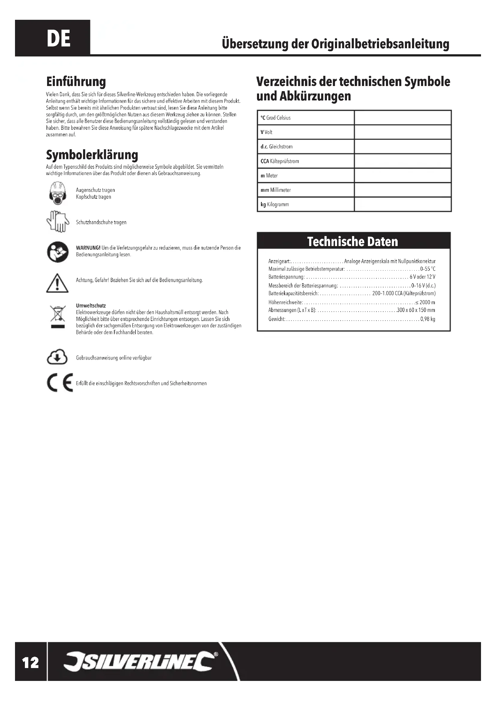 silverlinetools.com Allgemeine Sicherheitshinweise WARNUNG! Beachten Sie alle mit dem Gerät gelieferten Sicherheitshinweise, Anweisungen, Abbildungen und technischen Daten. Versäumnisse bei der Einhaltung der AnweisungenkönnenelektrischenSchlag,Brandund/oderschwereVerletzungenverursachen.Bewahren Sie alle Sicherheitshinweise und Anweisungen für die Zukunft auf.a) Auch wenn dieses Gerät wie vorgeschrieben verwendet wird, ist es nicht möglich, sämtliche Restrisiken auszuschließen. Verwenden Sie das Werkzeug stets mit Vorsicht. b) Sollten Sie sich bezüglich der sachgemäßen und sicheren Verwendung dieses Produkts unsicher sein, verwenden Sie es nicht.c) Unordnung oder Schmutz im Arbeitsbereich können zu Unfällen führen. Fußböden müssen frei gehalten werden. Denken Sie beim Arbeiten an die möglichen Rutsch- und Stolpergefahren. d) Kinder und Haustiere müssen vom Arbeitsbereich fern gehalten werden. Kindern oder nicht eingewiesenen Personen sollten Sie die Verwendung dieses Produkts untersagen.e) Tragen Sie keine weite Bekleidung, Krawatten, Schmuck oder Gegenstände, die vom Werkzeug erfasst werden könnten. f) Lange Haare sollten bedeckt oder im Nacken zusammengebunden werden. g) Nehmen Sie keine unnatürliche Körperstellungen ein, behalten Sie einen sicheren Stand undarbeitenSieNICHTaufinstabilenStandächen. h) Prüfen Sie den Artikel vor dem Gebrauch auf beschädigte oder fehlende Teile. Beschädigte Teile müssen umgehend von einer zugelassenen Reparaturwerkstatt repariert oder ausgetauscht werden. Gerät bei einem Defekt nicht verwenden! i) Tragen Sie stets für die jeweilige Arbeit geeignete persönliche Schutzausrüstung. Sicherheitshinweise für Batterieladeprüfer a) Vergewissern Sie sich, dass das Gerät nicht nass wird. Prüfen Sie KEINE nassen Batterien oder Ladesysteme. b) Nutzen Sie das Gerät NICHT bei schlechten Witterungsbedingungen. Wetter mit hoher Luftfeuchtigkeit (z. B. Nebel) oder starken elektrostatischen Feldern (z. B. Gewitter) kann zu Verletzungen oder Schäden führen und ungenaue Ergebnisse liefern.c) Verwenden Sie das Gerät nicht, wenn Sie brennbare Flüssigkeiten oder entzündbaren Staub auf dem Prüfgerät, der Testperson oder in der Umgebung beider vermuten. Reinigen Sie alle Anschlüsse vor der Prüfung gründlich. d) Achten Sie beim Tragen des Prüfgeräts darauf, dass alle Kabel sicher befestigt sind. Lassen Sie die Kabel NICHT lose herumhängen. e) Beim Laden kann das Prüfgerät heiß werden. Stellen Sie sicher, dass Sie die Anweisungen zu den Ladezeiten befolgen und dass Ihr Handschutz ausreichend hitzebeständig ist. f) Der Bereich um das Prüfgerät herum muss gut belüftet sein. Die Entlüftungsöffnungen dürfen auf keinen Fall blockiert werden. g) Achten Sie darauf, dass genügend Freiraum vorhanden ist, um das Prüfgerät sicher von der zu prüfenden Batterie zu trennen. h) Vergewissern Sie sich, dass alle nicht leitenden Schutzvorrichtungen, wie z. B. die Griffe für die Leitungsenden, in gutem Zustand sind. 1 Massekabel 2 Pluskabel 3 Anzeigeskala 4 Nullkorrekturschraube 5 Lastschalter Produktübersicht Bestimmungsgemäße Verwendung Batterie- und Ladesystemprüfer zur Durchführung von Hochstrom-Lasttests, zur Messung des Zustands geeigneter 6-V- und 12-V-Bleisäurebatterien und zur Überprüfung der Leistung von Ladesystemen. Für Heim- und Werkstattgebrauch.Nicht für den gewerblichen Einsatz geeignet.Das Gerät darf NUR für seinen bestimmungsgemäßen Zweck verwendet werden. Jede andere als die in dieser Anleitung erwähnte Verwendung gilt als Missbrauch. Die bedienende Person, nicht der Hersteller, ist für jegliche Schäden oder Verletzungen aufgrund missbräuchlicher Verwendung haftbar.DerHerstelleristwederfüramGerätvorgenommeneModikationennochfüraussolchenVeränderungen resultierende Schäden haftbar. Vor Inbetriebnahme WARNUNG! Stellen Sie sicher, dass der Motor ausgeschaltet ist und keine Lasten angeschlossen sind. Hinweis: Bei einigen Fahrzeugen kann es zweckmäßig sein, die Batterie aus dem Fahrzeug auszubauen. • Im Grundzustand sollte die Nadel auf der Anzeigeskala (3) auf „0” zeigen. Die Nadelposition kann durch Verstellen der Nullkorrekturschraube (4) korrigiert werden. • Die Batterieklemmen müssen sauber und rostfrei sein. Bedienung Batterie prüfen 1. Verbinden Sie das Pluskabel (2) mit der Plusklemme (+) der Batterie. 2. Verbinden Sie das Massekabel (1) mit der Minusklemme (-) der Batterie. 3. Prüfen Sie die Anzeige. Wenn der Messwert bei einer 12-Volt-Batterie unter 12 V bzw. bei einer 6-Volt-Batterie unter 6 V liegt, muss die Batterie vor der weiteren Überprüfung zunächst aufgeladen werden. WARNUNG! Lassen Sie den Lastschalter (5) nicht länger als 10 Sekunden auf „ON” stehen. Während des Lasttests kann das Prüfgerät heiß werden. 4. Bringen Sie den Lastschalter in die „ON”-Position (nach rechts) und lassen Sie die Nadel der Skala (3) sich stabilisieren. Siehe folgende Tabelle: WARNUNG! Warten Sie mindestens eine ganze Minute ab, bis sich das Prüfgerät abgekühlt hat, bevor Sie eine weitere Überprüfung vornehmen. Hinweis: Für 6-V- und 12-V-Batterien enthält die Anzeige getrennte Werteskalen. Achten Sie darauf, dass Sie bei der jeweiligen Batterie immer von der richtigen Werteskala ablesen. Der grüne Bereich ist auf der Skala für 12-V-Batterien abgestuft, um für die verschiedenen Batteriekapazitäten den jeweils guten Zustand anzuzeigen. Welcher Skalenbereich der richtige ist, hängt vom ICC-Wert der jeweiligen Batterie ab. Analyse der Batterieprüfung Wenn das Prüfgerät beim Batterietest einen gelben oder roten Bereich anzeigt, könnte die Batterie defekt oder teilweise entladen sein. Weitere Informationen über den Zustand der Batterie können mit Hilfe eines Feuchtigkeitsmessers und unter Beachtung der Anweisungen des Herstellers ermittelt werden. Ladefunktion prüfen WARNUNG! Bei diesem Test muss der Fahrzeugmotor laufen. Verbrennungsmotoren produzieren Kohlenmonoxi