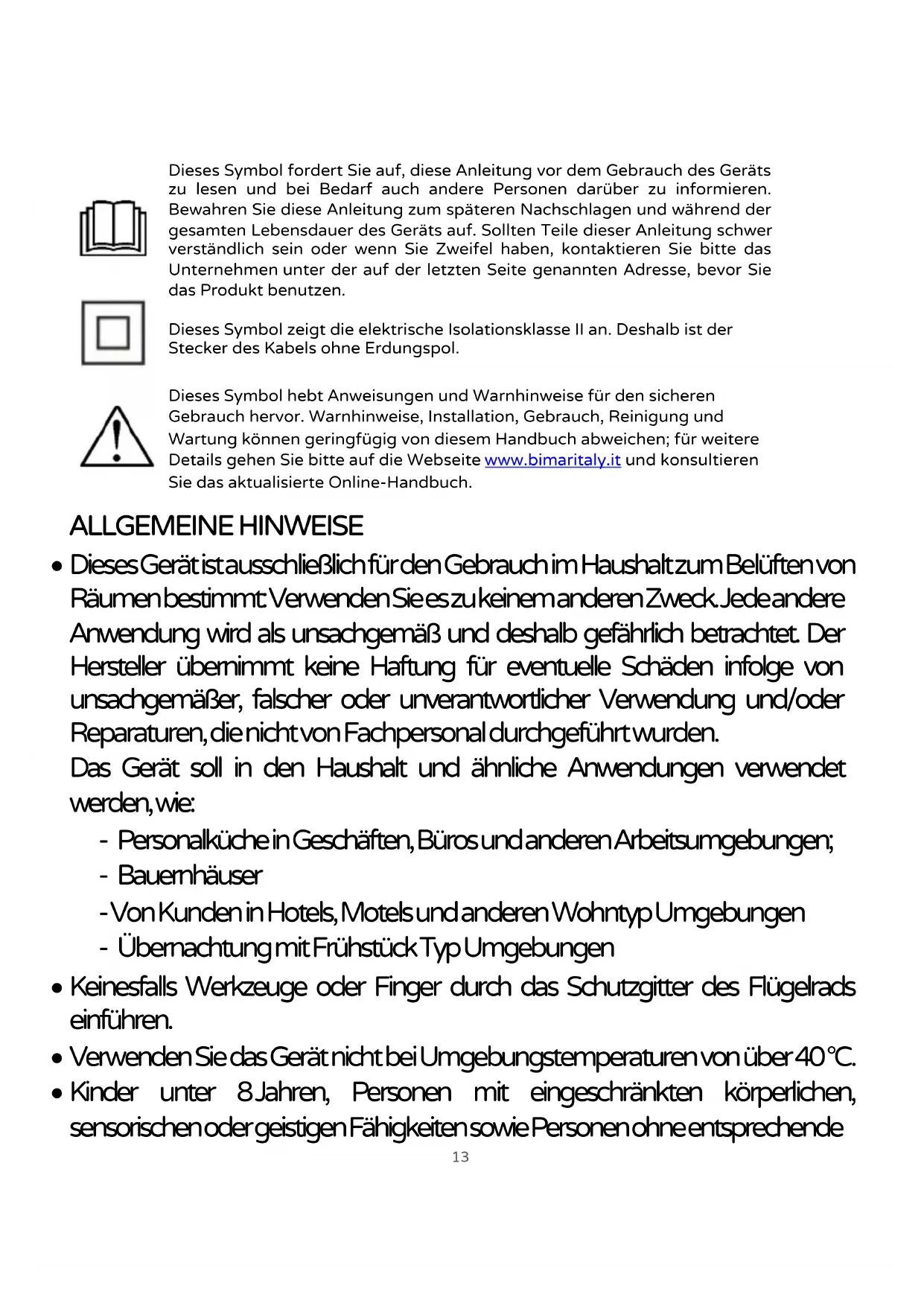 Dieses Symbol hebts Anweisungen und Warnhinweise für den sicheren Gebrauch hervor. Warnhinweise, Installation, Gebrauch, Reinigung und Wartung können geringfügig von diesen Handbuch abweichen; für weitere Details gehen Sieitte auf die Website www.bimaritaly.it und konsultieren Sie das aktualisierte Online-Handbuch.