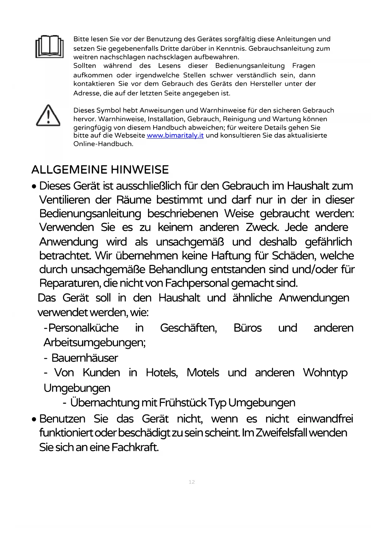 Sollten während des Lesens dieser Bedienungsanleitung Fragen aufkommen oder irgendwelche Stellen schwer verständlich sein, dann kontaktieren Sie vor dem Gebrauch des Geräts den Hersteller unter der Adresse, die auf der letzten Seite angegeben ist. Dieses Symbol hebt Anweisungen und Warnhinweise für den sicheren Gebrauch hervor. Warnhinweise, Installation, Gebrauch, Reinigung und Wartung können geringfügig von diesem Handbuch abweichen; für weitere Details gehen Sie bitte auf die Webseite www.bimaritaly.it und konsultieren Sie das aktualisierte Online-Handbuch. ALLGEMEINE HINWEISE