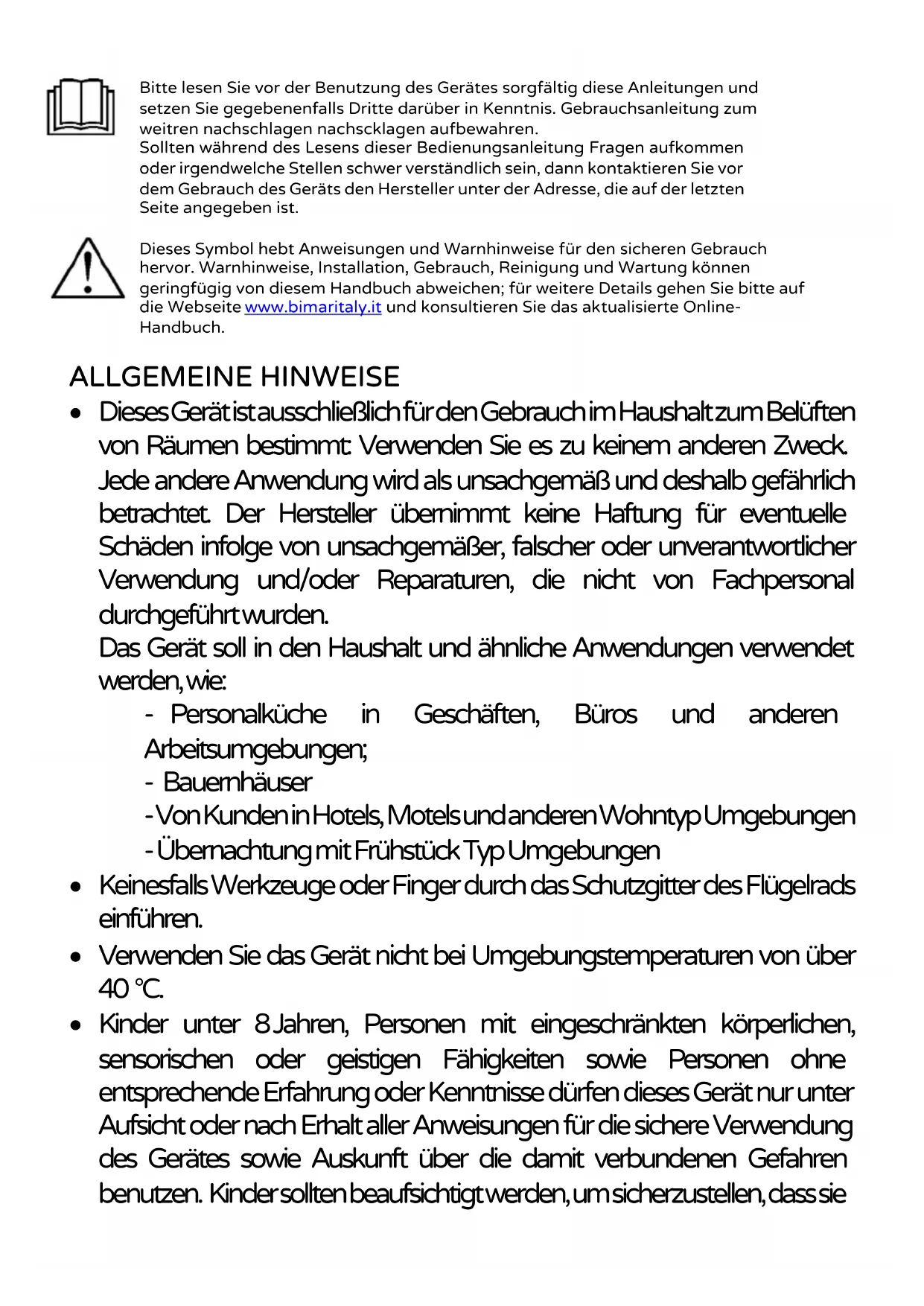 Dieses Symbol hebt Anweisungen und Warnhinweise für den sicheren Gebrauch hervor. Warnhinweise, Installation, Gebrauch, Reinigung und Wartung können geringfügig von diesem Handbuch abweichen; für weitere Details gehen Sie bitte auf die Webseite www.bimaritaly.it und konsultieren Sie das aktualisierte Online- Handbuch. ALLGEMEINE HINWEISE