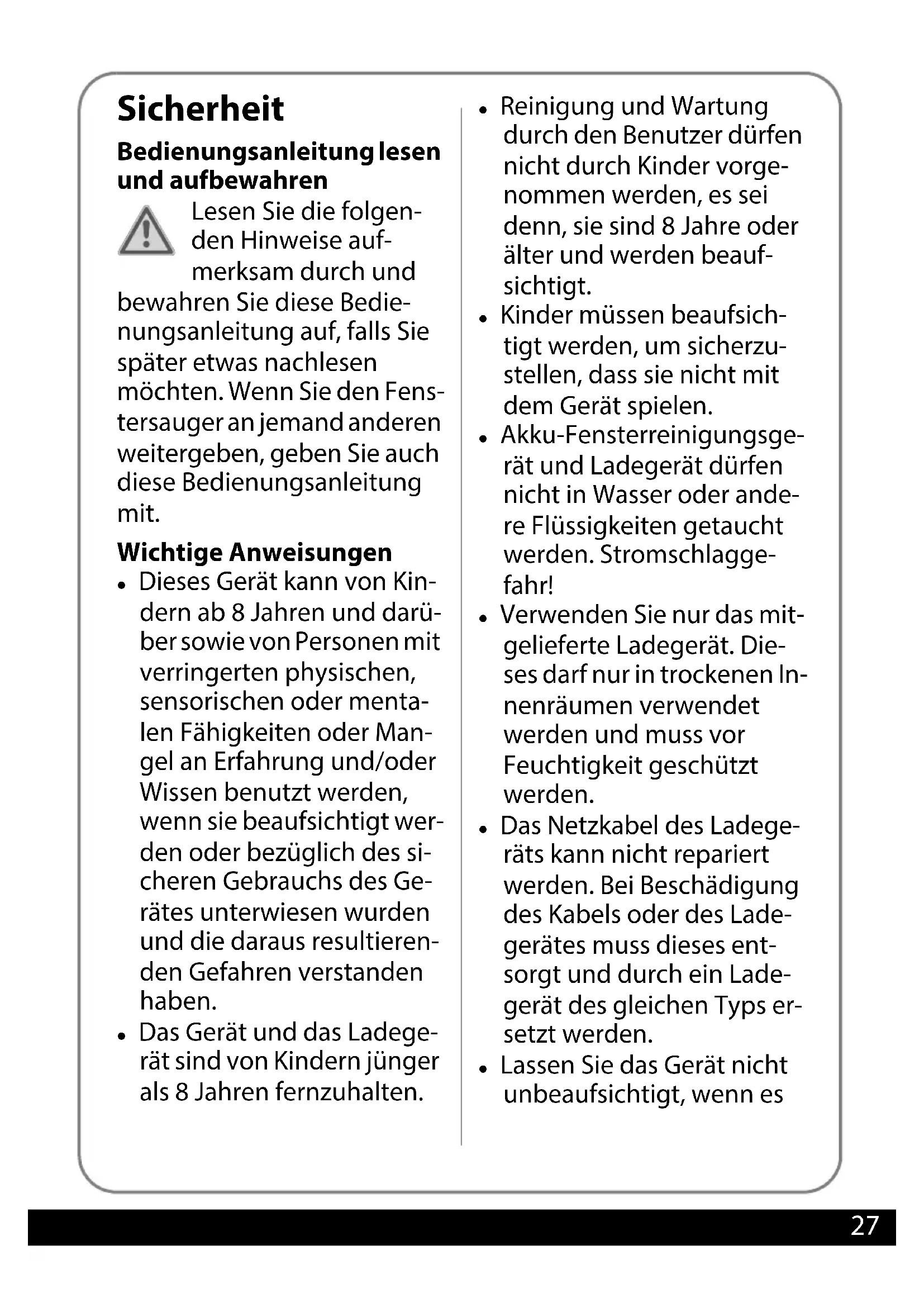 - Konformitätserklärung Lieferumfang z Akku-Fensterreinigungsgerätz Ladegerätz Sprühflaschez Mikrofaserbezug (2x)z Bedienungsanleitung Druckbuch Fensterreiniger BEL QUIGG.book Seite 26 Freitag, 17. November 2017 9:16 0927 Sicherheit Bedienungsanleitung lesen und aufbewahren Lesen Sie die folgen- den Hinweise auf- merksam durch und bewahren Sie diese Bedie- nungsanleitung auf, falls Sie später etwas nachlesen möchten. Wenn Sie den Fens- tersauger an jemand anderen weitergeben, geben Sie auch diese Bedienungsanleitung mit. Wichtige Anweisungen z Dieses Gerät kann von Kin- dern ab 8 Jahren und darü- ber sowie von Personen mit verringerten physischen, sensorischen oder menta- len Fähigkeiten oder Man- gel an Erfahrung und/oder Wissen benutzt werden, wenn sie beaufsichtigt wer- den oder bezüglich des si- cheren Gebrauchs des Ge- rätes unterwiesen wurden und die daraus resultieren- den Gefahren verstanden haben. z Das Gerät und das Ladege- rät sind von Kindern jünger als 8 Jahren fernzuhalten. z Reinigung und Wartung durch den Benutzer dürfen nicht durch Kinder vorge- nommen werden, es sei denn, sie sind 8 Jahre oder älter und werden beauf- sichtigt. z Kinder müssen beaufsich- tigt werden, um sicherzu- stellen, dass sie nicht mit dem Gerät spielen. z Akku-Fensterreinigungsge- rät und Ladegerät dürfen nicht in Wasser oder ande- re Flüssigkeiten getaucht werden. Stromschlagge- fahr! z Verwenden Sie nur das mit- gelieferte Ladegerät. Die- ses darf nur in trockenen In- nenräumen verwendet werden und muss vor Feuchtigkeit geschützt werden. z Das Netzkabel des Ladege- räts kann nicht repariert werden. Bei Beschädigung des Kabels oder des Lade- gerätes muss dieses ent- sorgt und durch ein Lade- gerät des gleichen Typs er- setzt werden. z Lassen Sie das Gerät nicht unbeaufsichtigt, wenn es Druckbuch Fensterreiniger BEL QUIGG.book Seite 27 Freitag, 17. November 2017 9:16 0928 mit dem Netz verbunden ist. z Verwenden Sie das Gerät nicht - wenn es heruntergefallen ist, - wenn offensichtliche Be- schädigungen sichtbar sind oder - wenn es undicht ist. z Halten Sie das Gerät von Kindern fern, wenn es ein- geschaltet ist oder sich ab- kühlt. Verwendungszweck z Dieses Gerät dient zur Nassreini- gung von Fenstern und sonstigen glatten Oberflächen, die dafür geeignet sind. z Das Gerät ist für den Innenbereich und den Privatgebrauch gedacht. Für den Außenbereich und die gewerbliche Nutzung ist es nicht geeignet. Gefahr für Kinder z Halten Sie Verpackungsbeutel und Schutzfolien von Babys und Klein- kindern fern, es besteht Ersti- ckungsgefahr! Achten Sie auch dar- auf, dass der Verpackungsbeutel nicht über den Kopf gestülpt wird. Gefahr durch Elektrizität z Achten Sie darauf, dass Sie trockene Hände haben und betreiben Sie das Gerät nicht in einer feuchten Umge- bung oder einer Umgebung mit hoher Luftfeuchtigkeit. z Schließen Sie das Ladegerät an eine ordnungsgemäß installierte Steck- dose an, deren Spannung den „Technischen Daten“ entspricht. z Verwenden Sie ausschließlich das mitgelieferten Ladegerät, um den Geräte-Akku aufzuladen. z Achten Sie darauf, dass die Steckdo- se gut zugänglich ist, damit Sie im Bedarfsfall schnell das Ladegerät von der Stromversorgung trennen können. z Wickeln Sie das Ladekabel vor dem Aufladen vollständig ab. Achten Sie dabei darauf, dass es nicht durch scharfe Kanten oder heiße Gegen- stände beschädigt wird. z Trennen Sie Ladegerät und Fenster- reiniger und trennen Sie das Lade- gerät aus der Steckdose: – wenn der Akku aufgeladen ist, – wenn während des Ladevor- gangs offensichtlich eine Stö- rung auftritt (z. B. Qualm, Geruch etc.), – bevor Sie das Gerät reinigen oder wegpacken, – bei Gewitter. Ziehen Sie dabei immer am Ste- cker des Ladegeräts, nicht am Kabel. z Nehmen Sie keine Veränderungen an dem Gerät vor. Falls das Gerät, beschädigt ist, müssen Sie es durch eine Fachwerkstatt reparieren las- sen, um Gefährdungen zu vermei- den. Beachten Sie auch die Garan- tiebedingungen. z Führen Sie vor jedem Gebrauch eine Sichtkontrolle durch. Wenn Sie Schäden bemerken, dürfen Sie das Gerät erst wieder benutzen, wenn Druckbuch Fensterreiniger BEL QUIGG.book Seite 28 Freitag, 17. November 2017 9:16 0929 der Schaden von einer Fachwerk- statt behoben wurde. z Stellen Sie das Gerät nicht in Pfüt- zen oder sonstige Flüssigkeitsan- sammlungen. Gefahr von Brand z Saugen Sie keine brennenden oder glühenden Gegenstände wie Ziga- retten, Streichhölzer oder glühende Asche mit dem Gerät auf. z Verwenden Sie das Gerät nicht zum Aufnehmen von entzündlichen oder brennbaren Flüssigkeiten wie Benzin. Verwenden Sie das Gerät auch nicht in Bereichen, in denen solche Flüssigkeiten vorkommen könnten. Gefahr von Verletzungen z Nehmen Sie das Gerät nicht in Betrieb, wenn es offensichtlich beschädigt ist, Teile lose sind oder fehlen oder Sicherheitseinrichtun- gen oder andere Teile nicht ein- wandfrei funktionieren. z Nehmen Sie keine Veränderungen an dem Gerät vor. Lassen Sie Repa- raturen ausschließlich von einer Fachwerkstatt durchführen, um Gefährdungen zu vermeiden. z Bei falscher Anwendung kann Flüs- sigkeit aus den Akkus austreten. Vermeiden Sie den Kontakt damit. Bei zufälligem Kontakt mit Wasser abspülen. Wenn die Flüssigkeit in die Augen kommt, nehmen Sie zusätzlich ärztliche Hilfe in Anspruch. Austretende Akkuflüs- sigkeit kann zu Hautreizungen oder Verbrennungen führen. z Bewahren Sie das Gerät nach dem Gebrauch an einem sicheren Ort auf, um Unfälle zu vermeiden. Achtung - Sachschäden z Benutzen Sie kein Zubehör eines anderen Herstellers. Benutzen Sie den Fensterreiniger ausschließlich so, wie es in der Anleitung beschrie- ben ist. z Verwenden Sie nur das mitgeliefer- te, bereits eingesetzte Akkupack. Verwenden Sie keine anderen Akkus und keine nicht aufladbaren Batterien. z Schalten Sie bei ungewöhnlichen Geräuschen den Fensterreiniger sofort aus. z Saugen Sie keine Schnüre, 