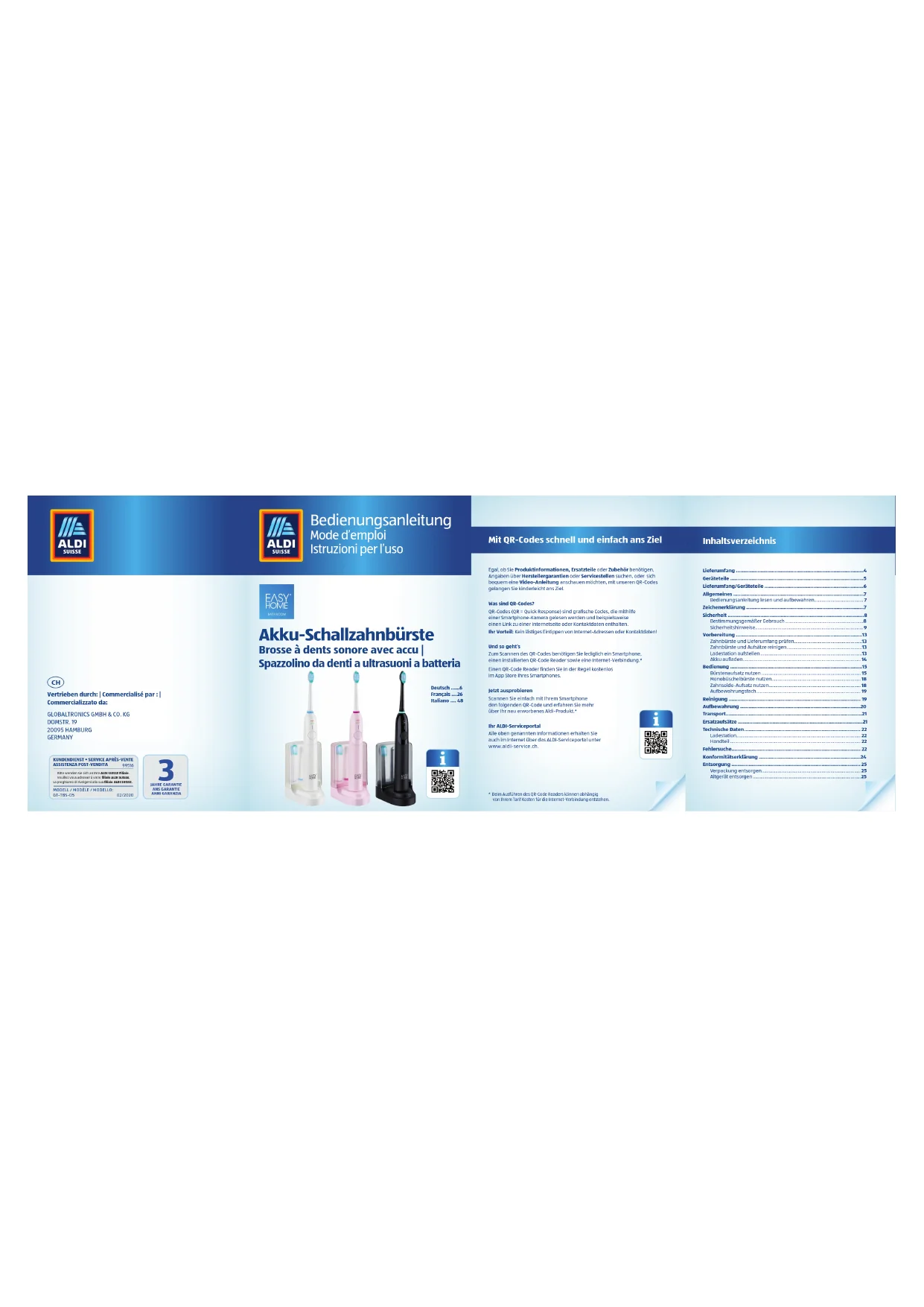 - InhaltsverzeichnisMit QR-Codes schnell und einfach ans Ziel Egal, ob Sie Produktinformationen, Ersatzteile oder Zubehör benötigen, Angaben über Herstellergarantien oder Servicestellen suchen, oder sich bequem eine Video-Anleitung anschauen möchten, mit unseren QR-Codes gelangen Sie kinderleicht ans Ziel.Was sind QR-Codes?QR-Codes (QR = Quick Response) sind grafische Codes, die mithilfe einer Smartphone-Kamera gelesen werden und beispielsweise einen Link zu einer Internetseite oder Kontaktdaten enthalten.Ihr Vorteil: Kein lästiges Eintippen von Internet-Adressen oder Kontaktdaten!Und so geht‘sZum Scannen des QR-Codes benötigen Sie lediglich ein Smartphone, einen installierten QR-Code Reader sowie eine Internet-Verbindung.*Einen QR-Code Reader finden Sie in der Regel kostenlos im App Store Ihres Smartphones.Jetzt ausprobierenScannen Sie einfach mit Ihrem Smartphone den folgenden QR-Code und erfahren Sie mehr über Ihr neu erworbenes Aldi-Produkt.*Ihr ALDI-ServiceportalAlle oben genannten Informationen erhalten Sie auch im Internet über das ALDI-Serviceportal unterwww.aldi-service.ch.* Beim Ausführen des QR-Code Readers können abhängig von Ihrem Tarif Kosten für die Internet-Verbindung entstehen. Akku-Schallzahnbürste Brosse à dents sonore avec accu | Spazzolino da denti a ultrasuoni a batteria Lieferumfang p. 4