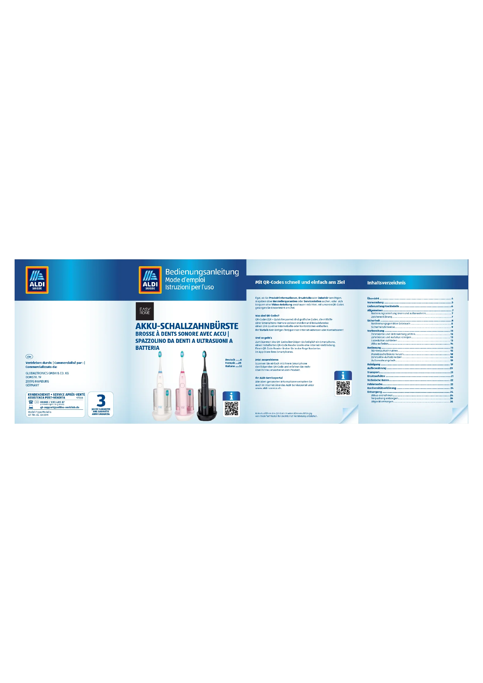 JAHRE GARANTIE ANS GARANTIE ANNI GARANZIA Inhaltsverzeichnis Mit QR-Codes schnell und einfach ans Ziel Egal, ob Sie Produktinformationen, Ersatzteile oder Zubehör benötigen, Angaben über Herstellergarantien oder Servicestellen suchen, oder sich bequem eine Video-Anleitung anschauen möchten, mit unseren QR-Codes gelangen Sie kinderleicht ans Ziel.Was sind QR-Codes?QR-Codes (QR = Quick Response) sind grafische Codes, die mithilfe einer Smartphone-Kamera gelesen werden und beispielsweise einen Link zu einer Internetseite oder Kontaktdaten enthalten.Ihr Vorteil: Kein lästiges Eintippen von Internet-Adressen oder Kontaktdaten!Und so geht‘sZum Scannen des QR-Codes benötigen Sie lediglich ein Smartphone, einen installierten QR-Code Reader sowie eine Internet-Verbindung. Einen QR-Code Reader finden Sie in der Regel kostenlos im App Store Ihres Smartphones.Jetzt ausprobierenScannen Sie einfach mit Ihrem Smartphone den folgenden QR-Code und erfahren Sie mehr über Ihr neu erworbenes Aldi-Produkt.Ihr ALDI-ServiceportalAlle oben genannten Informationen erhalten Sie auch im Internet über das ALDI-Serviceportal unterwww.aldi-service.ch. Beim Ausführen des QR-Code Readers können abhängig von Ihrem Tarif Kosten für die Internet-Verbindung entstehen. AKKU-SCHALLZAHNBÜRSTE