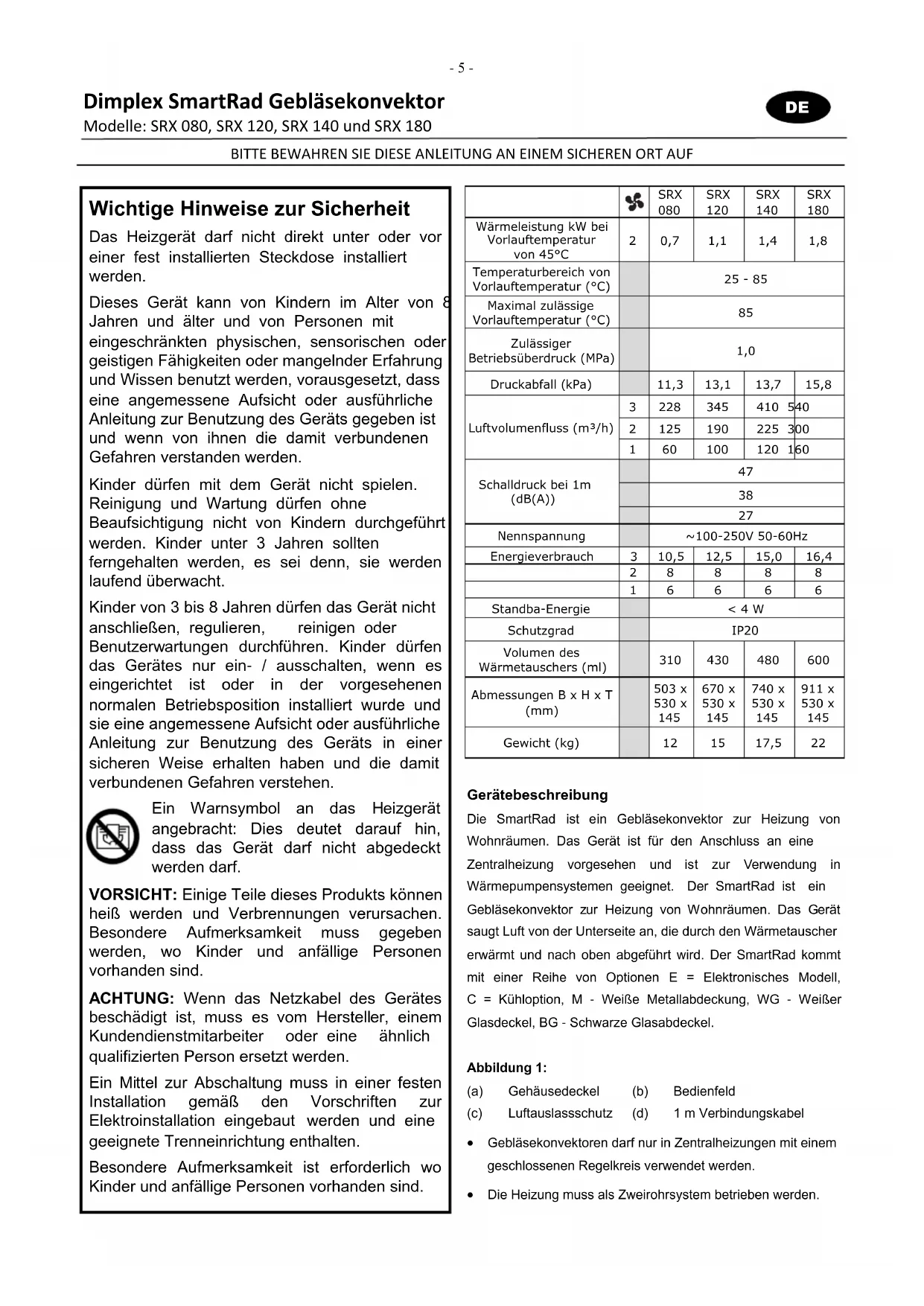 Dimplex SmartRad Gebläsekonvektor Modelle: SRX 080, SRX 120, SRX 140 und SRX 180 Wichtige Hinweise zur Sicherheit Das Heizgerät darf nicht direkt unter oder vor einer fest installierten Steckdose installiert werden. Dieses Gerät kann von Kindern im Alter von 8 Jahren und älter und von Personen mit eingeschränkten physischen, sensorischen oder geistigen Fähigkeiten oder mangelnder Erfahrung und Wissen benutzt werden, vorausgesetzt, dass eine angemessene Aufsicht oder ausführliche Anleitung zur Benutzung des Geräts gegeben ist und wenn von ihnen die damit verbundenen Gefahren verstanden werden. Kinder dürfen mit dem Gerät nicht spielen. Reinigung und Wartung dürfen ohne Beaufsichtigung nicht von Kindern durchgeführt werden. Kinder unter 3 Jahren sollten ferngehalten werden, es sei denn, sie werden laufend überwacht. Kinder von 3 bis 8 Jahren dürfen das Gerät nicht anschließen, regulieren, reinigen oder Benutzerwartungen durchführen. Kinder dürfen das Gerätes nur ein- / ausschalten, wenn es eingerichtet ist oder in der vorgesehenen normalen Betriebsposition installiert wurde und sie eine angemessene Aufsicht oder ausführliche Anleitung zur Benutzung des Geräts in einer sicheren Weise erhalten haben und die damit verbundenen Gefahren verstehen. Ein Warnsymbol an das Heizgerät angebracht: Dies deutet darauf hin, dass das Gerät darf nicht abgedeckt werden darf. VORSICHT: Einige Teile dieses Produkts können heiß werden und Verbrennungen verursachen. Besondere Aufmerksamkeit muss gegeben werden, wo Kinder und anfällige Personen vorhanden sind. ACHTUNG: Wenn das Netzkabel des Gerätes beschädigt ist, muss es vom Hersteller, einem Kundendienstmitarbeiter oder eine ähnlich qualifizierten Person ersetzt werden. Ein Mittel zur Abschaltung muss in einer festen Installation gemäß den Vorschriften zur Elektroinstallation eingebaut werden und eine geeignete Trenneinrichtung enthalten. Besondere Aufmerksamkeit ist erforderlich wo Kinder und anfällige Personen vorhanden sind. BITTE BEWAHREN SIE DIESE ANLEITUNG AN EINEM SICHEREN ORT AUF Gerätebeschreibung Die SmartRad ist ein Gebläsekonvektor zur Heizung von Wohnräumen. Das Gerät ist für den Anschluss an eine Zentralheizung vorgesehen und ist zur Verwendung in Wärmepumpensystemen geeignet. Der SmartRad ist ein Gebläsekonvektor zur Heizung von Wohnräumen. Das Gerät saugt Luft von der Unterseite an, die durch den Wärmetauscher erwärmt und nach oben abgeführt wird. Der SmartRad kommt mit einer Reihe von Optionen E = Elektronisches Modell, C = Kühloption, M - Weiße Metallabdeckung, WG - Weißer Glasdeckel, BG - Schwarze Glasabdeckel. Abbildung 1: (a) Gehäusedeckel (b) Bedienfeld (c) Luftauslassschutz (d) 1 m Verbindungskabel Gebläsekonvektoren darf nur in Zentralheizungen mit einem geschlossenen Regelkreis verwendet werden. Die Heizung muss als Zweirohrsystem betrieben werden. SRX
