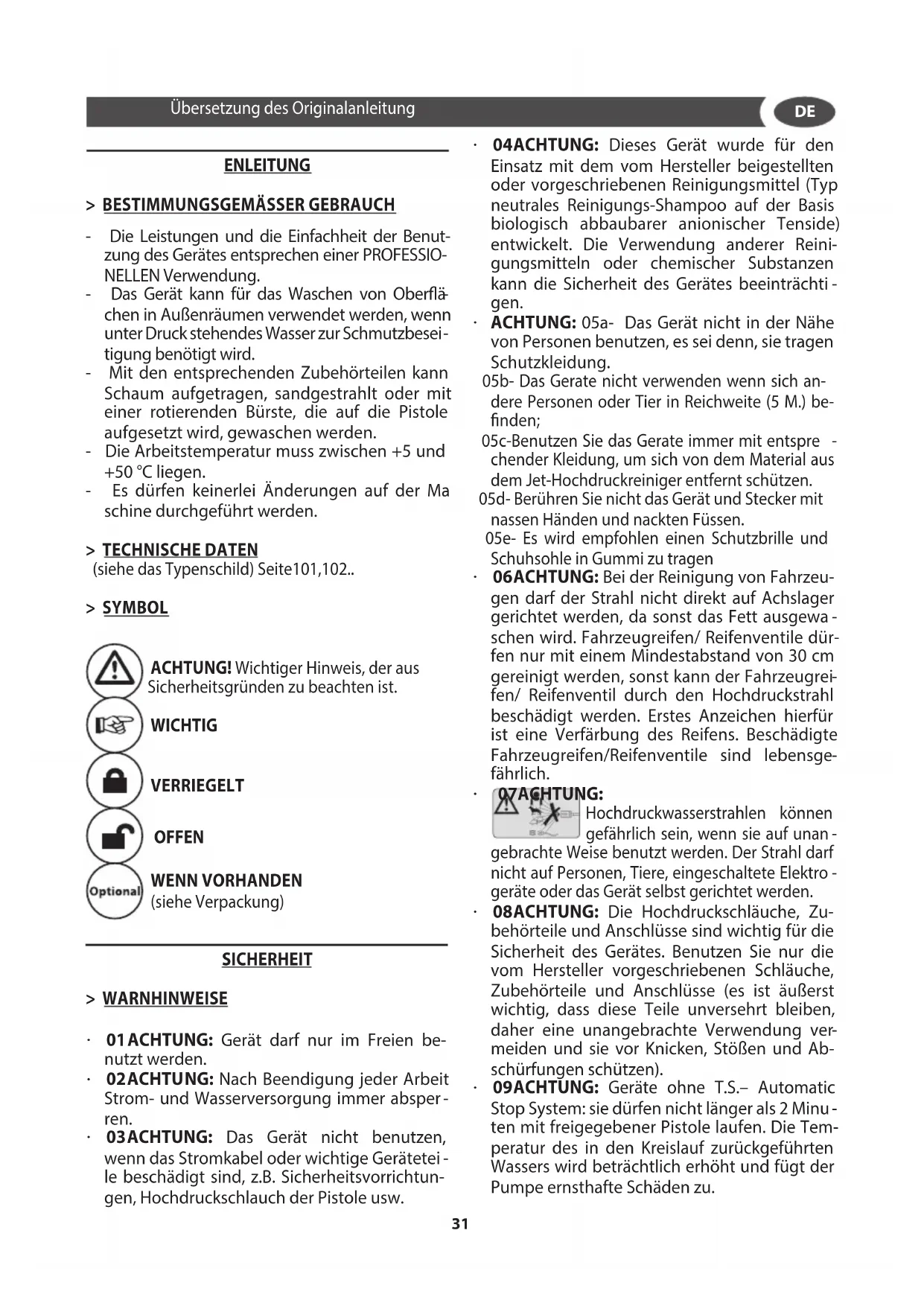 schine durchgeführt werden. > TECHNISCHE DATEN (siehe das Typenschild) Seite101,102.. > SYMBOL ACHTUNG! Wichtiger Hinweis, der aus Sicherheitsgründen zu beachten ist. WICHTIG VERRIEGELT OFFEN WENN VORHANDEN (siehe Verpackung) SICHERHEIT > WARNHINWEISE