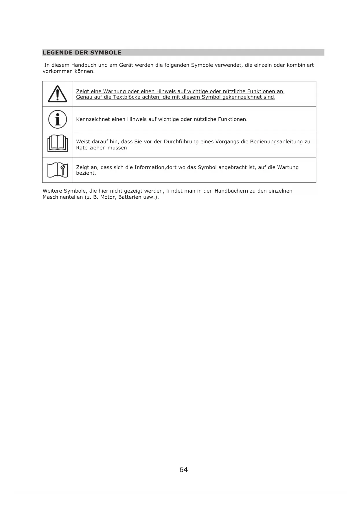 In diesem Handbuch und am Gerät werden die folgenden Symbole verwendet, die einzeln oder kombiniert vorkommen können. Zeigt eine Warnung oder einen Hinweis auf wichtige oder nützliche Funktionen an. Genau auf die Textblöcke achten, die mit diesem Symbol gekennzeichnet sind. Kennzeichnet einen Hinweis auf wichtige oder nützliche Funktionen. Weist darauf hin, dass Sie vor der Durchführung eines Vorgangs die Bedienungsanleitung zu Rate ziehen müssen Zeigt an, dass sich die Information,dort wo das Symbol angebracht ist, auf die Wartung bezieht. Weitere Symbole, die hier nicht gezeigt werden, ndet man in den Handbüchern zu den einzelnen Maschinenteilen (z. B. Motor, Batterien usw.).65