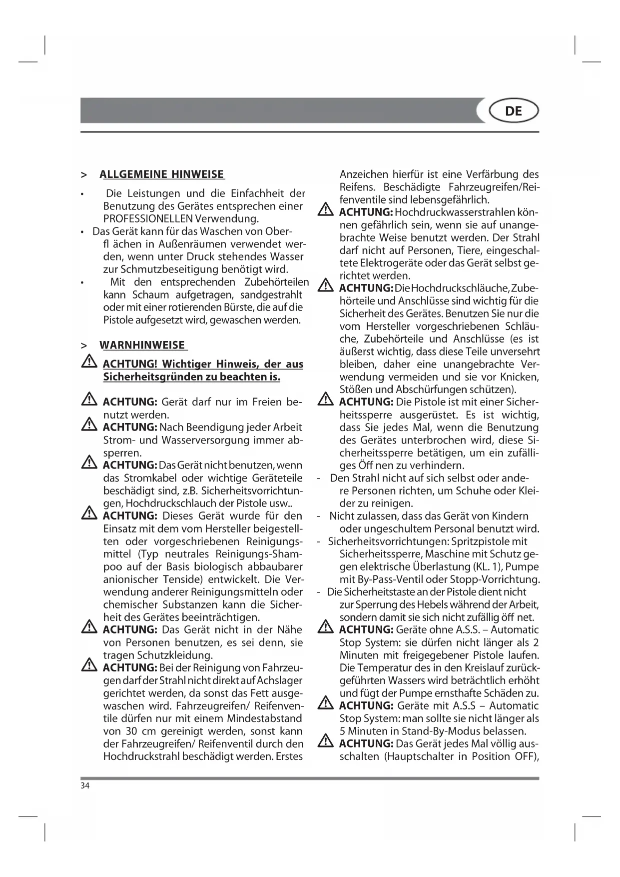 - Mit den entsprechenden Zubehörteilen kann Schaum aufgetragen, sandgestrahlt oder mit einer rotierenden Bürste, die auf die Pistole aufgesetzt wird, gewaschen werden. > WARNHINWEISE ACHTUNG! Wichtiger Hinweis, der aus Sicherheitsgründen zu beachten is. ACHTUNG: Gerät darf nur im Freien be- nutzt werden. ACHTUNG: Nach Beendigung jeder Arbeit Strom- und Wasserversorgung immer ab- sperren. ACHTUNG: Das Gerät nicht benutzen, wenn das Stromkabel oder wichtige Geräteteile beschädigt sind, z.B. Sicherheitsvorrichtun- gen, Hochdruckschlauch der Pistole usw.. ACHTUNG: Dieses Gerät wurde für den Einsatz mit dem vom Hersteller beigestell- ten oder vorgeschriebenen Reinigungs- mittel (Typ neutrales Reinigungs-Sham- poo auf der Basis biologisch abbaubarer anionischer Tenside) entwickelt. Die Ver- wendung anderer Reinigungsmitteln oder chemischer Substanzen kann die Sicher- heit des Gerätes beeinträchtigen. ACHTUNG: Das Gerät nicht in der Nähe von Personen benutzen, es sei denn, sie tragen Schutzkleidung. ACHTUNG: Bei der Reinigung von Fahrzeu- gen darf der Strahl nicht direkt auf Achslager gerichtet werden, da sonst das Fett ausge- waschen wird. Fahrzeugreifen/ Reifenven- tile dürfen nur mit einem Mindestabstand von 30 cm gereinigt werden, sonst kann der Fahrzeugreifen/ Reifenventil durch den Hochdruckstrahl beschädigt werden. Erstes Anzeichen hierfür ist eine Verfärbung des Reifens. Beschädigte Fahrzeugreifen/Rei- fenventile sind lebensgefährlich. ACHTUNG: Hochdruckwasserstrahlen kön- nen gefährlich sein, wenn sie auf unange- brachte Weise benutzt werden. Der Strahl darf nicht auf Personen, Tiere, eingeschal- tete Elektrogeräte oder das Gerät selbst ge- richtet werden. ACHTUNG: Die Hochdruckschläuche, Zube- hörteile und Anschlüsse sind wichtig für die Sicherheit des Gerätes. Benutzen Sie nur die vom Hersteller vorgeschriebenen Schläu- che, Zubehörteile und Anschlüsse (es ist äußerst wichtig, dass diese Teile unversehrt bleiben, daher eine unangebrachte Ver- wendung vermeiden und sie vor Knicken, Stößen und Abschürfungen schützen). ACHTUNG: Die Pistole ist mit einer Sicher- heitssperre ausgerüstet. Es ist wichtig, dass Sie jedes Mal, wenn die Benutzung des Gerätes unterbrochen wird, diese Si- cherheitssperre betätigen, um ein zufälli- ges Ö nen zu verhindern. - Den Strahl nicht auf sich selbst oder ande- re Personen richten, um Schuhe oder Klei- der zu reinigen. - Nicht zulassen, dass das Gerät von Kindern oder ungeschultem Personal benutzt wird. - Sicherheitsvorrichtungen: Spritzpistole mit Sicherheitssperre, Maschine mit Schutz ge- gen elektrische Überlastung (KL. 1), Pumpe mit By-Pass-Ventil oder Stopp-Vorrichtung. - Die Sicherheitstaste an der Pistole dient nicht zur Sperrung des Hebels während der Arbeit, sondern damit sie sich nicht zufällig ö net. ACHTUNG: Geräte ohne A.S.S. – Automatic Stop System: sie dürfen nicht länger als 2 Minuten mit freigegebener Pistole laufen. Die Temperatur des in den Kreislauf zurück- geführten Wassers wird beträchtlich erhöht und fügt der Pumpe ernsthafte Schäden zu. ACHTUNG: Geräte mit A.S.S – Automatic Stop System: man sollte sie nicht länger als 5 Minuten in Stand-By-Modus belassen. ACHTUNG: Das Gerät jedes Mal völlig aus- schalten (Hauptschalter in Position OFF),35