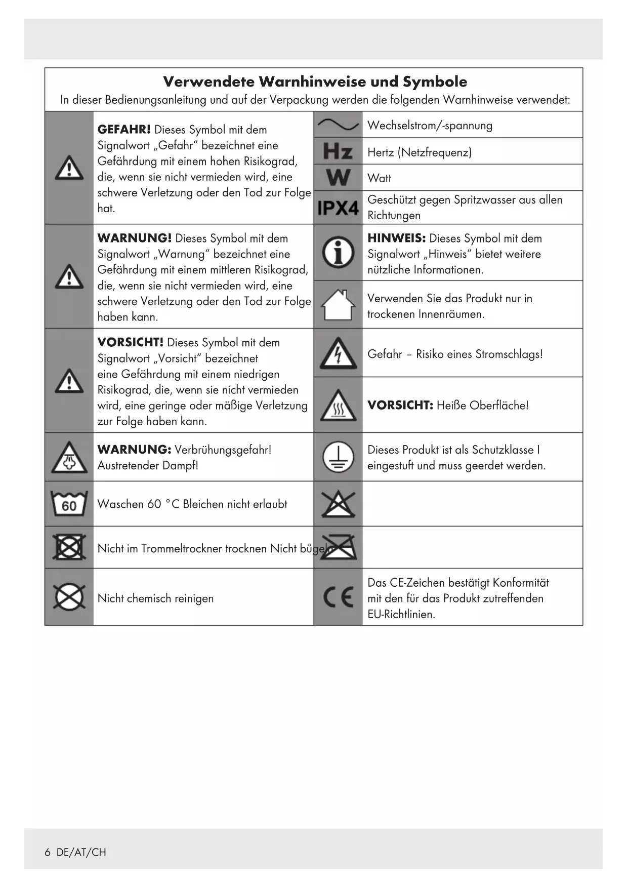 165 DE/AT/CH Verwendete Warnhinweise und Symbole...............................Seite 6 Einleitung ....................................................................Seite 7 Bestimmungsgemäße Verwendung .................................................Seite 7 Lieferumfang...................................................................Seite 8 Teilebeschreibung ..............................................................Seite 8 Technische Daten ...............................................................Seite 8 Sicherheitshinweise ........................................................Seite 8 Vor der ersten Verwendung...............................................Seite 12 Zubehör und Anwendungsbereiche......................................Seite 12 Montage .....................................................................Seite 13 Bedienung ...................................................................Seite 13 Wassertank befüllen.............................................................Seite 13 Ein-/Ausschalten................................................................Seite 13 Kindersicherung ................................................................Seite 14 Dampfreinigung ................................................................Seite 14 Reinigung und Pflege ......................................................Seite 14 Haupteinheit reinigen............................................................Seite 14 Zubehör reinigen ...............................................................Seite 14 Kalkablagerungen entfernen ......................................................Seite 15 Lagerung ....................................................................Seite 15 Entsorgung ..................................................................Seite 15 Garantie .....................................................................Seite 16 V2.06 DE/AT/CH Verwendete Warnhinweise und Symbole In dieser Bedienungsanleitung und auf der Verpackung werden die folgenden Warnhinweise verwendet: GEFAHR! Dieses Symbol mit dem Signalwort „Gefahr“ bezeichnet eine Gefährdung mit einem hohen Risikograd, die, wenn sie nicht vermieden wird, eine schwere Verletzung oder den Tod zur Folge hat. Wechselstrom/-spannung Hertz (Netzfrequenz) Watt Geschützt gegen Spritzwasser aus allen Richtungen WARNUNG! Dieses Symbol mit dem Signalwort „Warnung“ bezeichnet eine Gefährdung mit einem mittleren Risikograd, die, wenn sie nicht vermieden wird, eine schwere Verletzung oder den Tod zur Folge haben kann. HINWEIS: Dieses Symbol mit dem Signalwort „Hinweis“ bietet weitere nützliche Informationen. Verwenden Sie das Produkt nur in trockenen Innenräumen. VORSICHT! Dieses Symbol mit dem Signalwort „Vorsicht“ bezeichnet eine Gefährdung mit einem niedrigen Risikograd, die, wenn sie nicht vermieden wird, eine geringe oder mäßige Verletzung zur Folge haben kann. Gefahr – Risiko eines Stromschlags! VORSICHT: Heiße Oberfläche! WARNUNG: Verbrühungsgefahr! Austretender Dampf! Dieses Produkt ist als Schutzklasse I eingestuft und muss geerdet werden. Waschen 60 °C Bleichen nicht erlaubt Nicht im Trommeltrockner trocknen Nicht bügeln Nicht chemisch reinigen Das CE-Zeichen bestätigt Konformität mit den für das Produkt zutreffenden EU-Richtlinien.7 DE/AT/CH HAND-DAMPFREINIGER Einleitung Wir beglückwünschen Sie zum Kauf Ihres neuen Produkts. Sie haben sich damit für ein hochwertiges Produkt entschieden. Die Bedienungsanleitung ist Teil dieses Produkts. Sie enthält wichtige Hinweise für Sicherheit, Gebrauch und Entsorgung. Machen Sie sich vor der Benutzung des Produkts mit allen Bedien- und Sicherheitshinweisen vertraut. Benutzen Sie das Produkt nur wie beschrieben und für die angegebenen Einsatzbereiche. Händigen Sie alle Unterlagen bei Weitergabe des Produkts an Dritte mit aus. Bestimmungsgemäße Verwendung Dieses Produkt ist ausschließlich zur Reinigung von Oberflächen in Innenbereichen vorgesehen, die einer langen Behandlung durch heißen Dampf standhalten. Geeignet für: Fliesen, Arbeitsflächen, Kacheln, Spiegel, Fenster, Jalousien, WCs, Armaturen, Vorhänge, Polstermöbel, Kleidungsstücke, Autositze. Nicht geeignet für: Leder, polierte Möbel, gewachste Fußböden, synthetische Materialien, Samt und andere empfindliche, nicht dampfbeständige Materialien. Die Verwendung an gewachsten oder einigen ungewachsten Fußböden kann zu einer Reduzierung des Glanzes führen. Vor der Verwendung: Wir empfehlen, einen Materialtest an einer unauffälligen Stelle der zu behandelnden Oberfläche vorzunehmen. Für beste Reinigungsergebnisse: Beachten Sie die Pflegehinweise des jeweiligen Herstellers (sofern vorhanden). Verwenden Sie das Produkt nicht für andere Zwecke. Das Produkt ist ausschließlich für die Nutzung in privaten Haushalten und nicht für gewerbliche Zwecke vorgesehen. Der Hersteller übernimmt keine Haftung für Schäden aufgrund unsachgemäßer Verwendung. Vor der Verwendung: Führen Sie einen Test an einer unauffälligen Stelle durch. Dadurch können Sie prüfen, ob das Material für die Dampfreinigung geeignet ist. Beispiele: Gestrichenes/lackiertes Holz oder Leder können durch Dampf ausbleichen. Unbehandeltes Holz kann aufgrund des Dampfes aufquellen. Schutzwachs-Beschichtungen können vom Dampf aufgelöst werden. Kunststoffe können durch Dampf matt werden. Weiche Kunststoffe können sich verformen, wenn sie Dampf ausgesetzt sind. Kalte Glas- oder Spiegelflächen können zerbrechen, wenn sie mit heißem Dampf besprüht werden. Acryl, Samt und Seide reagieren empfindlich auf heißen Dampf. Wenn Sie Fenster reinigen möchten, sollten Sie diese zunächst vorwärmen: Wenden Sie den Dampf aus größerer Entfernung über große Flächen an. Reduzieren Sie dann schrittweise die Entfernung.8 DE/AT/CH Lieferumfang Überprüfen Sie nach dem Auspacken des Produkts, ob die Lieferung vollständig ist und alle Teile in ordnungsgemäßem Zustand sind. Entfe