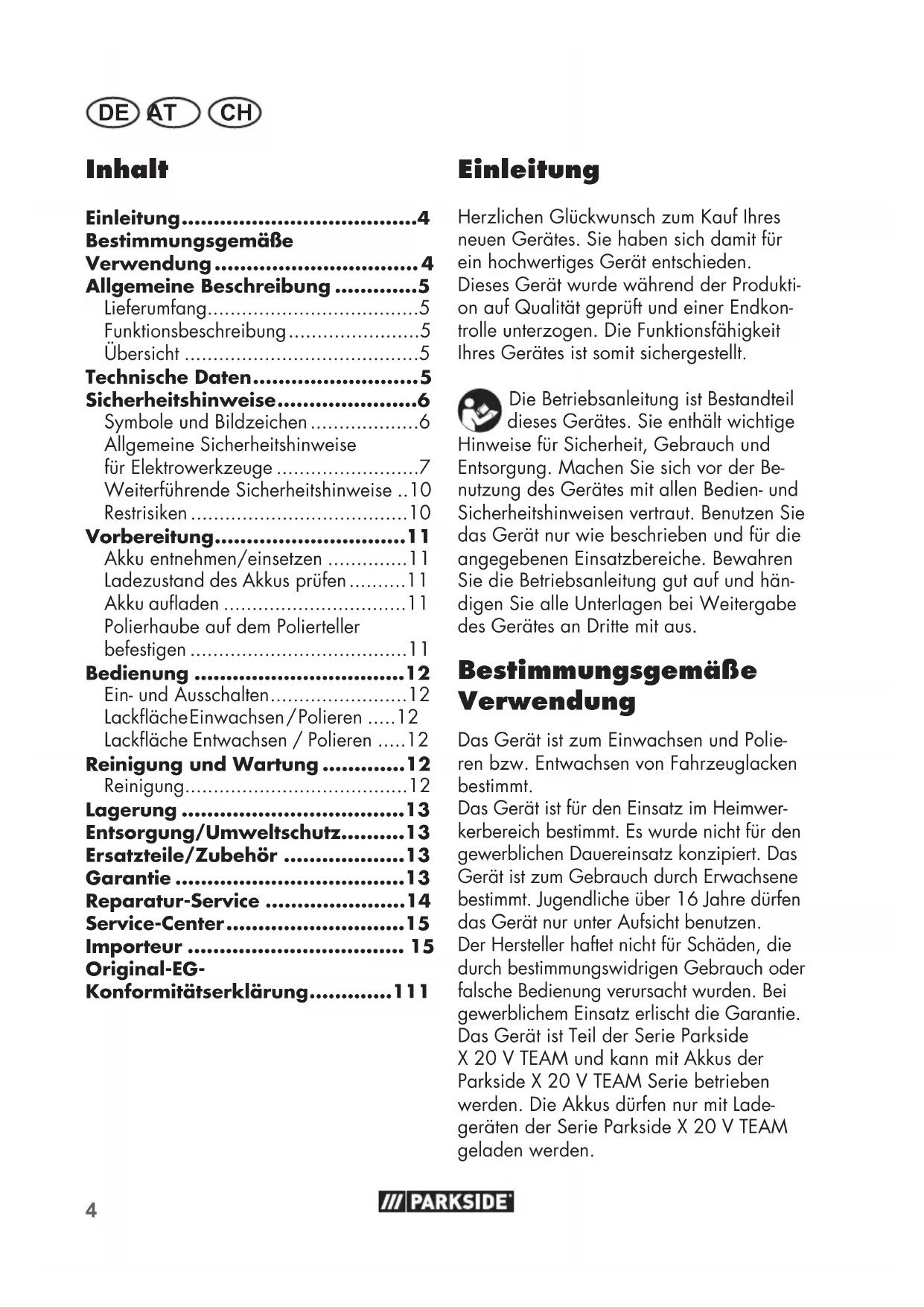 Der Hersteller haftet nicht für Schäden, die durch bestimmungswidrigen Gebrauch oder falsche Bedienung verursacht wurden. Bei gewerblichem Einsatz erlischt die Garantie. Das Gerät ist Teil der Serie Parkside X 20 V TEAM und kann mit Akkus der Parkside X 20 V TEAM Serie betrieben werden. Die Akkus dürfen nur mit Ladegeräten der Serie Parkside X 20 V TEAM geladen werden.