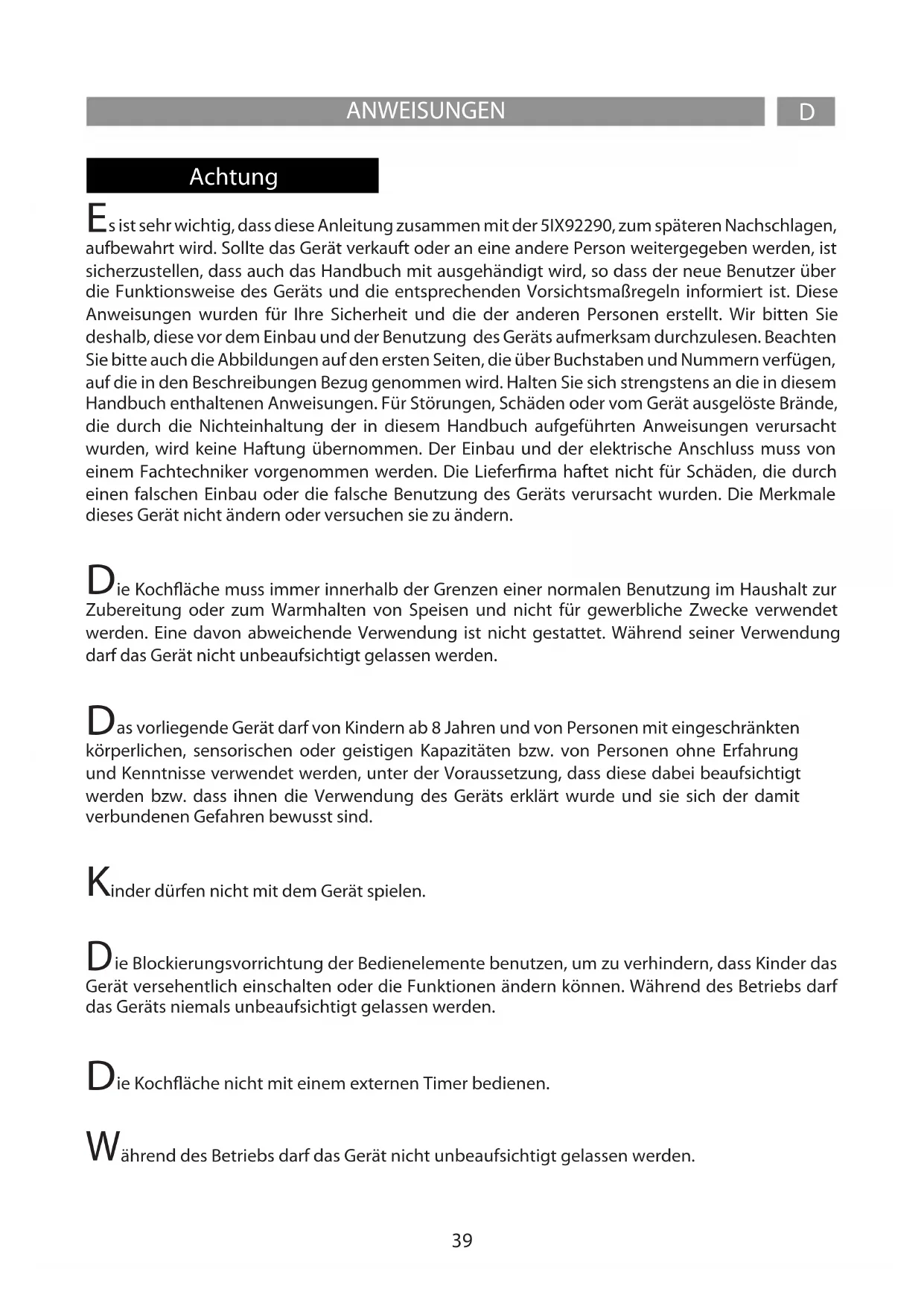 s ist sehr wichtig, dass diese Anleitung zusammen mit der 5IX92290, zum späteren Nachschlagen, aufbewahrt wird. Sollte das Gerät verkauft oder an eine andere Person weitergegeben werden, ist sicherzustellen, dass auch das Handbuch mit ausgehändigt wird, so dass der neue Benutzer über die Funktionsweise des Geräts und die entsprechenden Vorsichtsmaßregeln informiert ist. Diese Anweisungen wurden für Ihre Sicherheit und die der anderen Personen erstellt. Wir bitten Sie deshalb, diese vor dem Einbau und der Benutzung des Geräts aufmerksam durchzulesen. Beachten Sie bitte auch die Abbildungen auf den ersten Seiten, die über Buchstaben und Nummern verfügen, auf die in den Beschreibungen Bezug genommen wird. Halten Sie sich strengstens an die in diesem Handbuch enthaltenen Anweisungen. Für Störungen, Schäden oder vom Gerät ausgelöste Brände, die durch die Nichteinhaltung der in diesem Handbuch aufgeführten Anweisungen verursacht wurden, wird keine Haftung übernommen. Der Einbau und der elektrische Anschluss muss von einem Fachtechniker vorgenommen werden. Die Lieferrma haftet nicht für Schäden, die durch einen falschen Einbau oder die falsche Benutzung des Geräts verursacht wurden. Die Merkmale dieses Gerät nicht ändern oder versuchen sie zu ändern.
