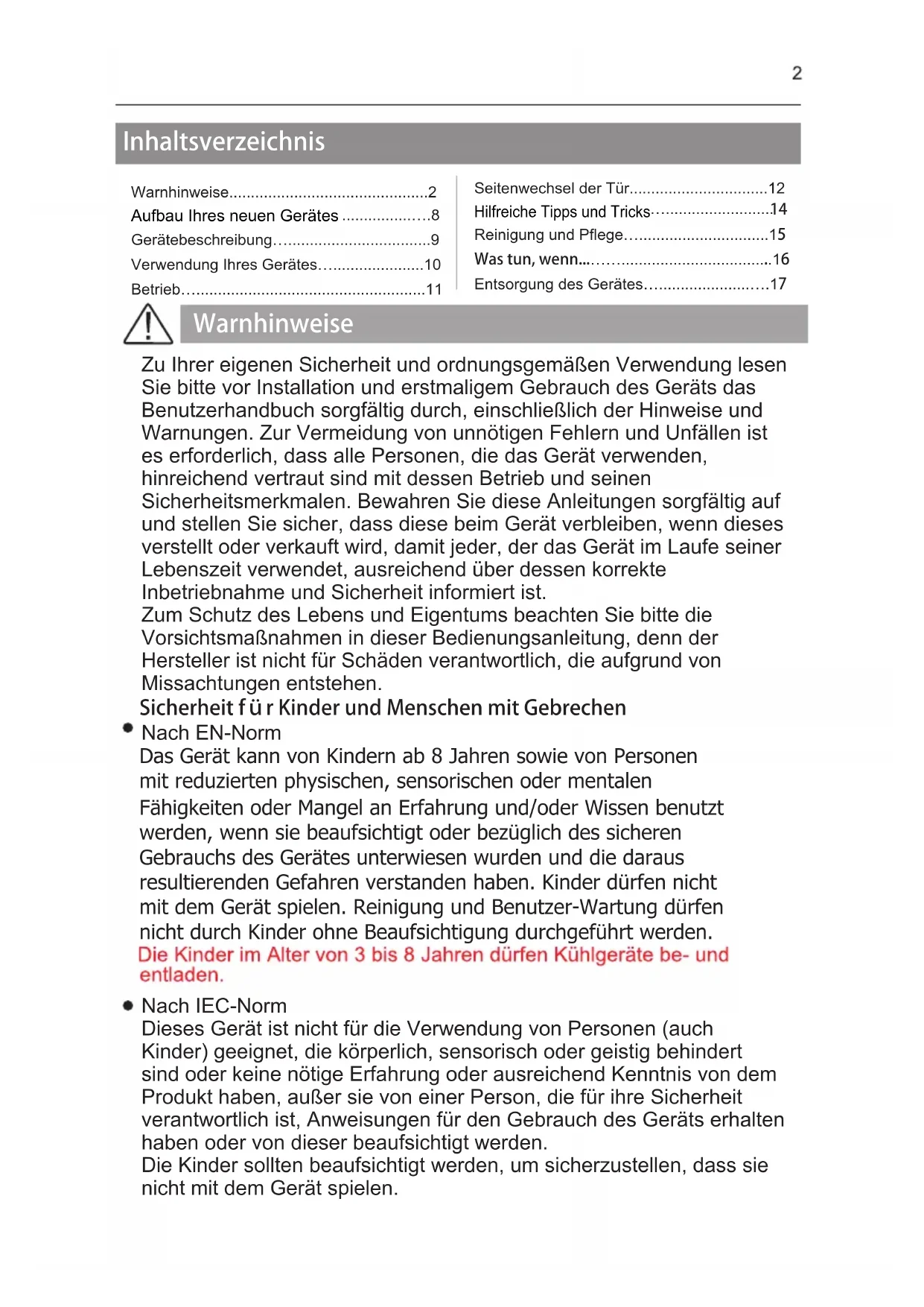 Reinigung und Pflege…..............................15 Was tun, wenn...……...................................16 Entsorgung des Gerätes….....................….17 Warnhinweise Zu Ihrer eigenen Sicherheit und ordnungsgemäßen Verwendung lesen Sie bitte vor Installation und erstmaligem Gebrauch des Geräts das Benutzerhandbuch sorgfältig durch, einschließlich der Hinweise und Warnungen. Zur Vermeidung von unnötigen Fehlern und Unfällen ist es erforderlich, dass alle Personen, die das Gerät verwenden, hinreichend vertraut sind mit dessen Betrieb und seinen Sicherheitsmerkmalen. Bewahren Sie diese Anleitungen sorgfältig auf und stellen Sie sicher, dass diese beim Gerät verbleiben, wenn dieses verstellt oder verkauft wird, damit jeder, der das Gerät im Laufe seiner Lebenszeit verwendet, ausreichend über dessen korrekte Inbetriebnahme und Sicherheit informiert ist. Zum Schutz des Lebens und Eigentums beachten Sie bitte die Vorsichtsmaßnahmen in dieser Bedienungsanleitung, denn der Hersteller ist nicht für Schäden verantwortlich, die aufgrund von Missachtungen entstehen. Sicherheit für Kinder und Menschen mit Gebrechen Nach EN-Norm Nach IEC-Norm Dieses Gerät ist nicht für die Verwendung von Personen (auch Kinder) geeignet, die körperlich, sensorisch oder geistig behindert sind oder keine nötige Erfahrung oder ausreichend Kenntnis von dem Produkt haben, außer sie von einer Person, die für ihre Sicherheit verantwortlich ist, Anweisungen für den Gebrauch des Geräts erhalten haben oder von dieser beaufsichtigt werden. Die Kinder sollten beaufsichtigt werden, um sicherzustellen, dass sie nicht mit dem Gerät spielen. Das Gerät kann von Kindern ab 8 Jahren sowie von Personen mit reduzierten physischen, sensorischen oder mentalen Fähigkeiten oder Mangel an Erfahrung und/oder Wissen benutzt werden, wenn sie beaufsichtigt oder bezüglich des sicheren Gebrauchs des Gerätes unterwiesen wurden und die daraus resultierenden Gefahren verstanden haben. Kinder dürfen nicht mit dem Gerät spielen. Reinigung und Benutzer-Wartung dürfen nicht durch Kinder ohne Beaufsichtigung durchgeführt werden. Aubau hres neuen ertes ilreiche Tipps und TricsHalten Sie alle Verpackungsteile von Kinder fern, weil es die Gefahr des Erstickens besteht. Ziehen Sie den Stecker aus der Buchse, wenn Sie das Gerät entsorgen, schneiden Sie das Verbindungskabel (so nah am Gerät wie möglich) ab und entfernen Sie die Tür, um zu vermeiden, dass spielende Kinder Stromschläge erhalten, wenn sie sich darin einschließen. Wenn Sie das Gerät, mit Magnettürverschluss, gegen eine älteres Gerät mit Schnappschloss an der Tür oder dem Deckel austauschen, achten Sie bitte darauf, das Schnappschloss unbrauchbar zu machen, bevor sie es entsorgen. Dadurch wird die Gefahr vermieden, dass für Kinder daraus eine Todesfalle wird. Allgemeine Sicherheitsvorschriften - Mitarbeiter-Küchenbereiche in Läden, Büros und anderen Arbeitsumgebungen vorgesehen. -Bauernhäuser und von Kunden in Hotels, Motels und anderen Wohnräumen; - Bett- und Frühstück-Typ Umgebungen - Gastronomie und ähnliche Non-Retail-Anwendungen WARNUNG - Bewahren Sie keine explosiven Stoffe wie Spraydosen mit brennbaren Treibmittel in diesem Gerät. WARNUNG - Wenn das Netzkabel beschädigt ist, muss es durch den Hersteller, seinen Kundendienst oder eine ähnlich qualifizierte Person ersetzt werden, um eine Gefahr zu vermeiden . WARNUNG - Verwenden Sie keine mechanischen Vorrichtungen oder anderen Mittel, um den Entfrostungsprozess zu beschleunigen, außer wenn die vom Hersteller empfohlen sind. WARNUNG - Beschädigen Sie den Kältemittelkreislauf nicht. WARNUNG - Verwenden Sie keine elektrischen Geräte innerhalb des Lebensmittellablagefachs des Gerätes, außer wenn sie die vom Hersteller empfohlenen Typen sind. WARNUNG - Dieses Gerät ist für den Haushalt und ähnliche Anwendungen wie WARNUNG - Belüftungsöffnungen im Gerätegehäuse oder im Einbaugehäuse dürfen nicht verschlossen oder blockiert werden.WARNUNG – WARNUNG – dass das Netzkabel nicht eingeklemm t oder beschädigt ist. WARNUNG – tragbare Stromversorgung nicht an der Geräterückseite auf.