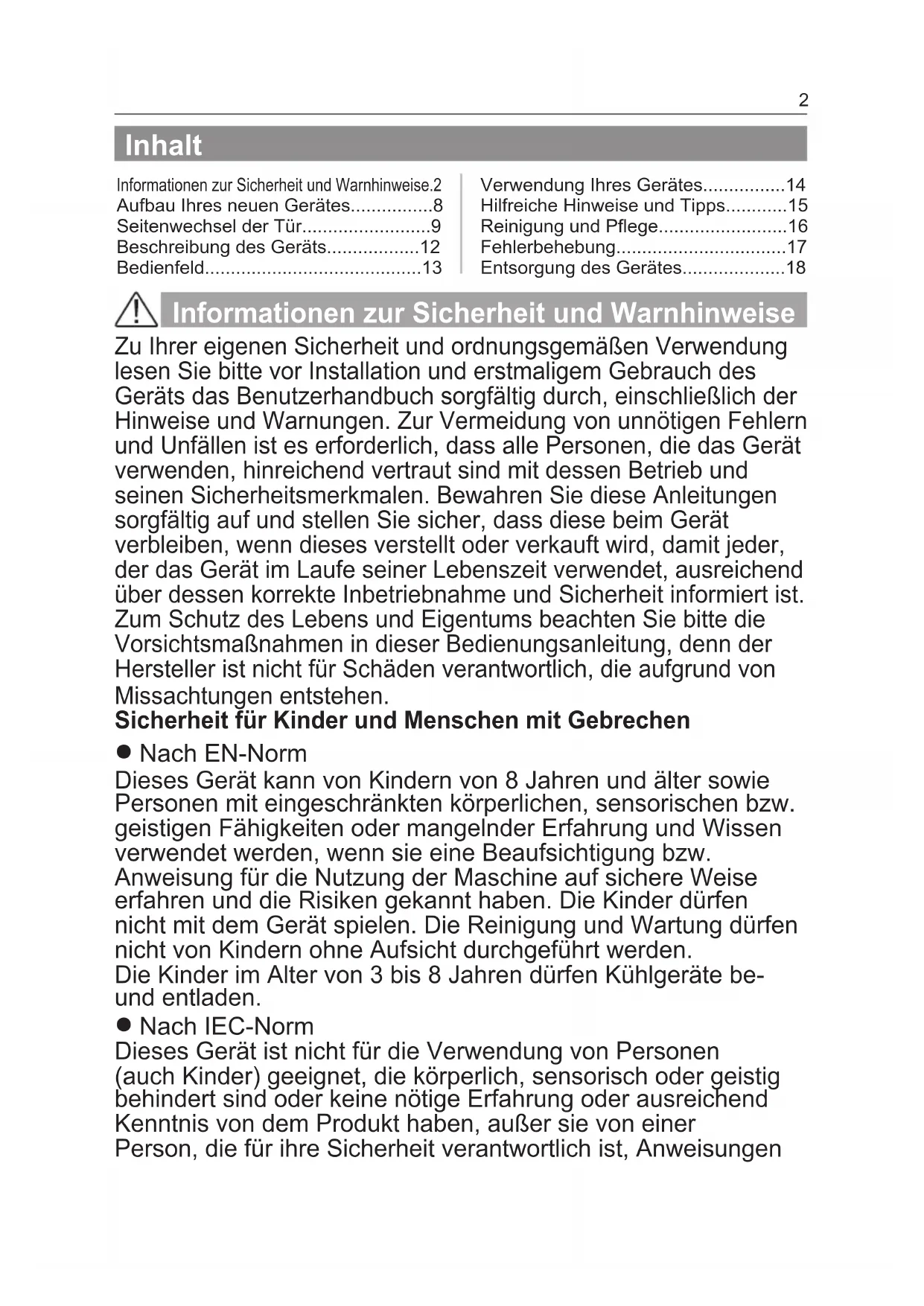 - Wenn Sie das Gerät, mit Magnettürverschluss, gegen eine ätheres Gerät mit Schnappschloss an der Tur oder dem Deckel austauschen, achten Sieitte daraufuf, das Schnappschloss unbrauchbar zu machen, bevorsies entsorgen. Dadurch wird die Gefahr vermieden, dass für Kinder daraus eine Todesfalle wird.