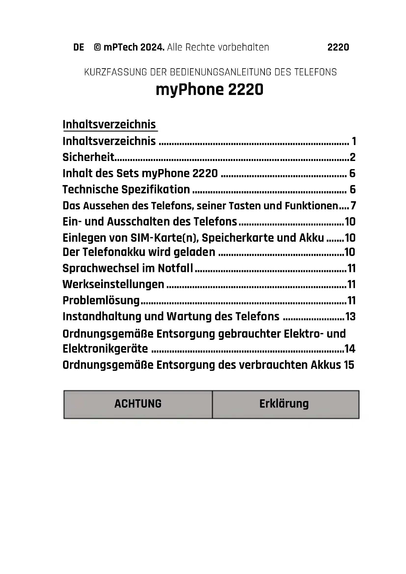 Kein Teil dieser Bedienungsanleitung darf ohne vorherige schriftliche Zustimmung des Herstellers in irgendeiner Form oder auf elektronischem oder mechanischem Wege reproduziert, verbreitet, übersetzt oder übertragen werden, einschließlich durch Erstellen von Fotokopien, Aufzeichnen oder Speichern in beliebigen Informationsspeicher- und -austauschsystemen. Vor der Verwendung des Geräts machen Sie sich mit den Informationen zu Vorsichtsmaßnahmen und mit der Bedienungsanleitung vertraut. Die Beschreibungen in dieser Bedienungsanleitung werden die Standardeinstellungen des Telefons berücksichtigt. Die neueste und vollständige Version des Bedienungsanleitung finden Sie auf der Website: www.myphone.pl/qr/myphone-2220 Je nach Netzbetreiber, installierter Softwareversion, Applikationen, SIM-Karte oder Land kann es vorkommen, dass einige Beschreibungen in der Anleitung nicht mit den Telefonfunktionen übereinstimmen.DE © mPTech 2024. Alle Rechte vorbehalten 2220 Sicherheit —FAHRZEUGE FAHREN— Verwenden Sie das Gerät nicht, während Sie ein Fahrzeug führen.