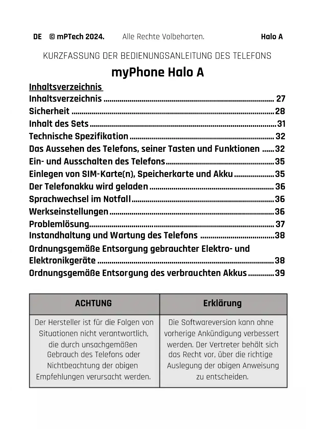 - Ordnungsgemäße Entsorgung des verbrauchten Akkus ACHTUNG Erklärung Der Hersteller ist für die Folgen von Situationen nicht verantwortlich, die durch unsachgemäßen Gebrauch des Telefons oder Nichtbeachtung der obigen Empfehlungen verursacht werden. Die Softwareversion kann ohne vorherige Ankündigung verbessert werden. Der Vertreter behält sich das Recht vor, über die richtige Auslegung der obigen Anweisung zu entscheiden.DE © mPTech 2024. Alle Rechte Volbeharten. Halo A p. 39