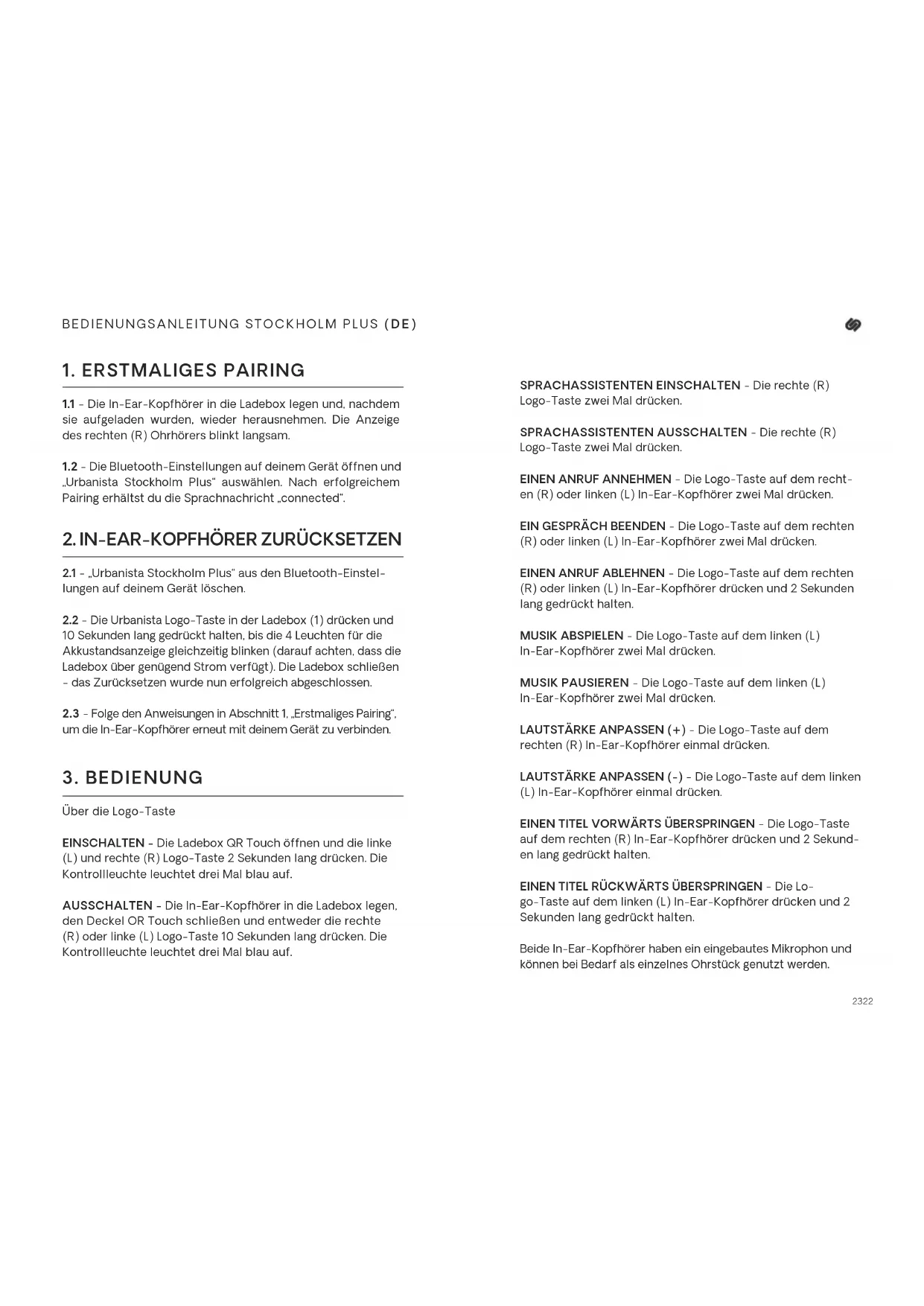 Über die Logo-Taste EINSCHALTEN - Die Ladebox QR Touch öffnen und die linke (L) und rechte (R) Logo-Taste 2 Sekunden lang drücken. Die Kontrollleuchte leuchtet drei Mal blau auf. AUSSCHALTEN - Die In-Ear-Kopfhörer in die Ladebox legen, den Deckel OR Touch schließen und entweder die rechte (R) oder linke (L) Logo-Taste 10 Sekunden lang drücken. Die Kontrollleuchte leuchtet drei Mal blau auf. SPRACHASSISTENTEN EINSCHALTEN - Die rechte (R) Logo-Taste zwei Mal drücken. SPRACHASSISTENTEN AUSSCHALTEN - Die rechte (R) Logo-Taste zwei Mal drücken. EINEN ANRUF ANNEHMEN - Die Logo-Taste auf dem recht- en (R) oder linken (L) In-Ear-Kopfhörer zwei Mal drücken. EIN GESPRÄCH BEENDEN - Die Logo-Taste auf dem rechten (R) oder linken (L) In-Ear-Kopfhörer zwei Mal drücken. EINEN ANRUF ABLEHNEN - Die Logo-Taste auf dem rechten (R) oder linken (L) In-Ear-Kopfhörer drücken und 2 Sekunden lang gedrückt halten. MUSIK ABSPIELEN - Die Logo-Taste auf dem linken (L) In-Ear-Kopfhörer zwei Mal drücken. MUSIK PAUSIEREN - Die Logo-Taste auf dem linken (L) In-Ear-Kopfhörer zwei Mal drücken. LAUTSTÄRKE ANPASSEN (+) - Die Logo-Taste auf dem rechten (R) In-Ear-Kopfhörer einmal drücken. LAUTSTÄRKE ANPASSEN (-) - Die Logo-Taste auf dem linken (L) In-Ear-Kopfhörer einmal drücken. EINEN TITEL VORWÄRTS ÜBERSPRINGEN - Die Logo-Taste auf dem rechten (R) In-Ear-Kopfhörer drücken und 2 Sekund- en lang gedrückt halten. EINEN TITEL RÜCKWÄRTS ÜBERSPRINGEN - Die Lo- go-Taste auf dem linken (L) In-Ear-Kopfhörer drücken und 2 Sekunden lang gedrückt halten. Beide In-Ear-Kopfhörer haben ein eingebautes Mikrophon und können bei Bedarf als einzelnes Ohrstück genutzt werden.2524 BEDIENUNGSANLEITUNG STOCKHOLM PLUS (DE) AKKUSTAND: 0-25 %: Eine Leuchte leuchtet 26-50 %: Zwei Leuchten leuchten 51-75 %: Drei Leuchten leuchten 76-100 %: Vier Leuchten leuchten DIE LADEBOX AUFLADEN - Um die Ladebox aufzuladen, das Typ C USB-Kabel an eine Stromquelle anschließen. 0-25 %: Eine Leuchte blinkt 26-50 %: Die erste Leuchte leuchtet konstant, die zweite Leuchte blinkt 51-75 %: Die ersten zwei Leuchten leuchten konstant, die dritte Leuchte blinkt 76-100 %: Die ersten drei Leuchten leuchten konstant, die vierte Leuchte blinkt 100 %: Dauerlicht Wenn die Leuchten für die Akkustandsanzeige nicht wie beschrie- ben funktionieren, das Ladegerät von der Ladebox trennen und er- neut verbinden. WARNUNG NIEDRIGER AKKUSTAND - Wenn dein Akkuladestand zu Ende geht, ertönt ein Piepton und es verbleiben noch 15 Minuten Abspielzeit, bis die In-Ear-Kopfhörer automatisch ausschalten. GARANTIE