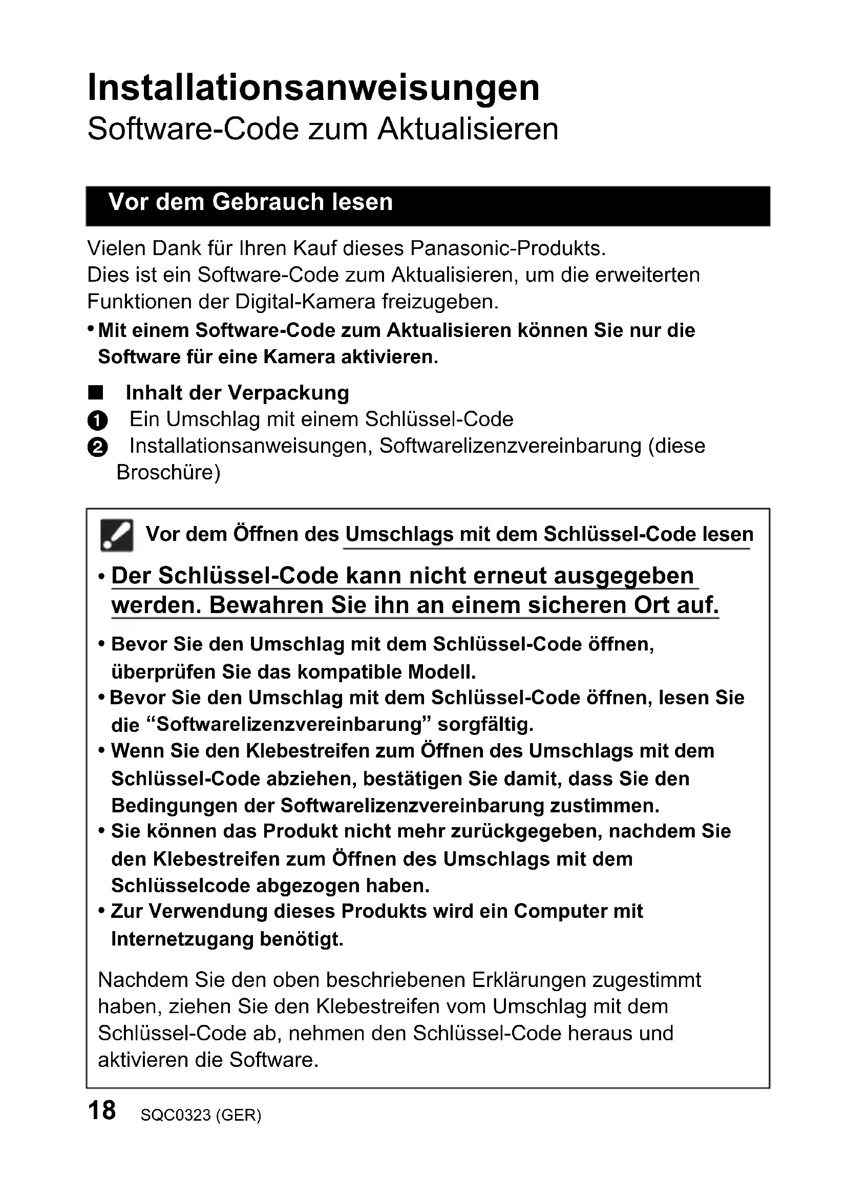 Mit einem Software-Code zum Aktualisieren können Sie nur die Software für eine Kamera aktivieren. ∫ Inhalt der Verpackung 1 Ein Umschlag mit einem Schlüssel-Code 2 Installationsanweisungen, Softwarelizenzvereinbarung (diese Broschüre) Vor dem Gebrauch lesen Vor dem Öffnen des Umschlags mit dem Schlüssel-Code lesen