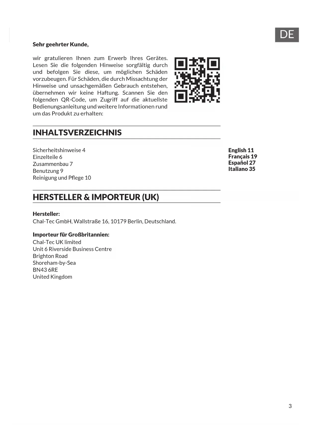 Sehr geehrter Kunde, wir gratulieren Ihnen zum Erwerb Ihres Gerätes. Lesen Sie die folgenden Hinweise sorgfältig durch und befolgen Sie diese, um möglichen Schäden vorzubeugen. Für Schäden, die durch Missachtung der Hinweise und unsachgemäßen Gebrauch entstehen, übernehmen wir keine Haftung. Scannen Sie den folgenden QR-Code, um Zugriff auf die aktuellste Bedienungsanleitung und weitere Informationen rund um das Produkt zu erhalten: INHALTSVERZEICHNIS Sicherheitshinweise 4 Einzelteile 6 Zusammenbau 7 Benutzung 9 Reinigung und Pege 10 HERSTELLER & IMPORTEUR (UK) Hersteller: Chal-Tec GmbH, Wallstraße 16, 10179 Berlin, Deutschland. Importeur für Großbritannien: Chal-Tec UK limited Unit 6 Riverside Business Centre Brighton Road Shoreham-by-Sea BN43 6RE United Kingdom English 11 Français 19 Español 27 Italiano 354