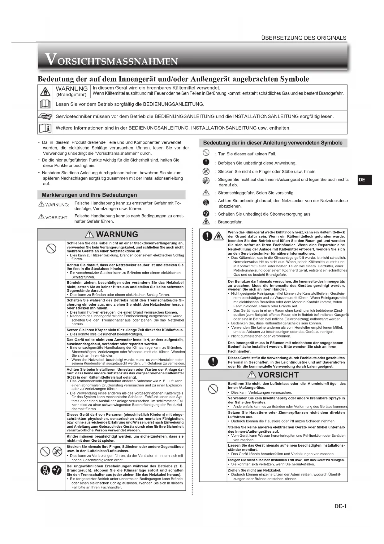 - Da in diesem Produkt drehende Teile und und Komponenten verwendet werden, die elektrische Schläge verursachen können, lesen Sie vor der Verwendung unbedingt die “Vorsichtsmaßnahmen” durch.• Da die hier aufgeführten Punkte wichtig für die Sicherheit sind, halten Sie diese Punkte unbedingt ein.• Nachdem Sie diese Anleitung durchgelesen haben, bewahren Sie sie zum späteren Nachschlagen sorgfältig zusammen mit der Installationsanleitung auf. Markierungen und ihre Bedeutungen WARNUNG:Falsche Handhabung kann zu ernsthafter Gefahr mit To-desfolge, Verletzungen usw. führen. VORSICHT:Falsche Handhabung kann je nach Bedingungen zu ernst-hafter Gefahr führen. Bedeutung der in dieser Anleitung verwendeten Symbole : Tun Sie dieses auf keinen Fall. : Befolgen Sie unbedingt diese Anweisung. : Stecken Sie nicht die Finger oder Stäbe usw. hinein. : Steigen Sie nicht auf das Innen-/Außengerät und legen Sie auch nichts darauf ab. : Stromschlaggefahr. Seien Sie vorsichtig. : Achten Sie unbedingt darauf, den Netzstecker von der Netzsteckdose abzuziehen. : Schalten Sie unbedingt die Stromversorgung aus. : Brandgefahr. VORSICHTSMASSNAHMEN Bedeutung der auf dem Innengerät und/oder Außengerät angebrachten Symbole WARNUNG (Brandgefahr)In diesem Gerät wird ein brennbares Kältemittel verwendet. Wenn Kältemittel austritt und mit Feuer oder heißen Teilen in Berührung kommt, entsteht schädliches Gas und es besteht Brandgefahr. Lesen Sie vor dem Betrieb sorgfältig die BEDIENUNGSANLEITUNG.Servicetechniker müssen vor dem Betrieb die BEDIENUNGSANLEITUNG und die INSTALLATIONSANLEITUNG sorgfältig lesen.Weitere Informationen sind in der BEDIENUNGSANLEITUNG, INSTALLATIONSANLEITUNG usw. enthalten. WARNUNG Schließen Sie das Kabel nicht an einer Steckdosenverlängerung an, verwenden Sie kein Verlängerungskabel, und schließen Sie auch nicht mehrere Geräte an einer Netzsteckdose an.• Dies kann zu Hitzeentwicklung, Bränden oder einem elektrischen Schlag führen.Achten Sie darauf, dass der Netzstecker sauber ist und stecken Sie ihn fest in die Steckdose hinein.• Ein verschmutzter Stecker kann zu Bränden oder einem elektrischen Schlag führen.Bündeln, ziehen, beschädigen oder verändern Sie das Netzkabel nicht, setzen Sie es keiner Hitze aus und stellen Sie keine schweren Gegenstände darauf.• Dies kann zu Bränden oder einem elektrischen Schlag führen.Schalten Sie während des Betriebs nicht den Trennschalter/die Si-cherung ein oder aus, und ziehen Sie nicht den Netzstecker heraus oder stecken ihn hinein.• Dies kann Funken erzeugen, die einen Brand verursachen können.• Nachdem das Innengerät mit der Fernbedienung ausgeschaltet wurde, schalten Sie den Trennschalter aus oder ziehen Sie das Netzkabel heraus. Setzen Sie Ihren Körper nicht für zu lange Zeit direkt der Kühlluft aus.• Dies könnte Ihre Gesundheit beeinträchtigen.Das Gerät sollte nicht vom Anwender installiert, anders aufgestellt, auseinandergebaut, verändert oder repariert werden.• Eine unsachgemäße Handhabung der Klimaanlage kann zu Bränden, Stromschlägen, Verletzungen oder Wasseraustritt etc. führen. Wenden Sie sich an Ihren Händler. Wenn das Netzkabel beschädigt wurde, muss es vom Hersteller oder seinem Kundendienst ausgetauscht werden, um Gefahren zu vermeiden.Achten Sie beim Installieren, Umsetzen oder Warten der Anlage da-rauf, dass keine andere Substanz als das vorgeschriebene Kältemittel (R32) in den Kältemittelkreislauf gelangt.• Das Vorhandensein irgendeiner anderen Substanz wie z. B. Luft kann einen abnormalen Druckanstieg verursachen und zu einer Explosion oder zu Verletzungen führen.• Die Verwendung eines anderen als des vorgeschriebenen Kältemittels für das System kann mechanische Schäden, Fehlfunktionen des Sys-tems oder einen Ausfall der Anlage verursachen. Im schlimmsten Fall kann dies zu einer schwerwiegenden Beeinträchtigung der Produktsi-cherheit führen.Dieses Gerät darf von Personen (einschließlich Kindern) mit einge-schränkten physischen, sensorischen oder mentalen Fähigkeiten, bzw. ohne ausreichende Erfahrung und Wissen, erst nach Einweisung und Anleitung zum Gebrauch des Geräts durch eine für ihre Sicherheit verantwortliche Person verwendet werden.Kinder müssen beaufsichtigt werden, um sicherzustellen, dass sie nicht mit dem Gerät spielen. Stecken Sie niemals Ihre Finger, Stäbchen oder andere Gegenstände usw. in den Lufteinlass/Luftauslass.• Dies kann zu Verletzungen führen, da der Ventilator im Innern sich mit hohen Geschwindigkeiten dreht. Bei ungewöhnlichen Erscheinungen während des Betriebs (z. B. Brandgeruch), stoppen Sie die Klimaanlage sofort und schalten Sie den Trennschalter aus (oder ziehen Sie das Netzkabel heraus).• Ein fortgesetzter Betrieb unter unnormalen Bedingungen kann Brände oder einen elektrischen Schlag auslösen. Wenden Sie sich in diesem Fall bitte an Ihren Fachhändler. Wenn das Klimagerät weder kühlt noch heizt, kann ein Kältemittelleck der Grund dafür sein. Wenn ein Kältemittelleck gefunden wurde, beenden Sie den Betrieb und lüften Sie den Raum gut und wenden Sie sich sofort an Ihren Fachhändler. Wenn eine Reparatur eine Neubefüllung der Anlage mit Kältemittel erfordert, wenden Sie sich an den Servicetechniker für nähere Informationen.• Das Kältemittel, das in die Klimaanlage gefüllt wurde, ist nicht schädlich. Normalerweise tritt es nicht aus. Wenn jedoch Kältemittel austritt und in Kontakt mit Feuer oder heißen Teilen wie einem Heizlüfter, einer Petroleumheizung oder einem Kochherd gerät, entsteht ein schädliches Gas und es besteht Brandgefahr.Der Benutzer darf niemals versuchen, die Innenseite des Innengeräts zu waschen. Muss die Innenseite des Gerätes gereinigt werden, wenden Sie sich an Ihren Händler.• Nicht geeignete Reinigungsmittel können die Kunststoffteile im Gerätein-nern beschädigen und zu Wasseraustritt führen. Wenn Reinigungsmittel mit elektrischen Bauteilen oder dem Motor in Kont